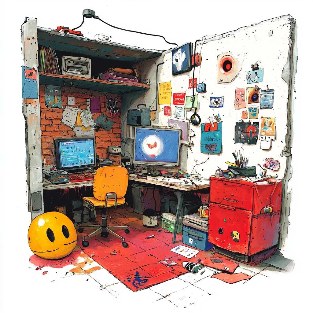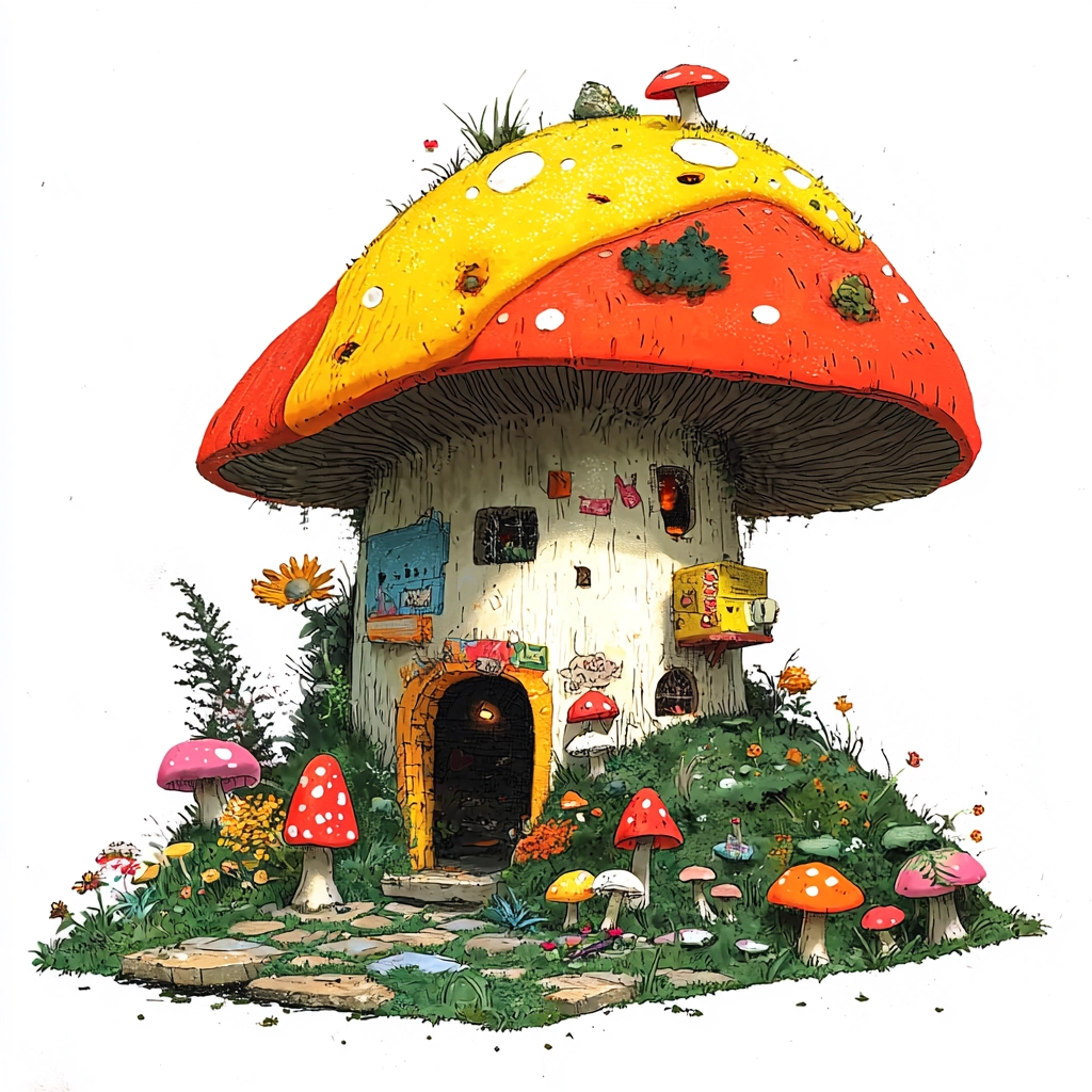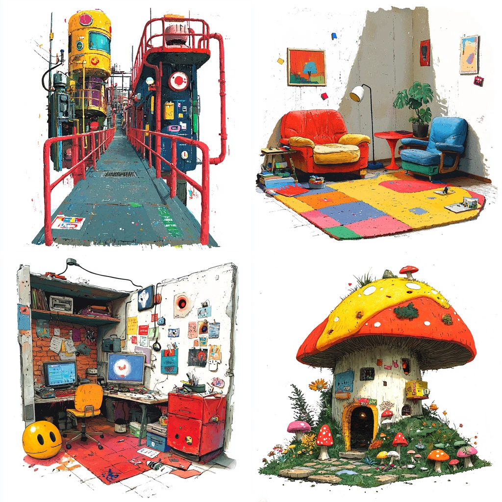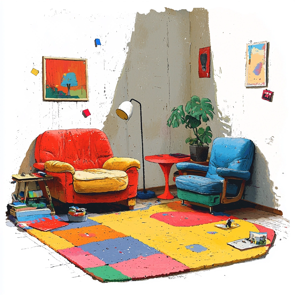 Strong lighting amplifies vivid colors and sets a lively tone. The perspective creates depth and immersion, while textures enhance the whimsical feel. Layered colors bring a sense of playful chaos.