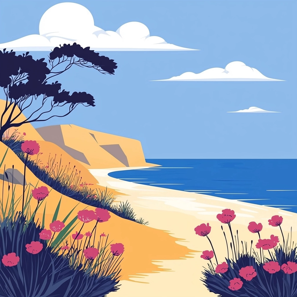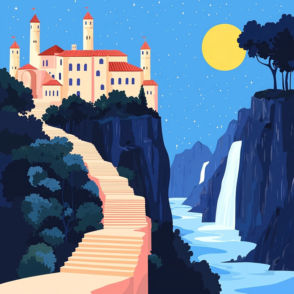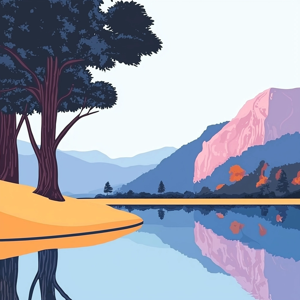 Bright lighting highlights vivid colors, while bold and flat shapes define the space, creating a clean and distinctive texture. The composition combines clear divisions and harmonious balance, directing focus smoothly across each scene.