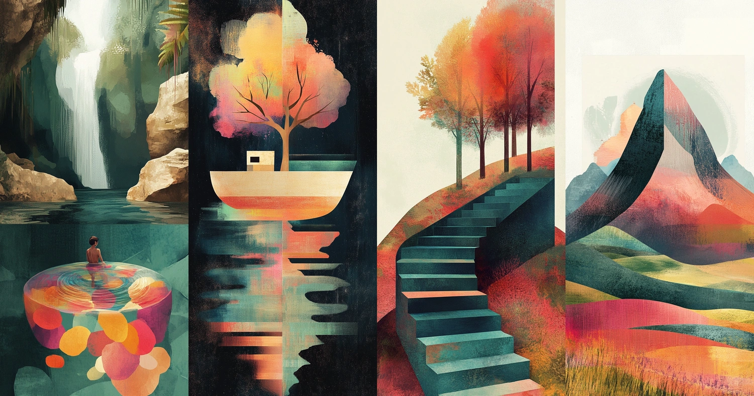 Bold lighting contrasts highlight the intense color gradients. The layered textures give a sense of depth and dimensionality. The color transitions blend smoothly, creating a visually engaging spatial effect.