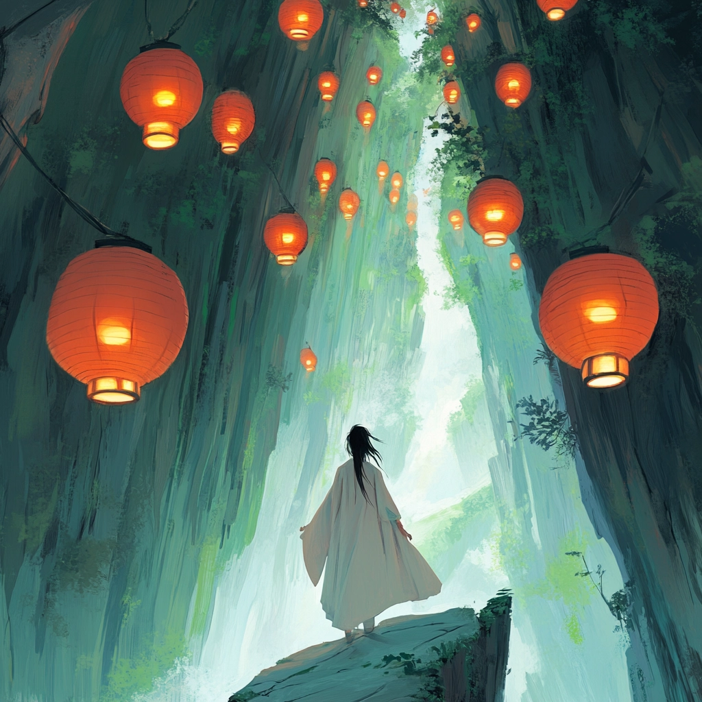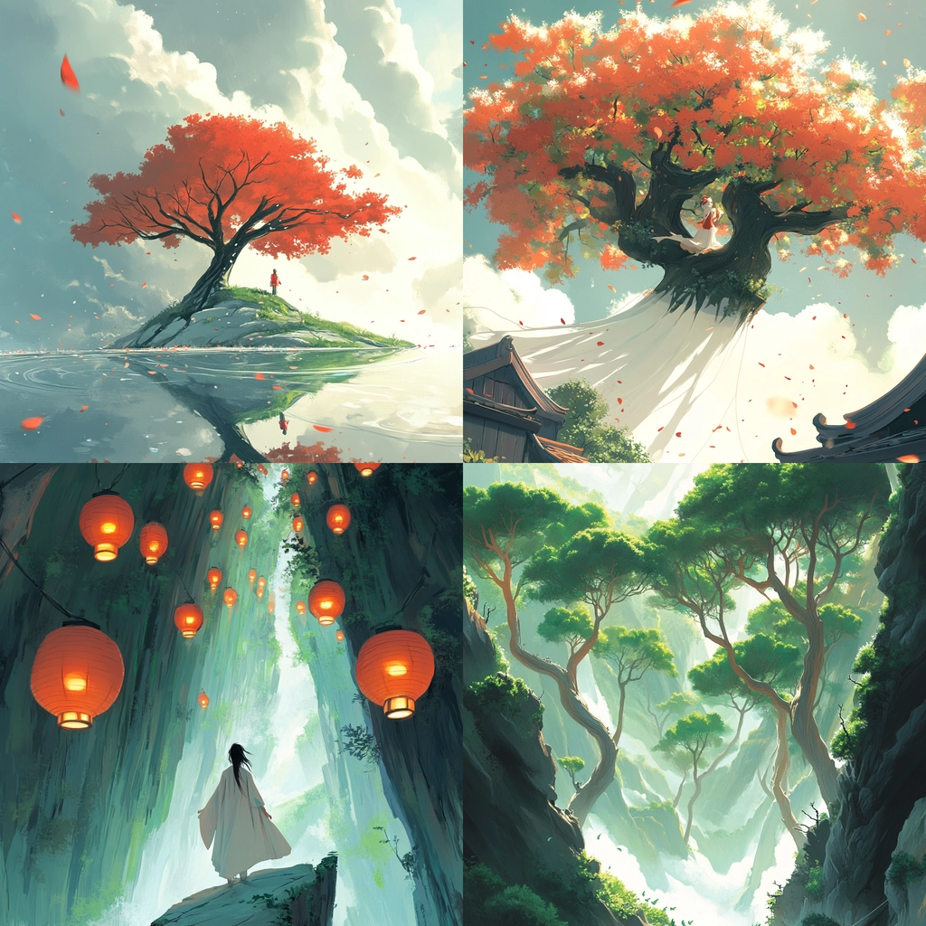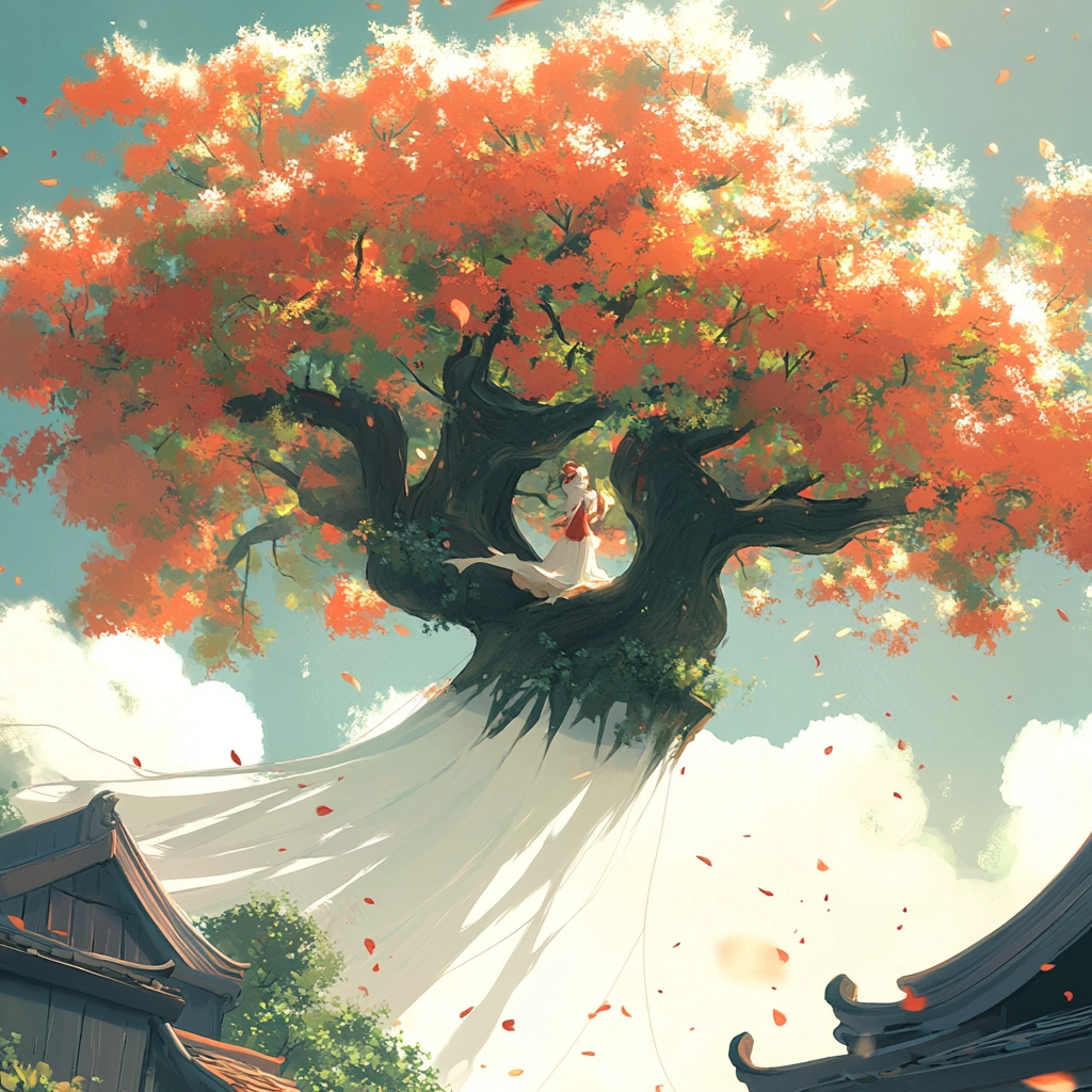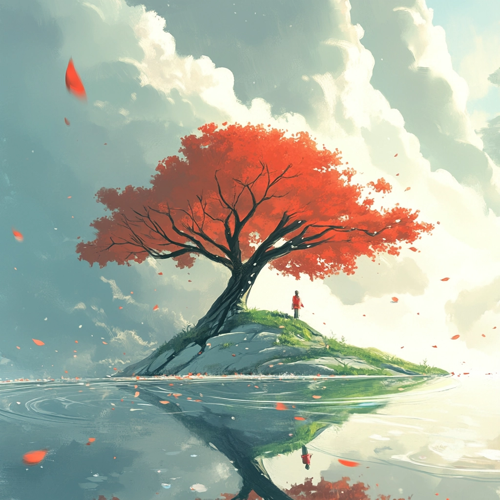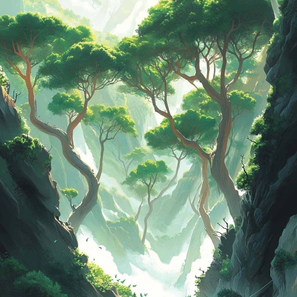 Bright illumination accentuates the vibrant hues of red, orange, and green, creating a sense of depth and a textured representation. The lighting plays a crucial role in defining spatial dimensions, enhancing the lush colors with warm and cool variations.