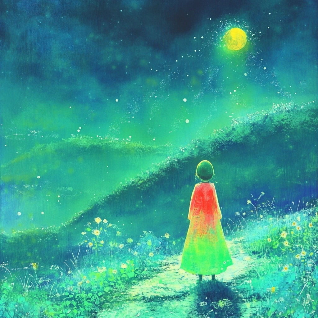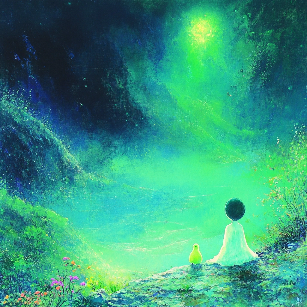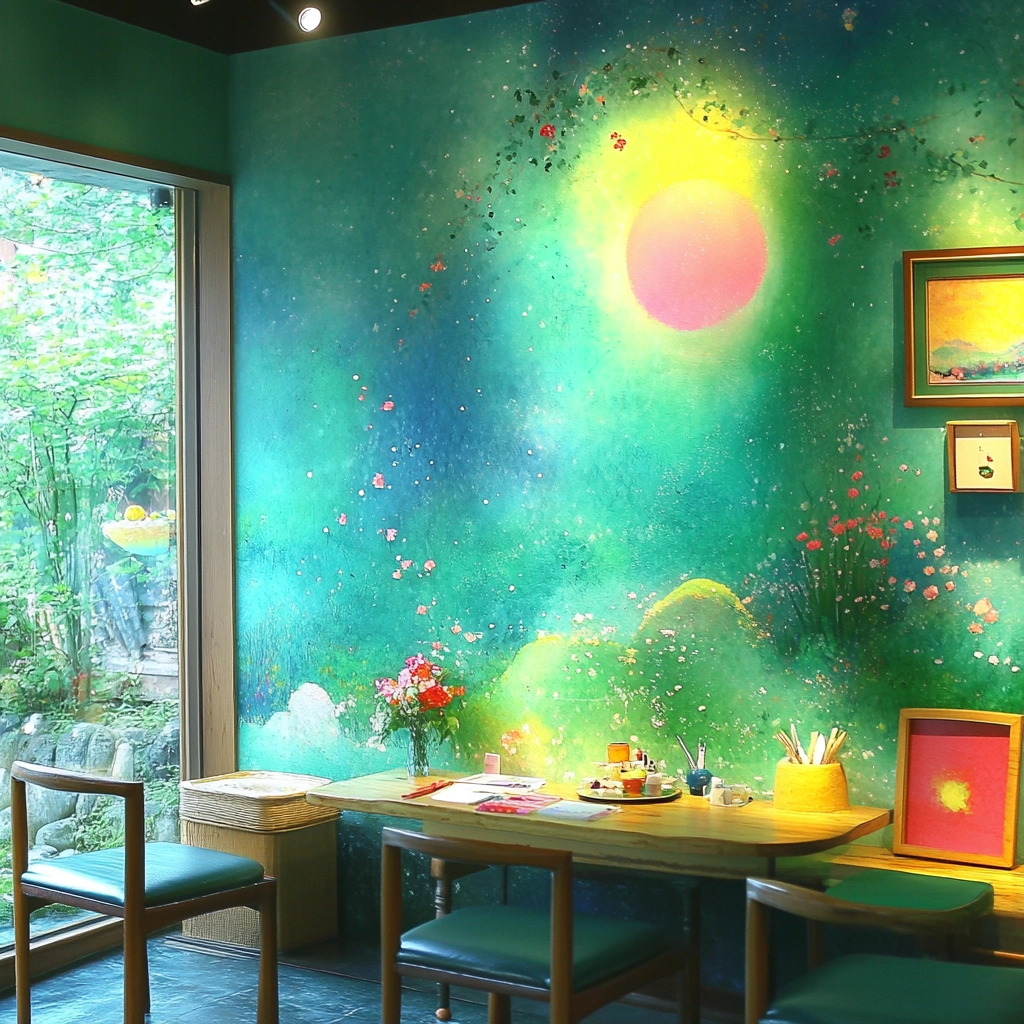 The lighting creates a glow effect with vibrant colors that blend smoothly across surfaces. Layers of colors depict depth, with texture suggesting a mix of soft and sharp elements in spatial arrangement.