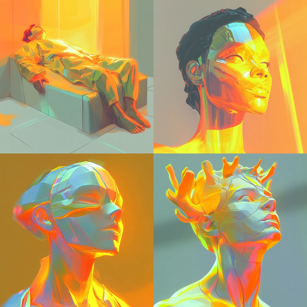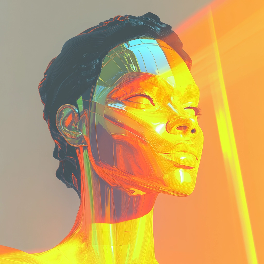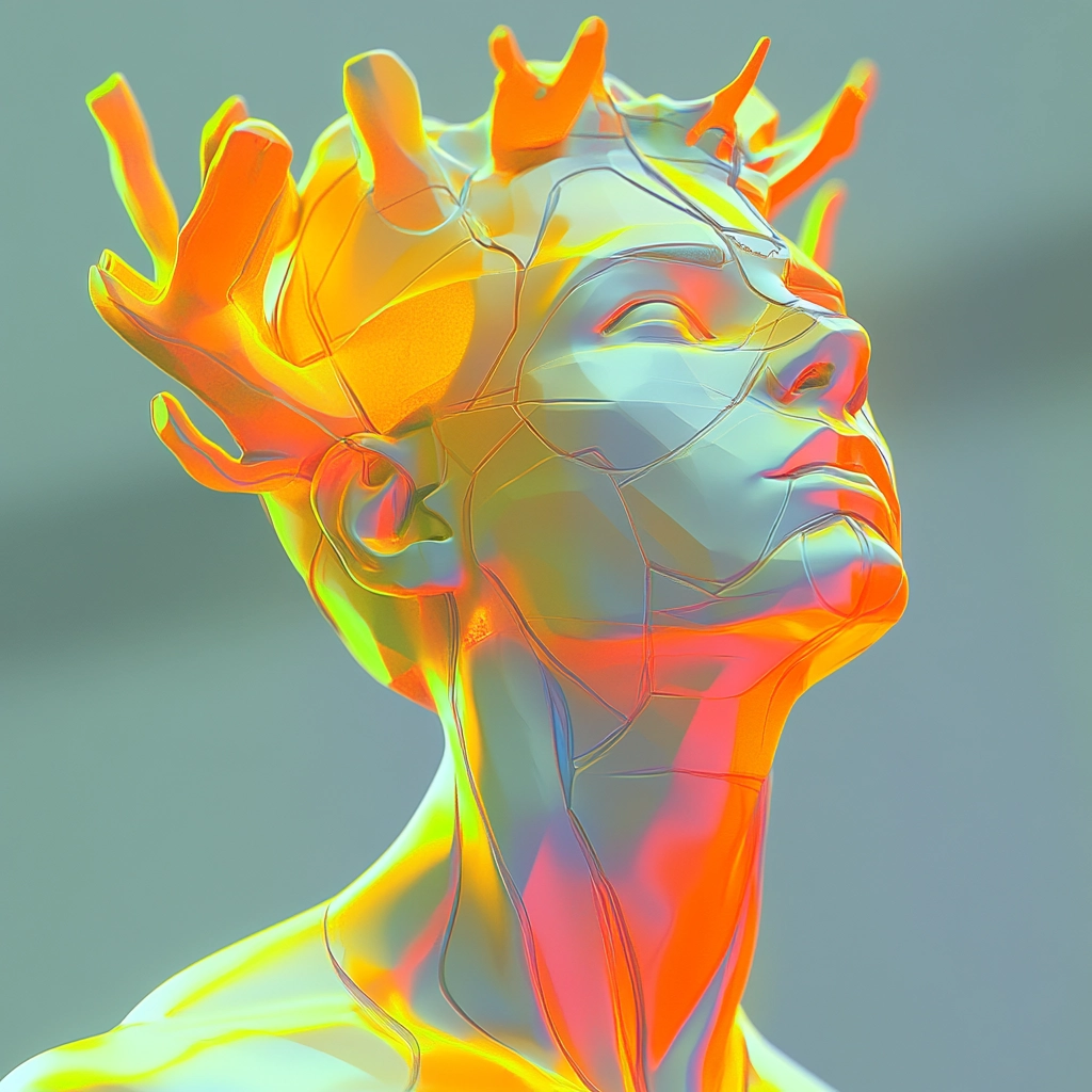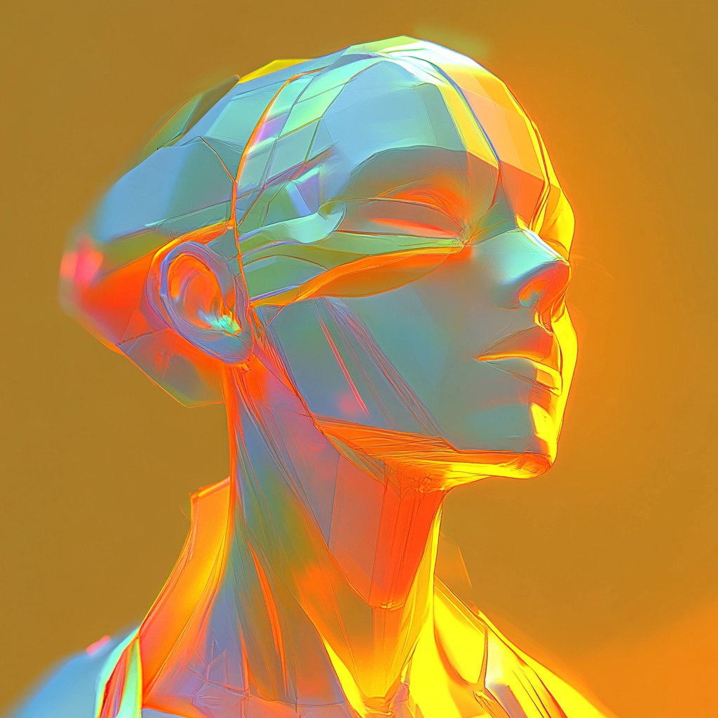 Strong lighting creating vibrant highlights and shadows, smooth color gradients accentuate forms, and a sense of luminosity gives depth and sculptural texture.