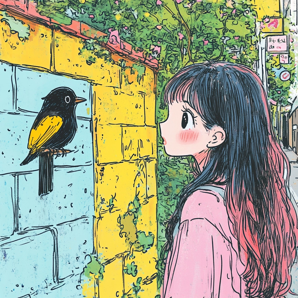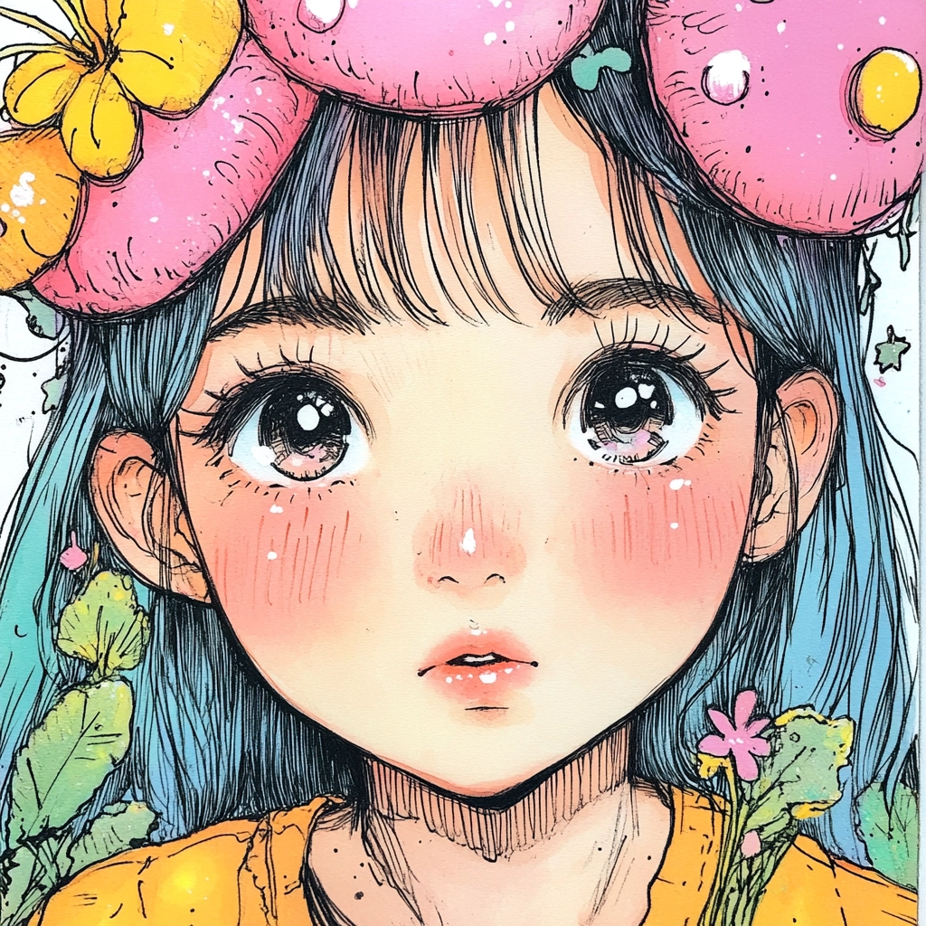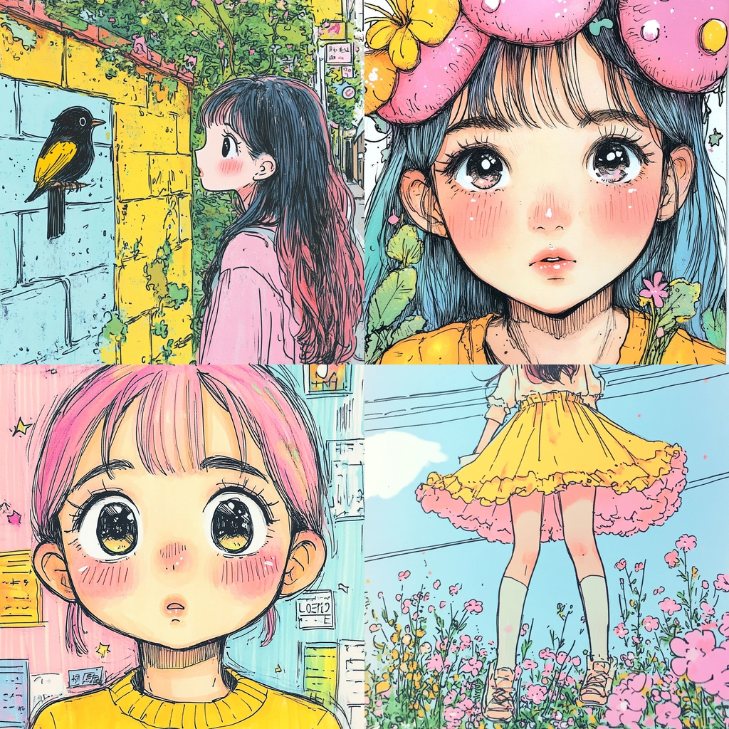 The artwork utilizes bold outlines and a vivid palette to emphasize details and textures, giving a sense of depth and liveliness. The pastel colors blend and contrast skillfully, creating dynamic compositions with a playful spirit, while lighting and shadows are applied to enhance the emotional vibrancy.