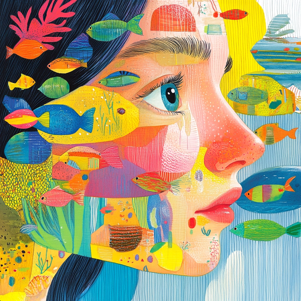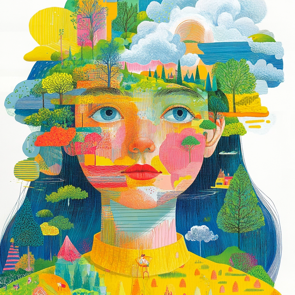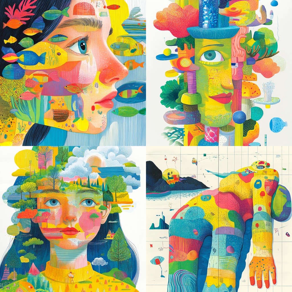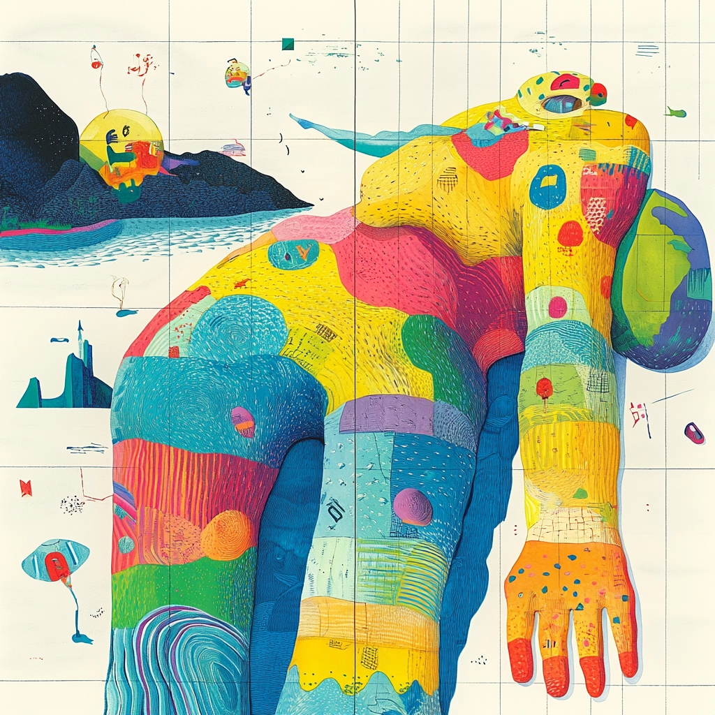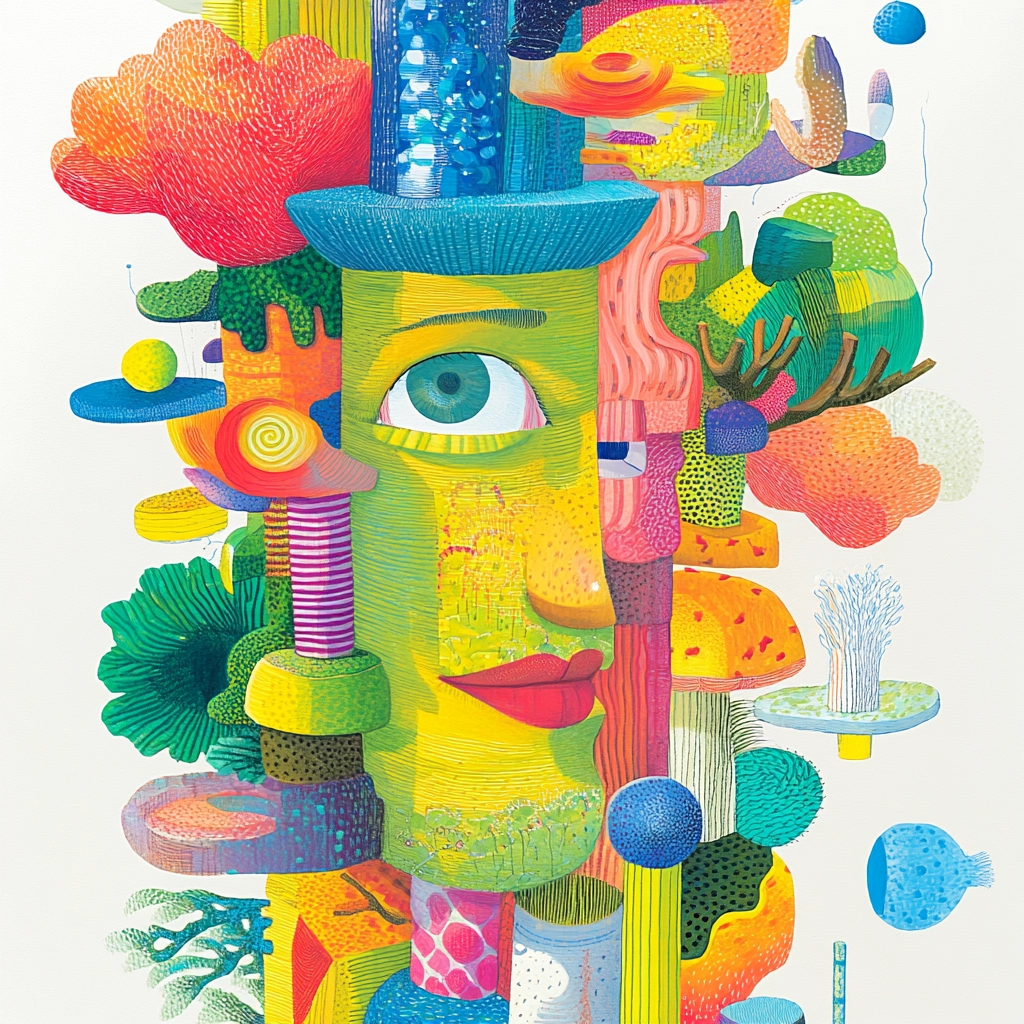 Bright lighting accentuates the vivid colors, while textures vary from smooth to highly detailed. The spatial arrangement creates a layered visual experience, with whimsical forms mimicking natural elements and vibrant geometric shapes.