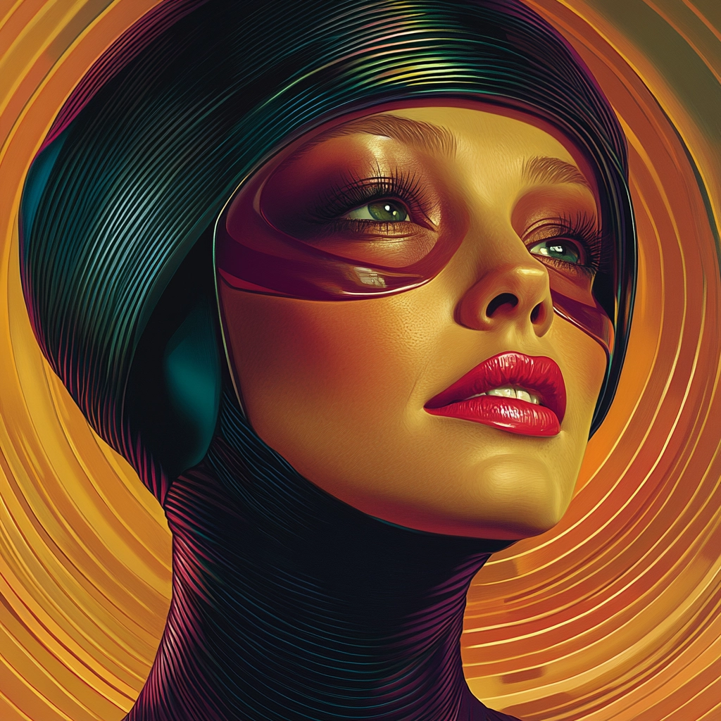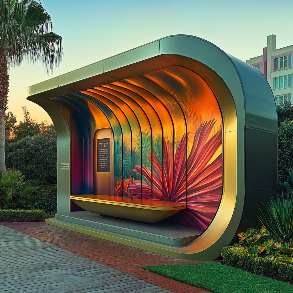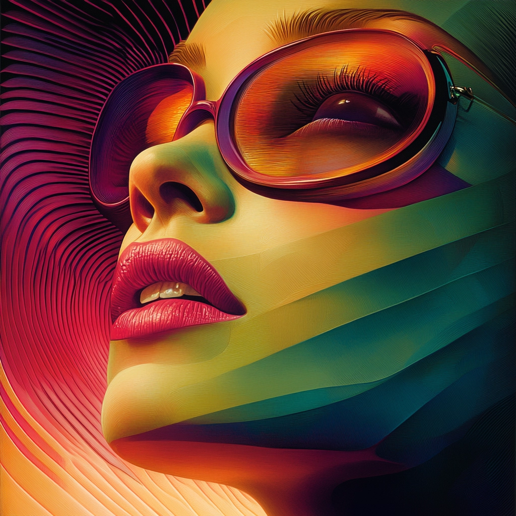 The bright, fluorescent lighting effects create a vivid visual impact, blending sharp shadows with soft gradients. Rich color saturation emphasizes the depth and contours of the forms, generating a textured, layered spatial dynamic with distinct curved lines.