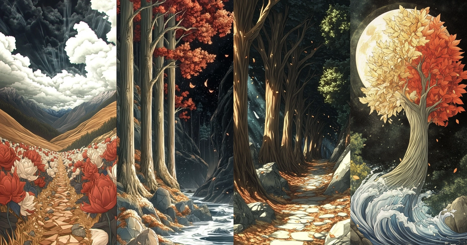 Lighting plays with contrasts, enhancing depth. Variations in red and brown offer warmth while dark blue adds depth and mystery. Textured strokes evoke the bark of trees and atmospheric dynamics.