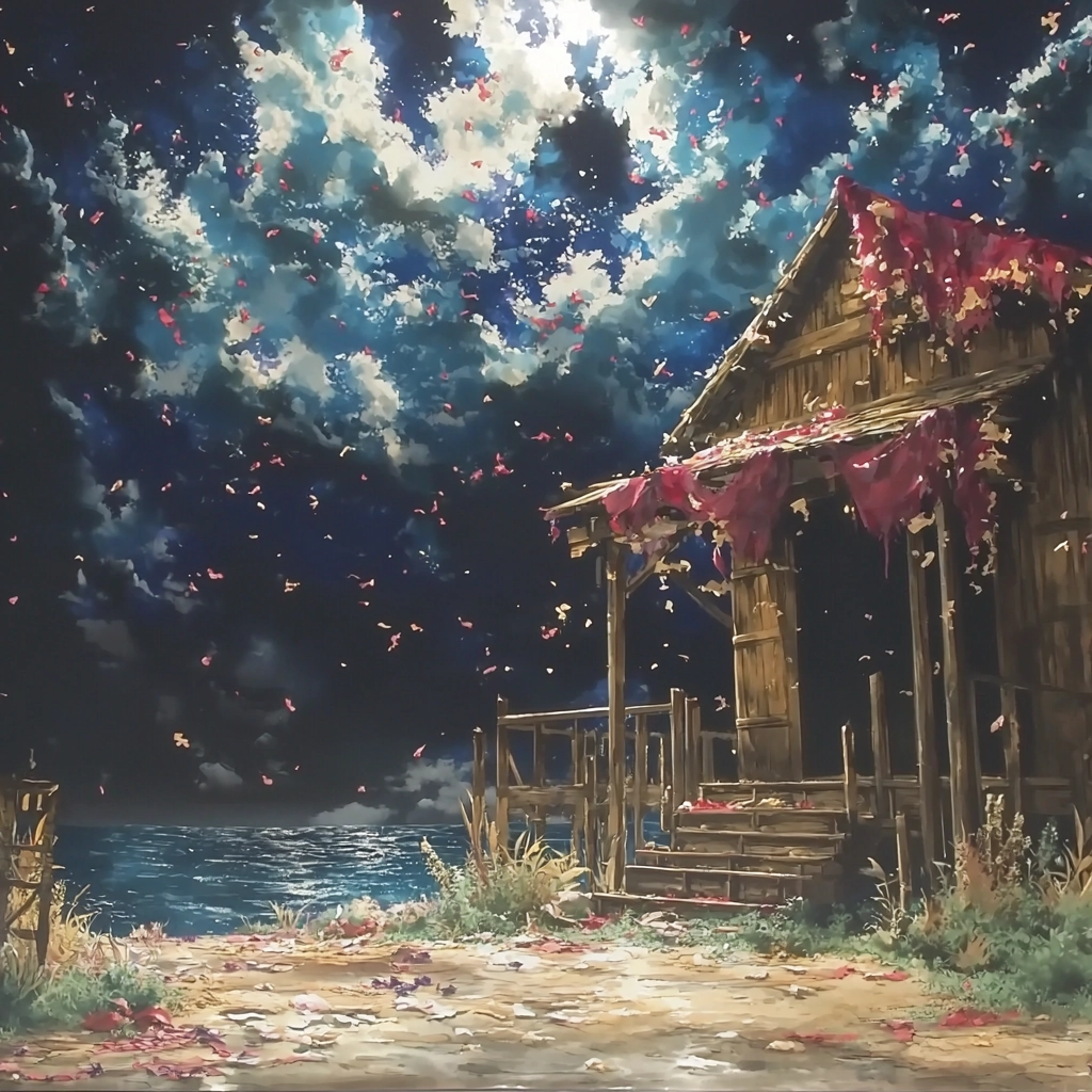 The lighting creates a dramatic interplay between shadowed areas and bright highlights, adding depth and texture. The vivid palette heightens contrasts between saturation and subtlety, while layered compositions evoke a sense of movement and narrative progression.