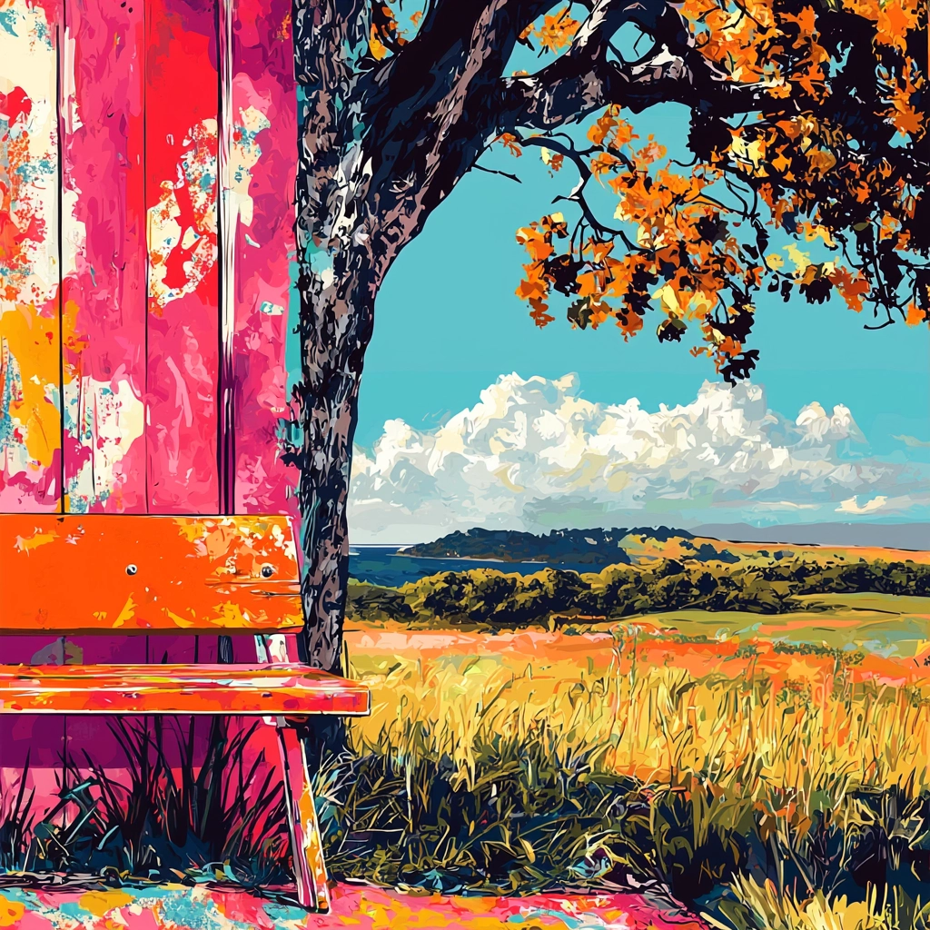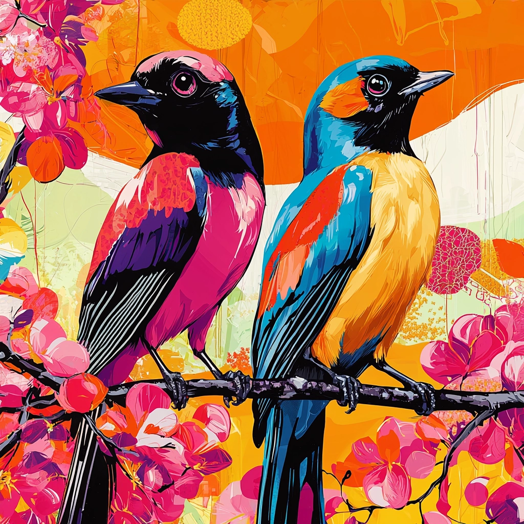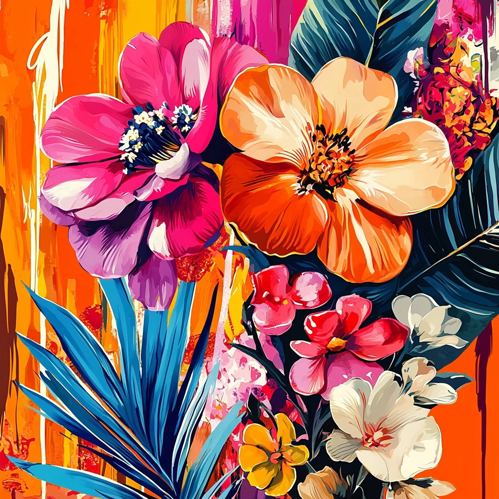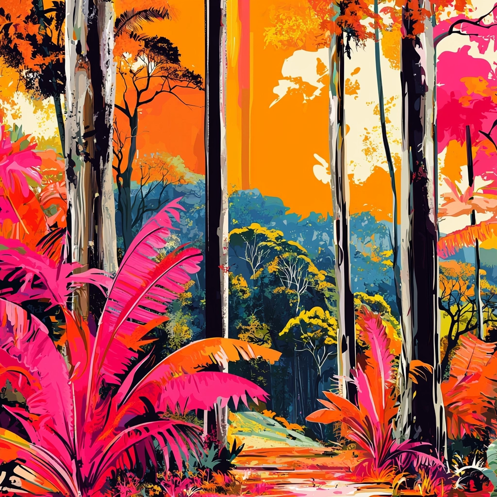 Intense, vibrant lighting effects heighten the vivid color palette, creating a sense of depth with contrasting hues. Detailed textures enhance the tactile elements, adding a lush, tangible quality to the visual experience.