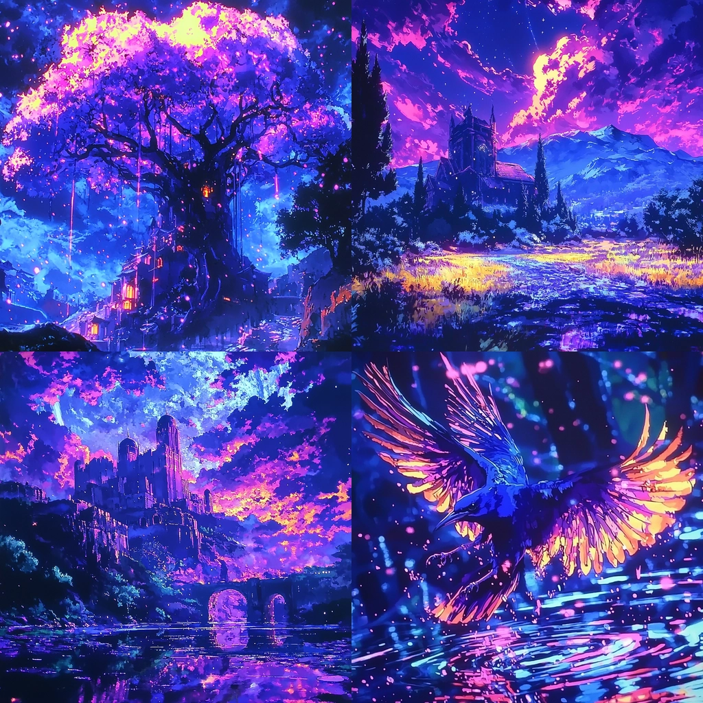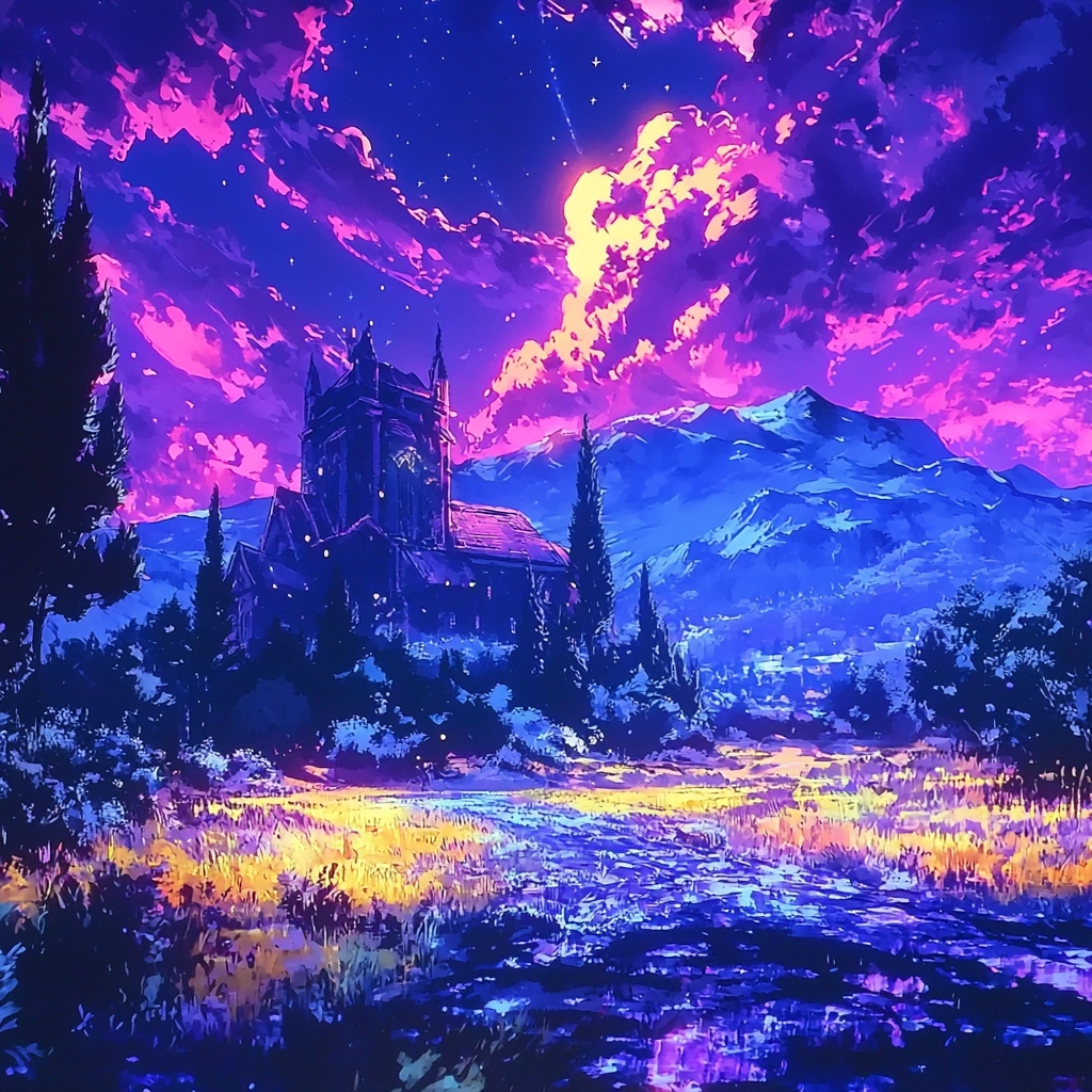 Intense purples and blues dominate with dynamic lighting contrasts.