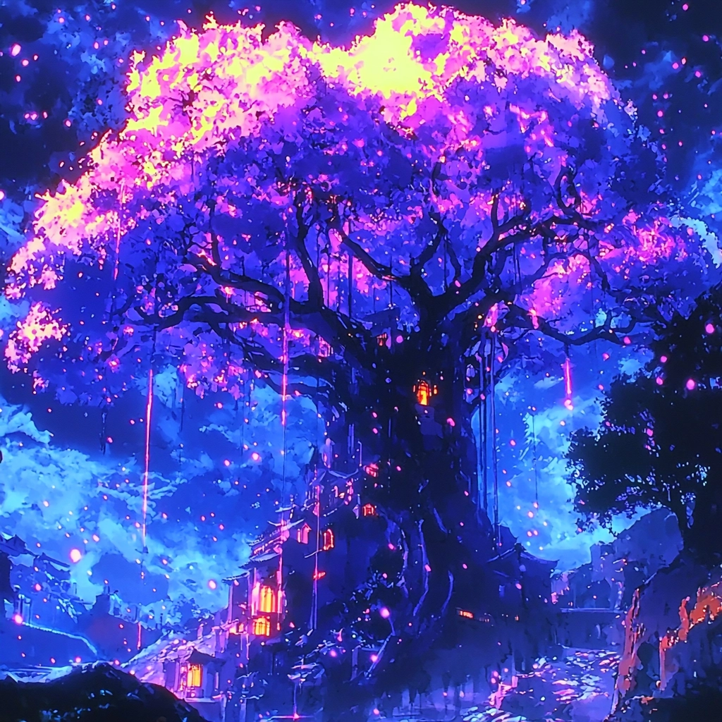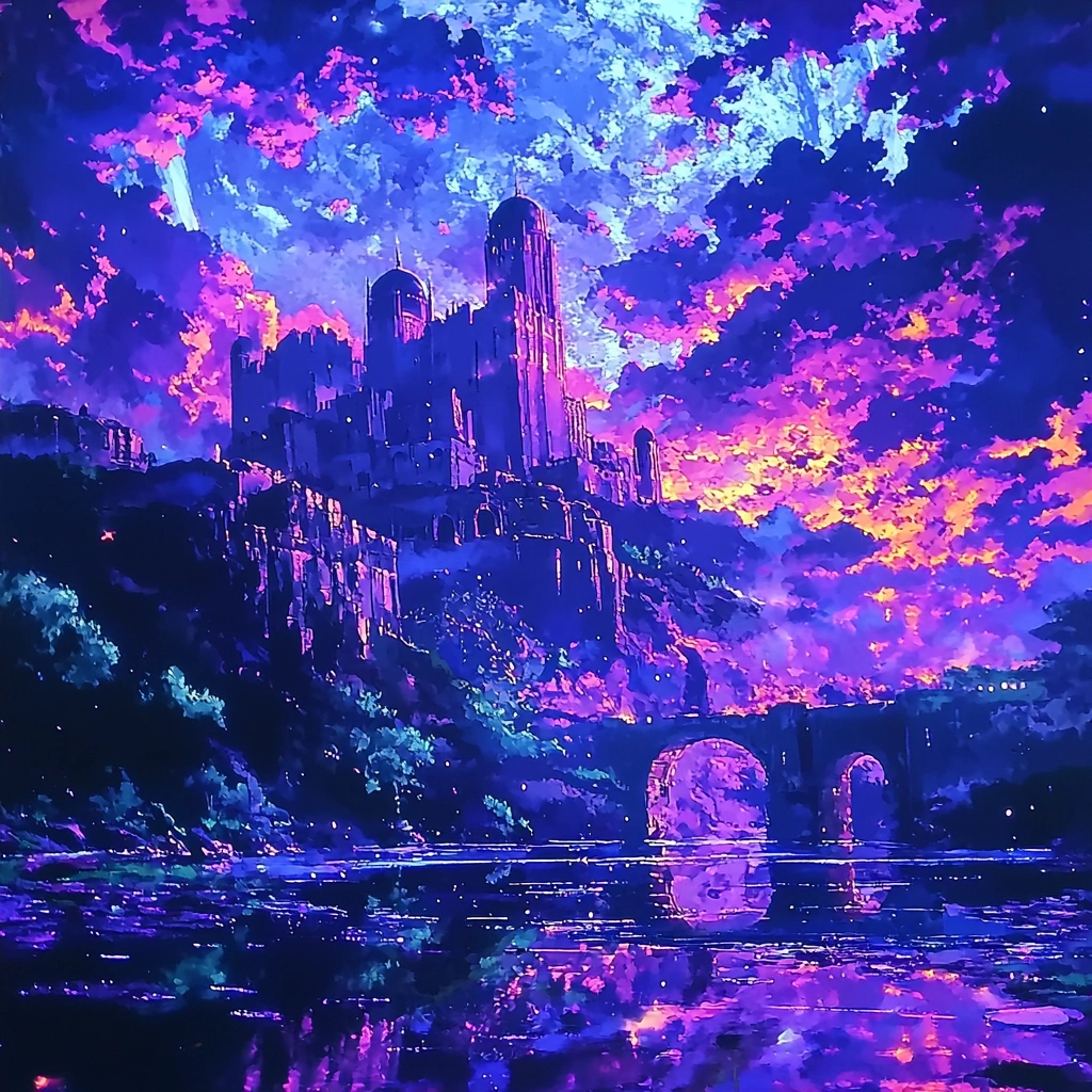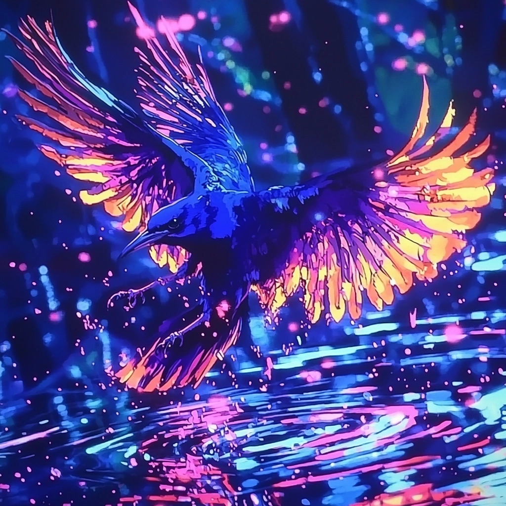 Bright neon lighting accentuates deep purples and blues, creating sharp contrasts. The textured strokes add depth and dynamism. Light reflects seemingly from multiple sources, producing vivid reflections and luminescent highlights.