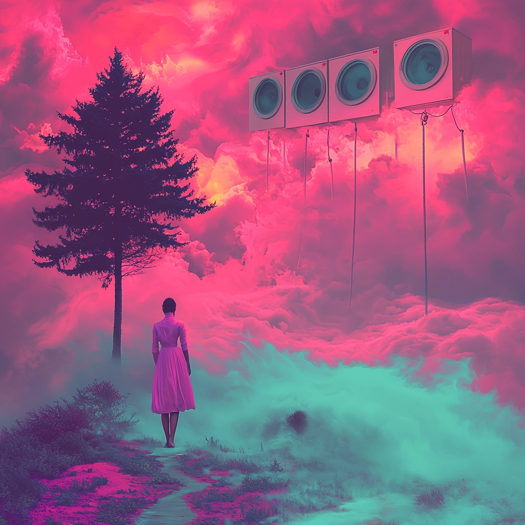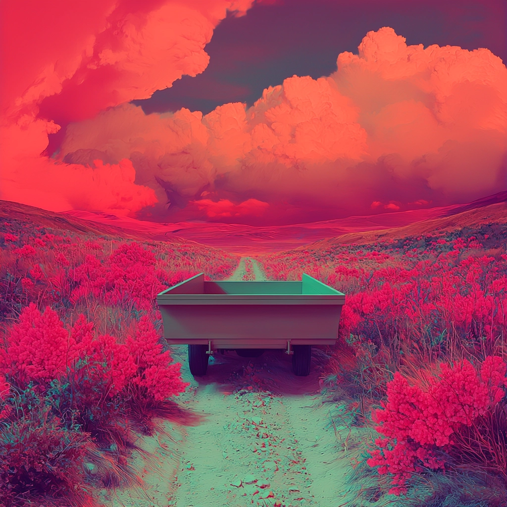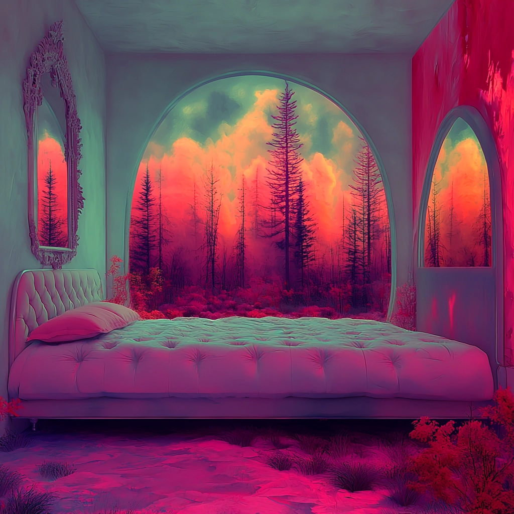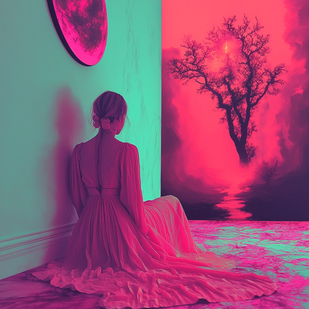 Lighting imbues the scene with dramatic shadows and highlights, enhancing depth perception. Neon pigments saturate sharply to induce focus. The spatial arrangement elongates perspectives, emphasizing a sense of vastness. Textures of landscapes are smooth and dynamic.