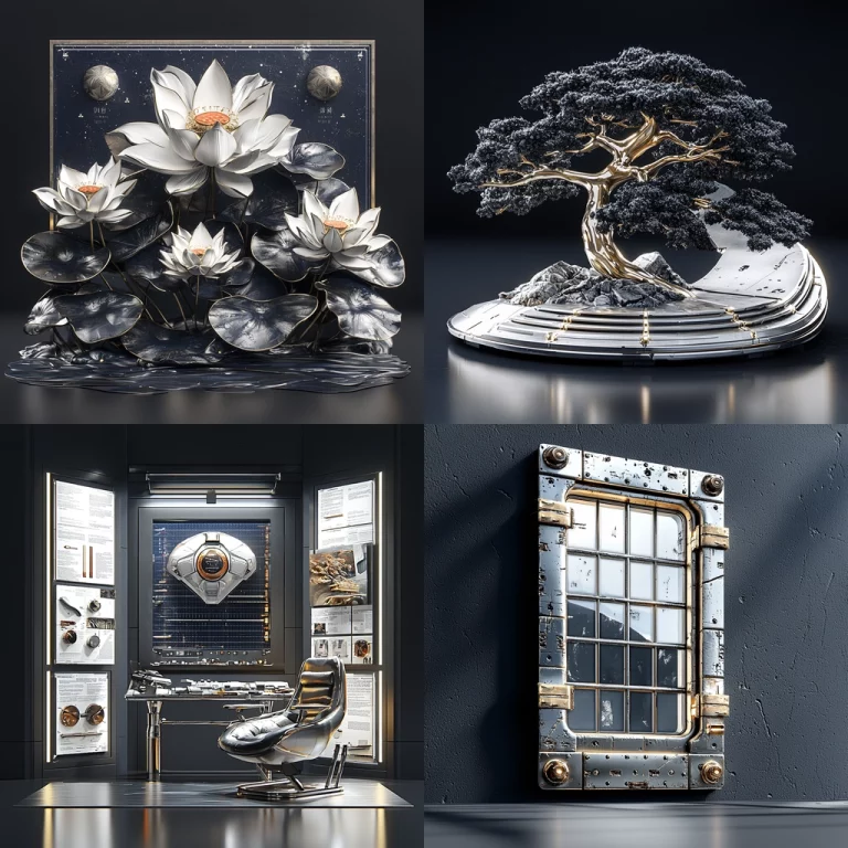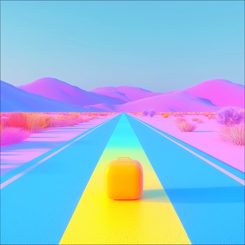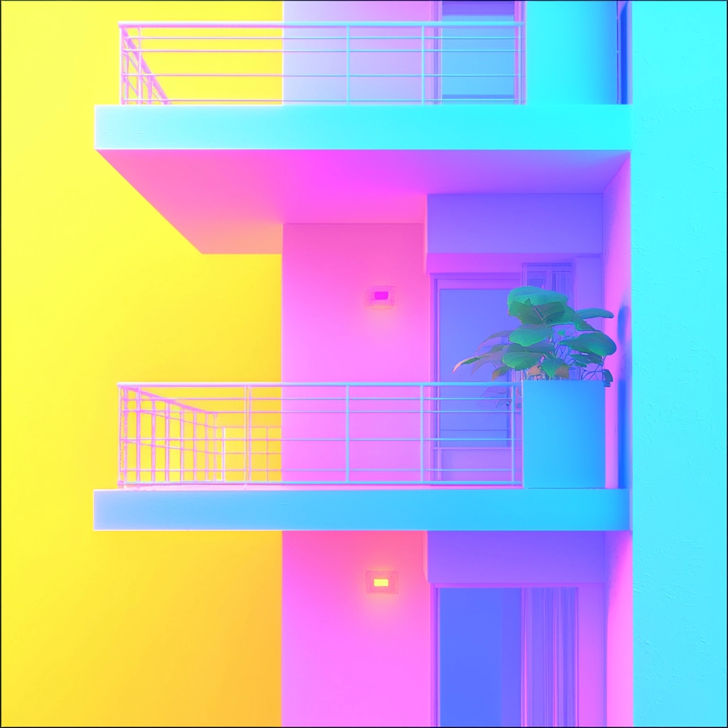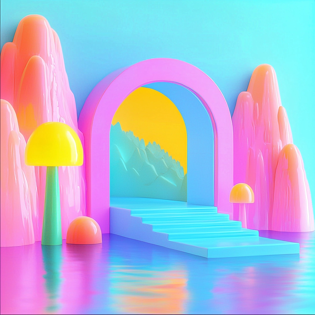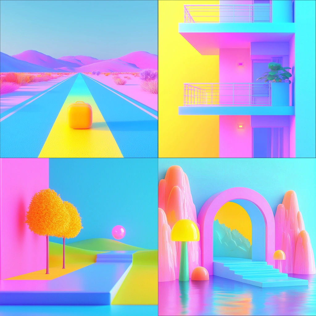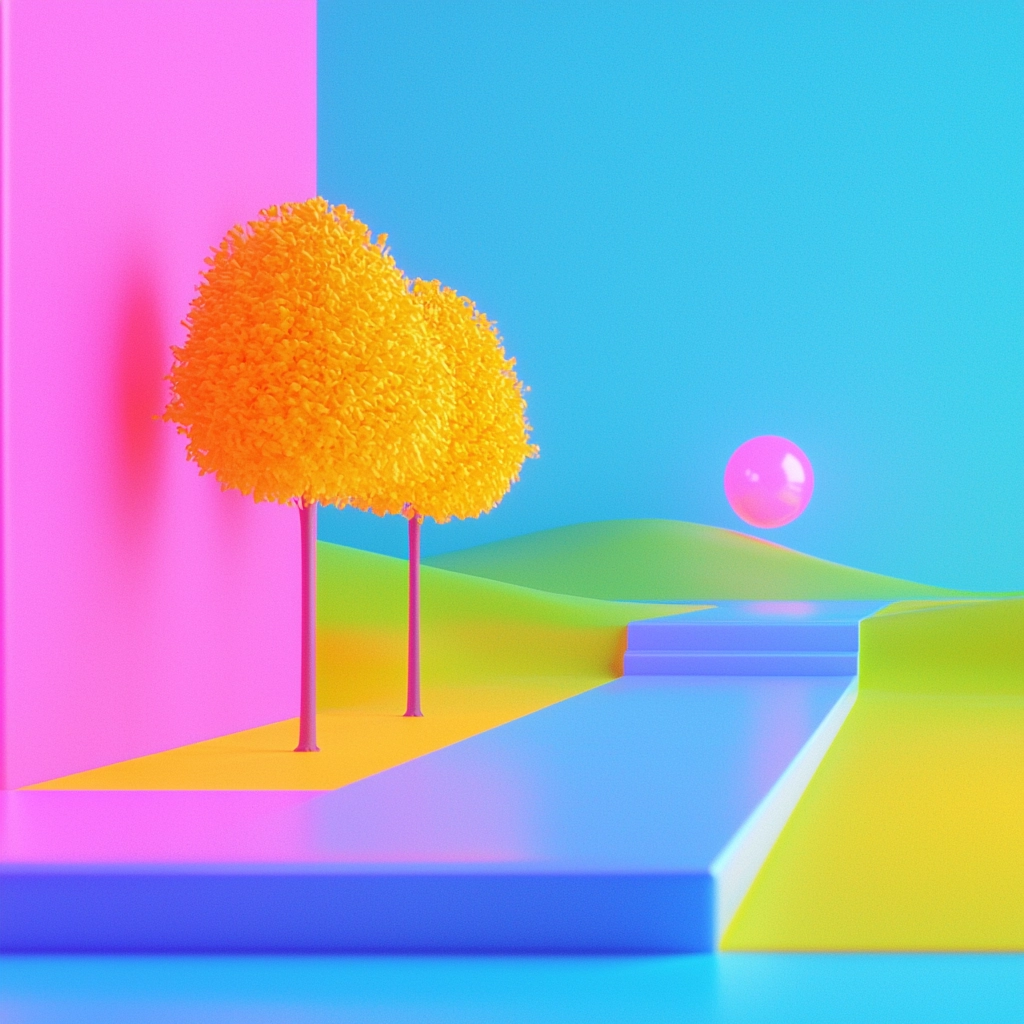 Intense lighting enhances color vibrancy with a smooth gradient blend and spatial clarity. Textures are minimalistic yet striking, emphasizing color and form with a synthetic luminescence.