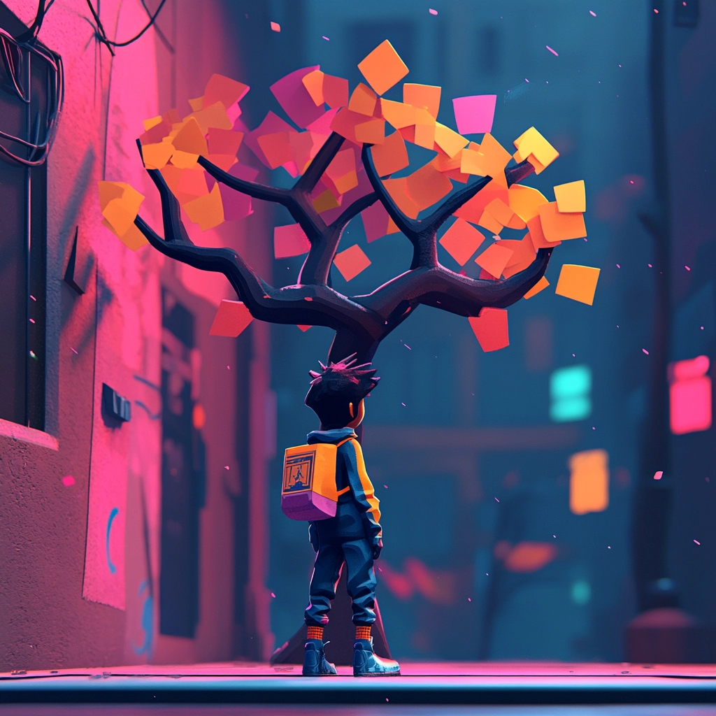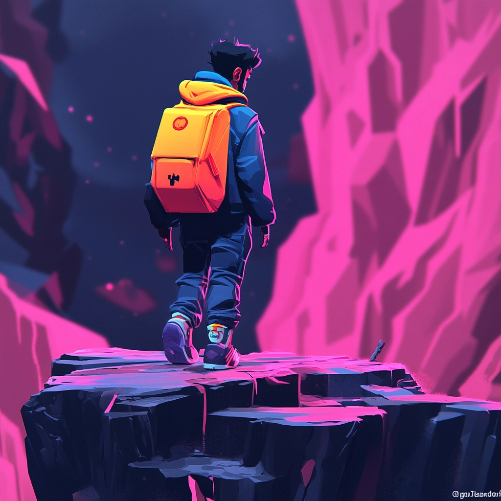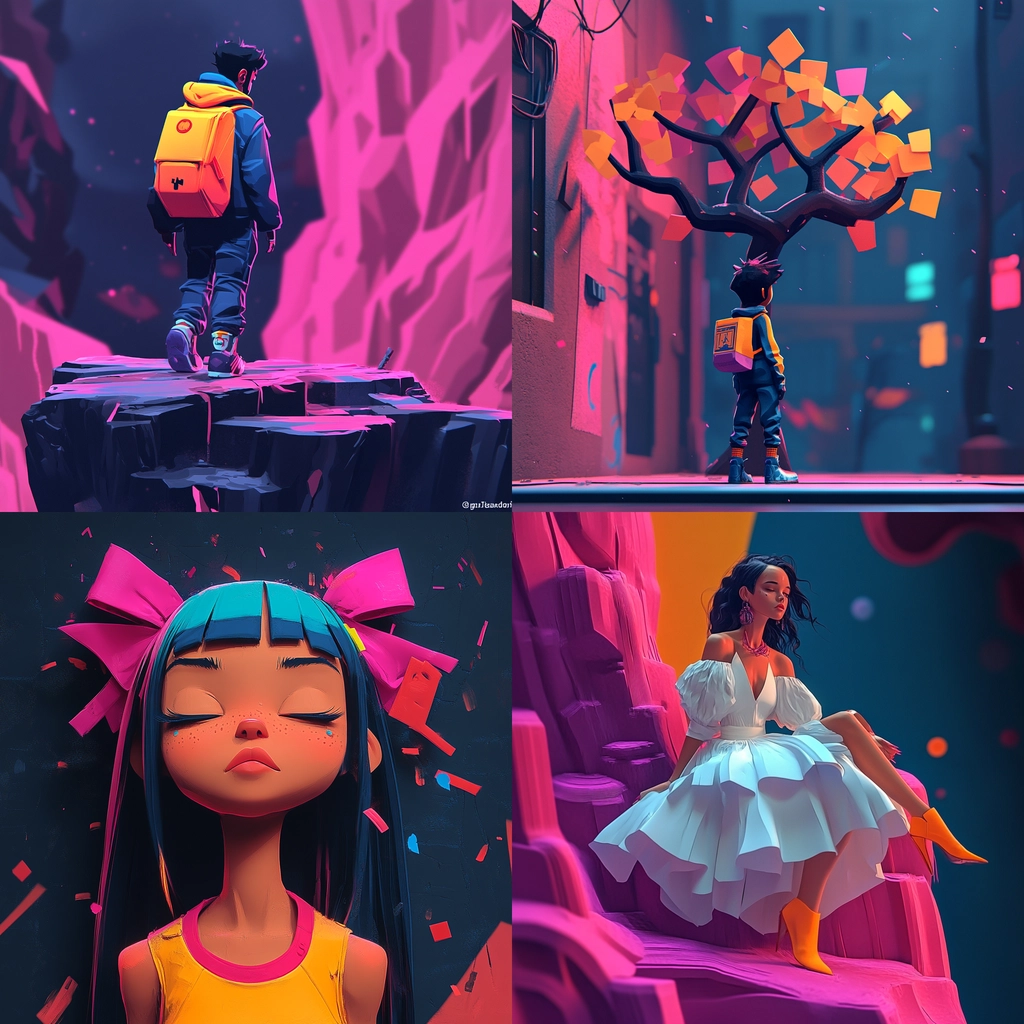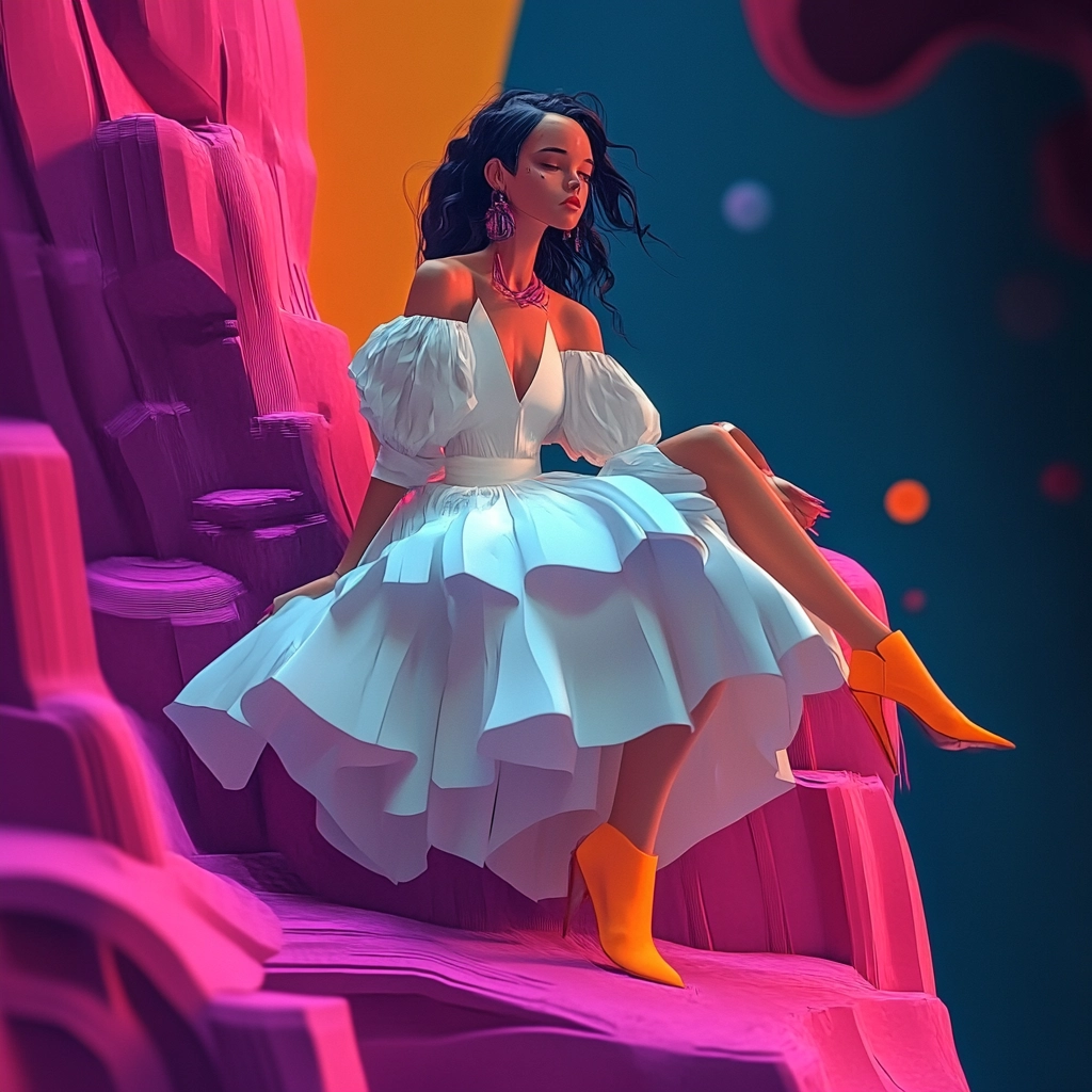 The lighting creates stark contrasts with a smooth texture and an expansive sense of space, using vibrant purples, oranges, and pinks to emphasize a surreal atmosphere.