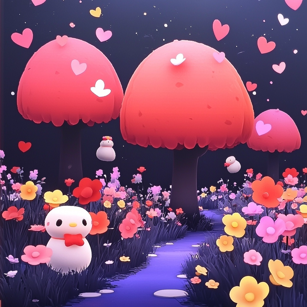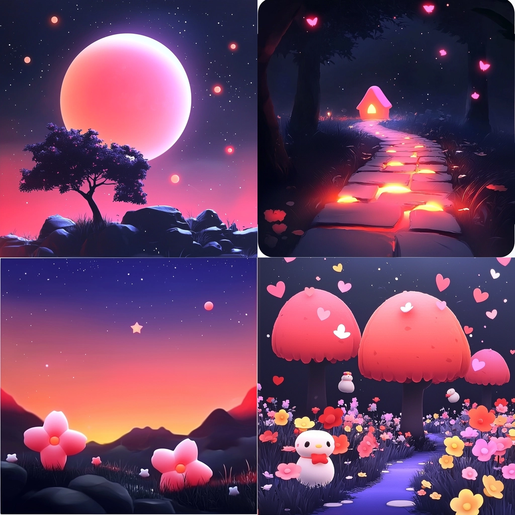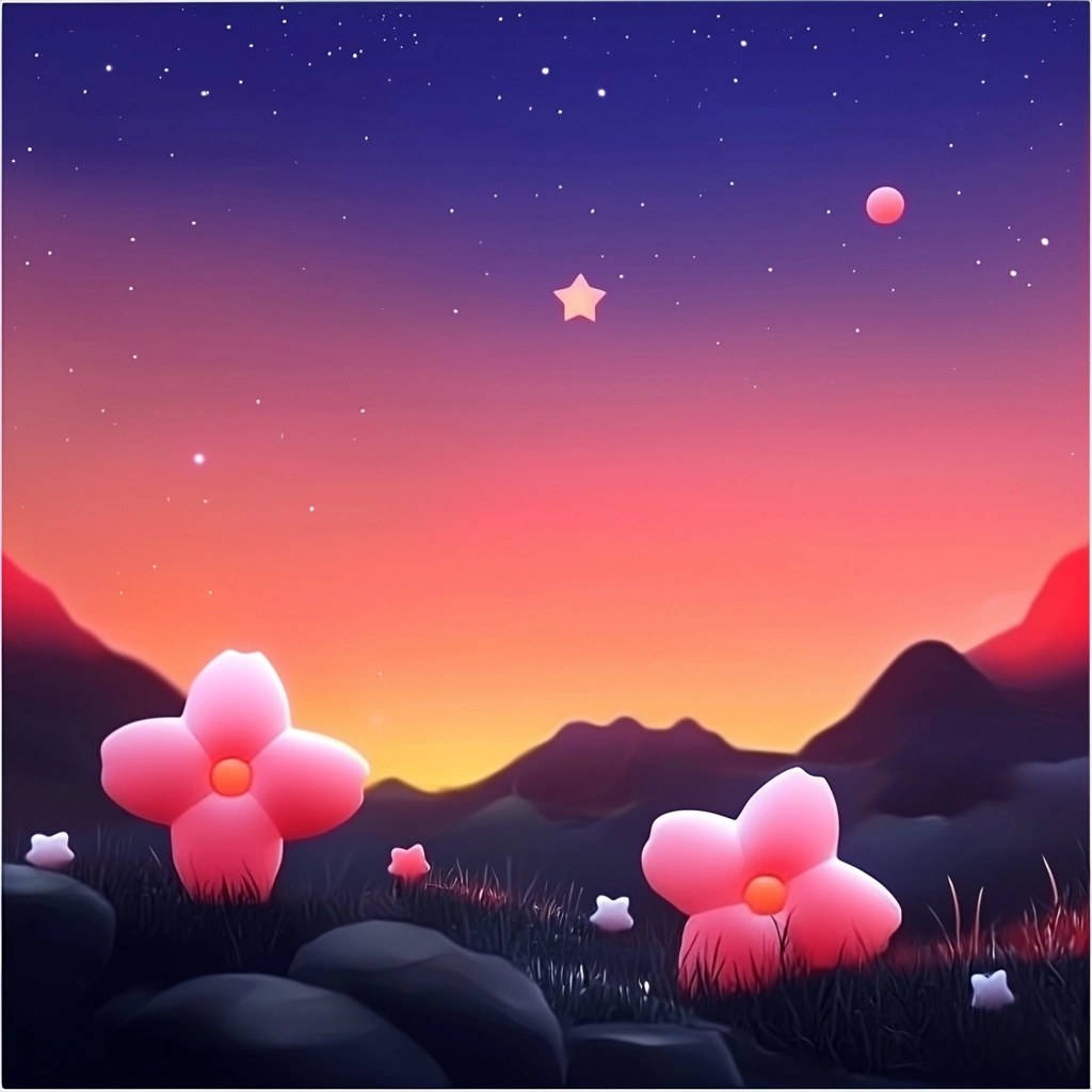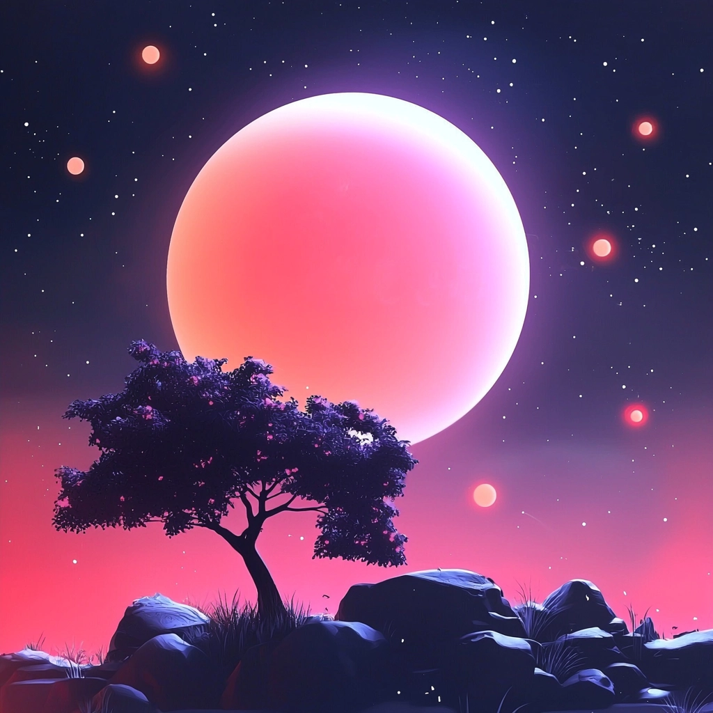 The expansive dark blue background contrasts sharply with vibrant pink and red highlights, creating a sense of depth and space. Luminous effects enhance the overall composition, while the textures appear smooth and polished, giving the scene clarity and vibrancy.