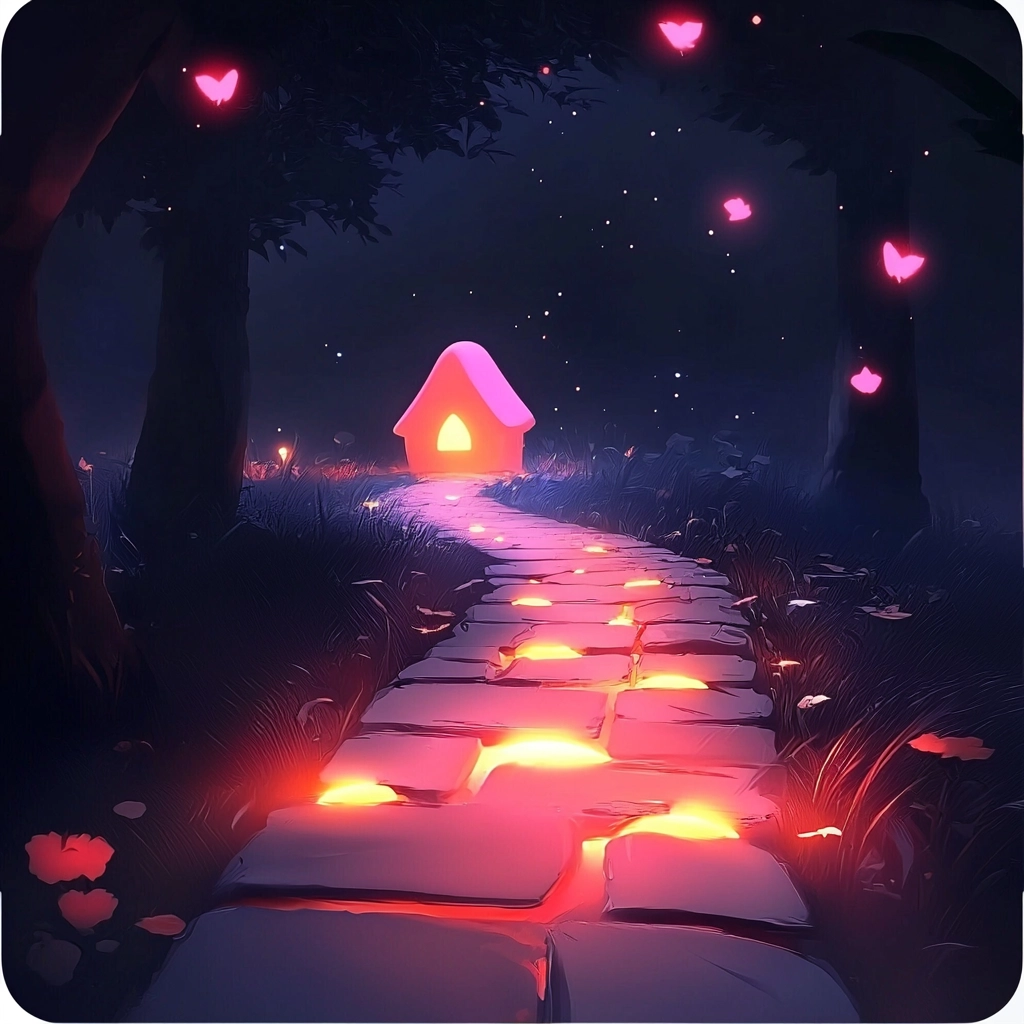 Bold, contrasting colors blend with a nighttime scene, emphasizing clear shapes and luminous effects.