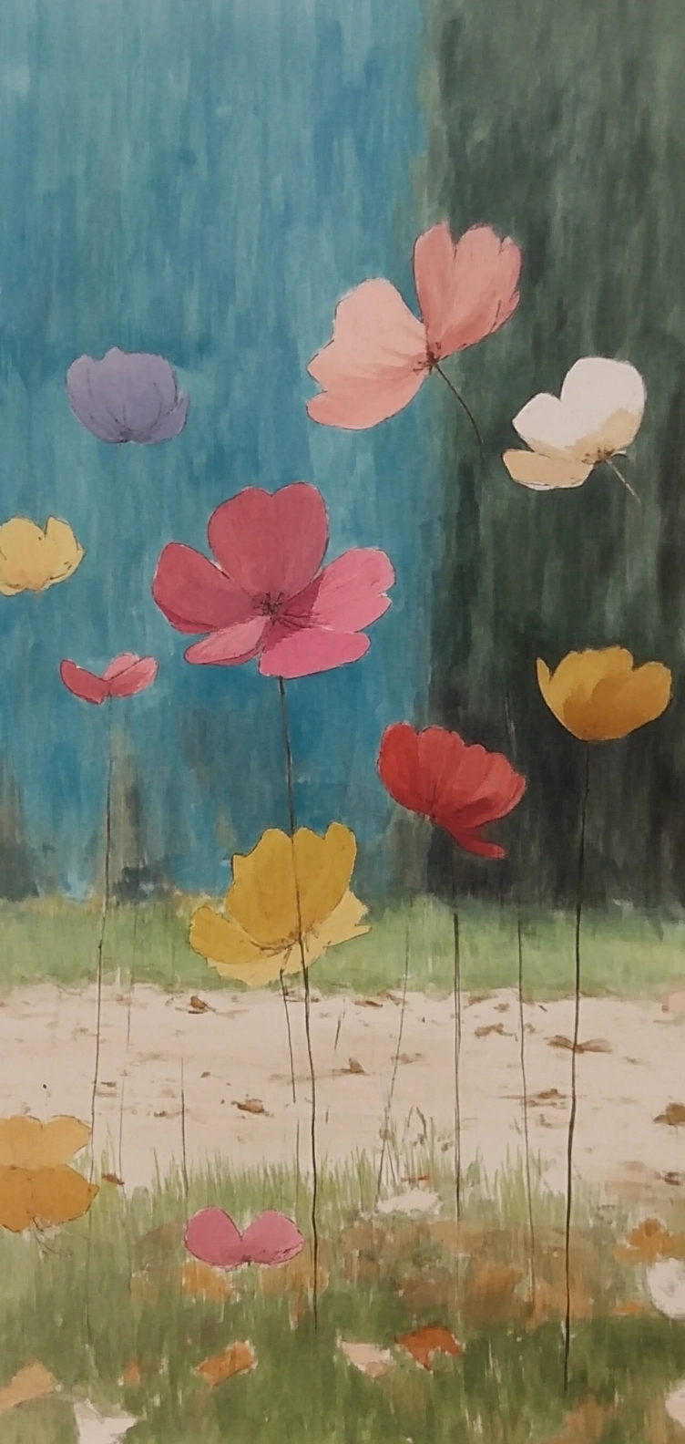 Sunlit areas juxtaposed with shadows evoke layered textures. Colors are bright yet softened, creating a balanced dynamic. Spatial depth achieved through skilled color grading and careful brushwork.