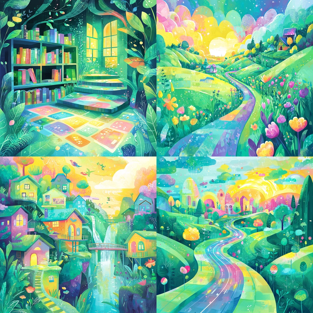 Light effects create a soft and luminescent glow across the image, while the bright pastel colors convey a vivid, lively fantasy. The spatial arrangement suggests a playful exploration of a whimsical landscape, using smooth textures and atmospheric gradients.