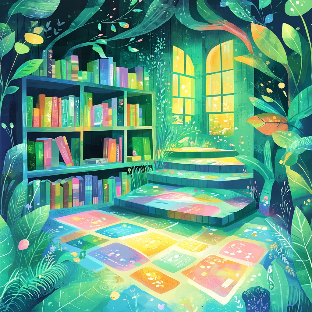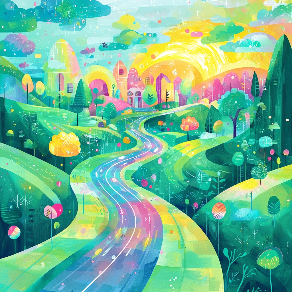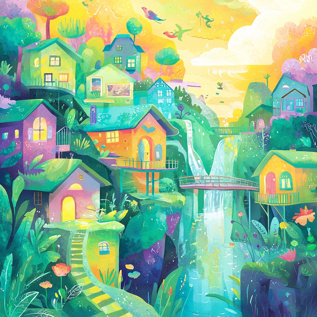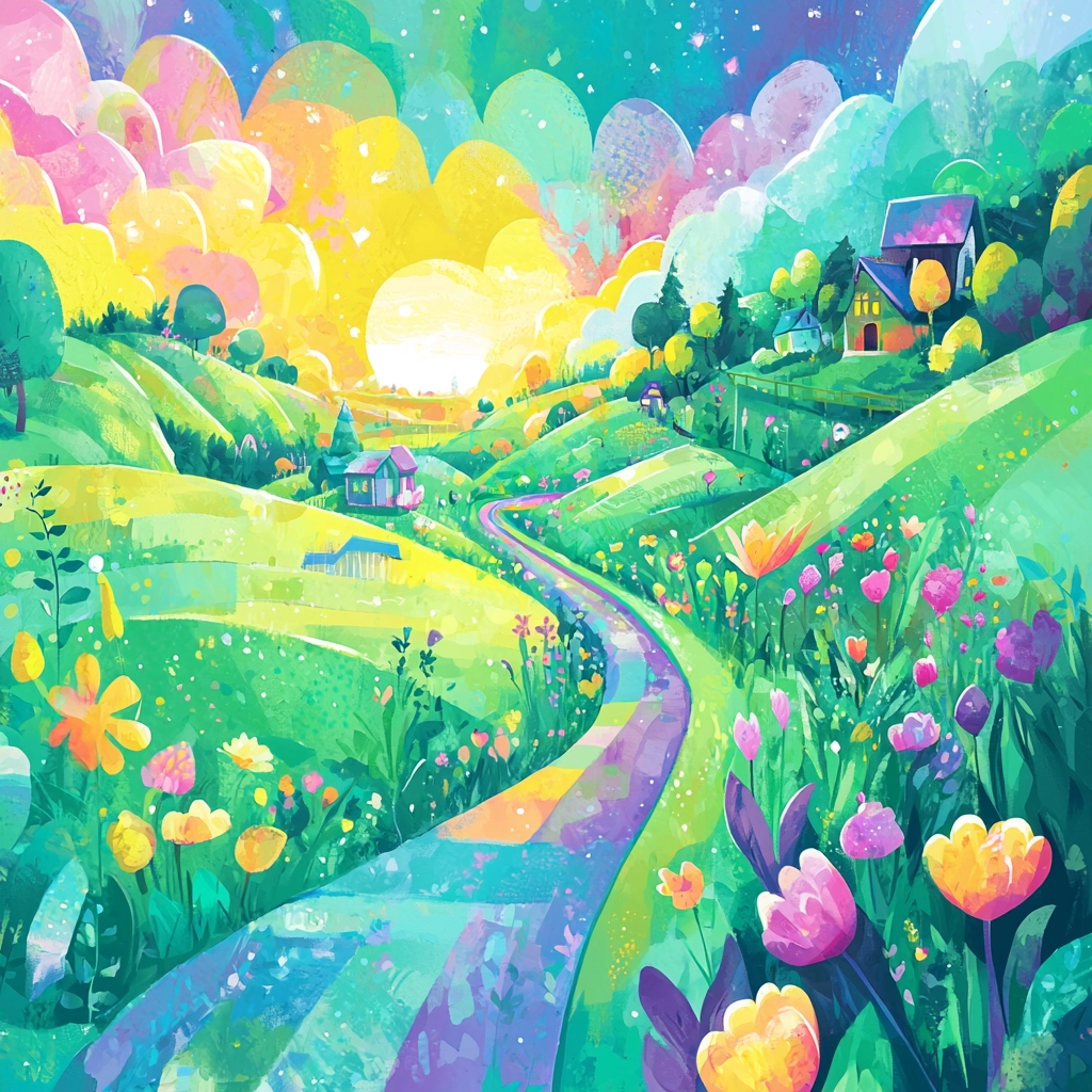 An energetic composition with vivid and colorful tones creating a lively, dreamlike setting.