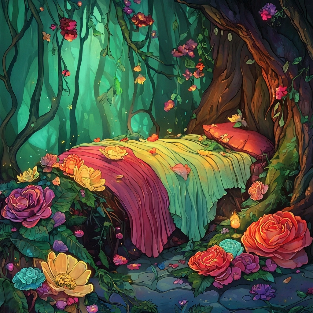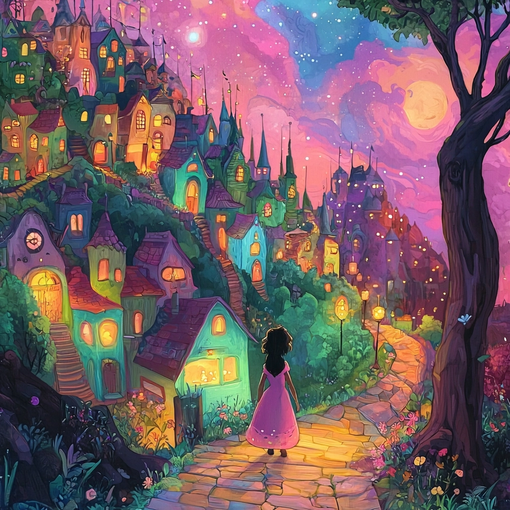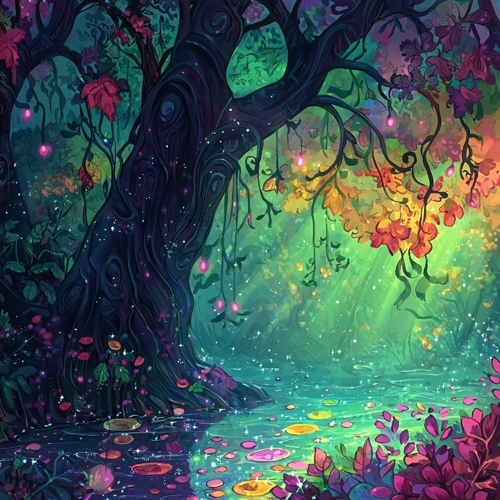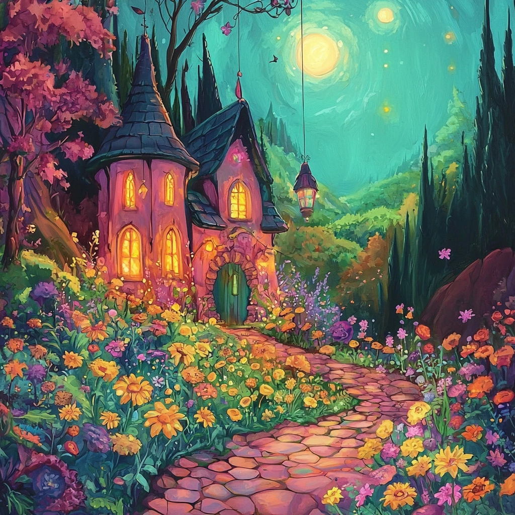 The scenes are flooded with bright, whimsical lights that playfully dance across the surfaces, highlighting the lush textures and soft pastel hues. Spatial elements are compact yet intricately layered.