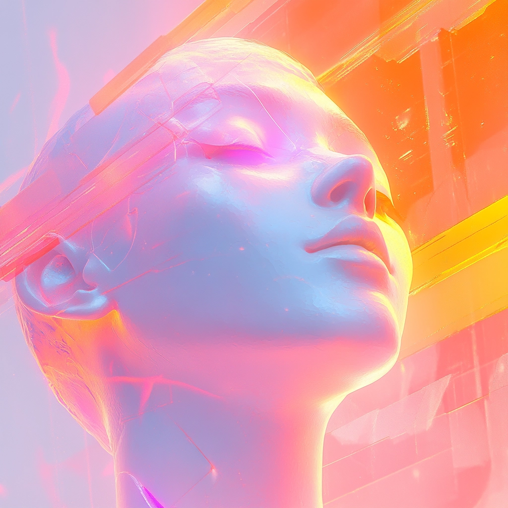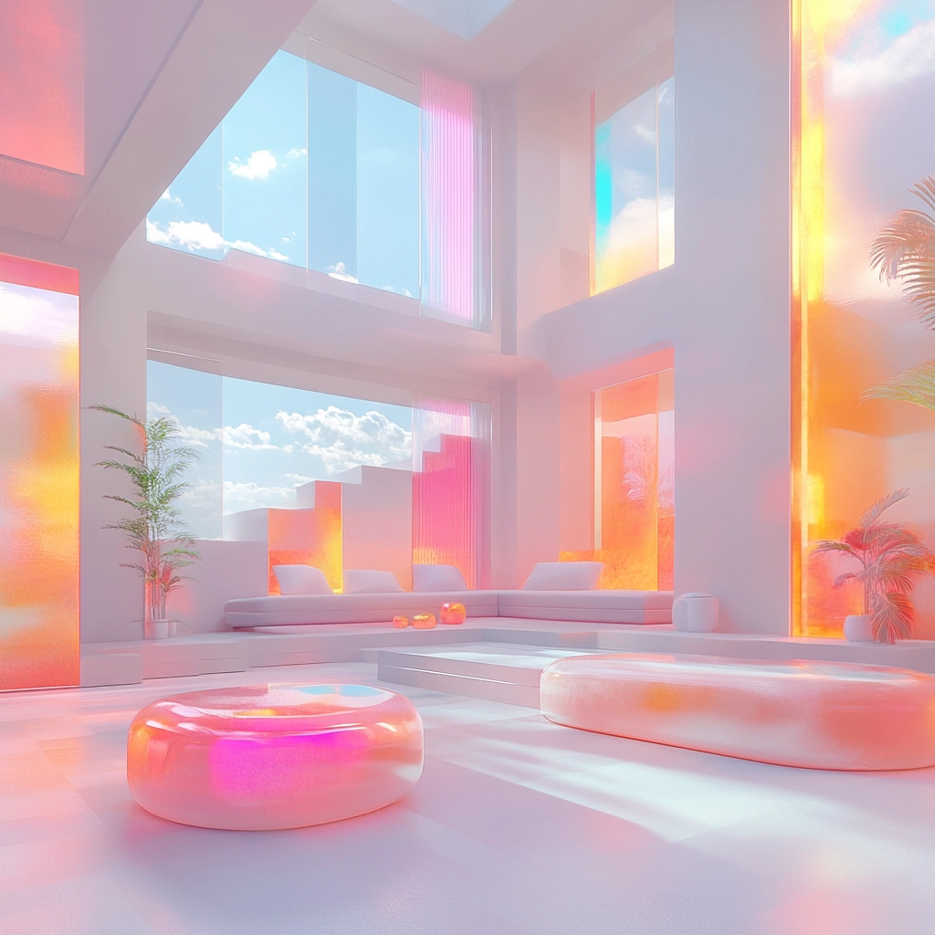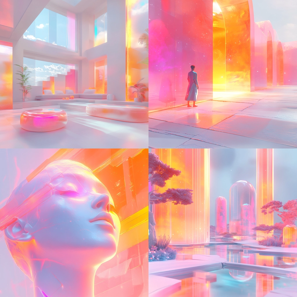 Warm lighting effects provide an inviting glow, contrasting with smooth, reflective surfaces. The use of pastel colors, including pinks and oranges, creates a soft, comforting aesthetic. Spaces are open and airy, emphasizing expansive, minimalistic elegance and providing a serene yet vibrant visual experience.