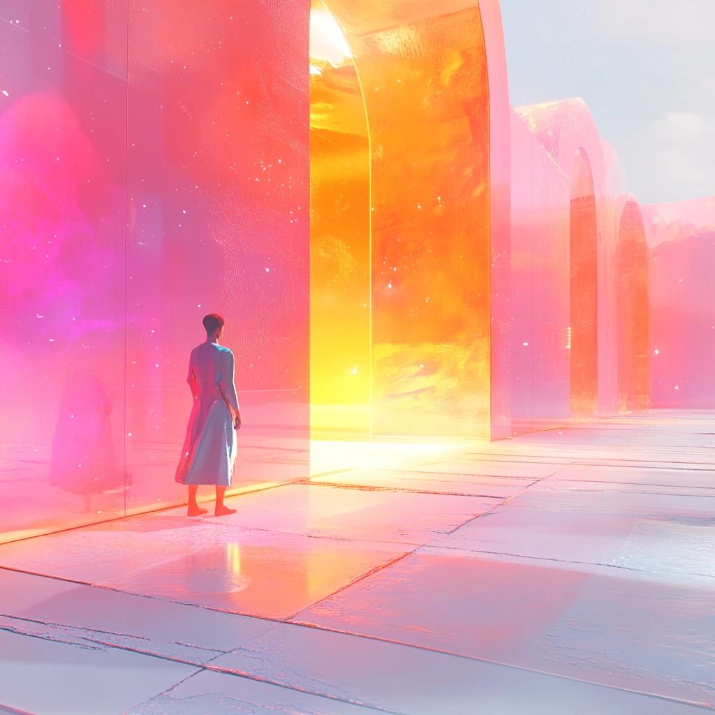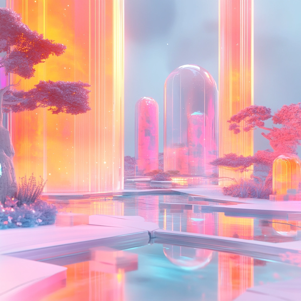Bright color palette with reflective surfaces and smooth gradients, creating a visually lush environment with an inviting glow.