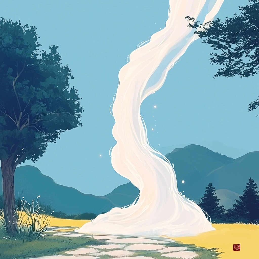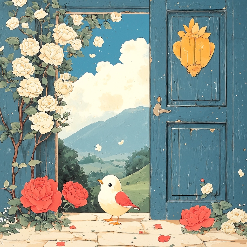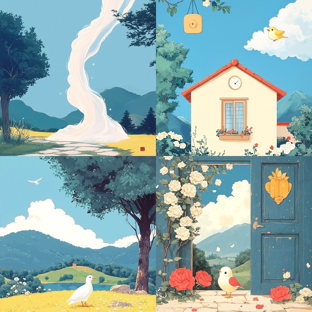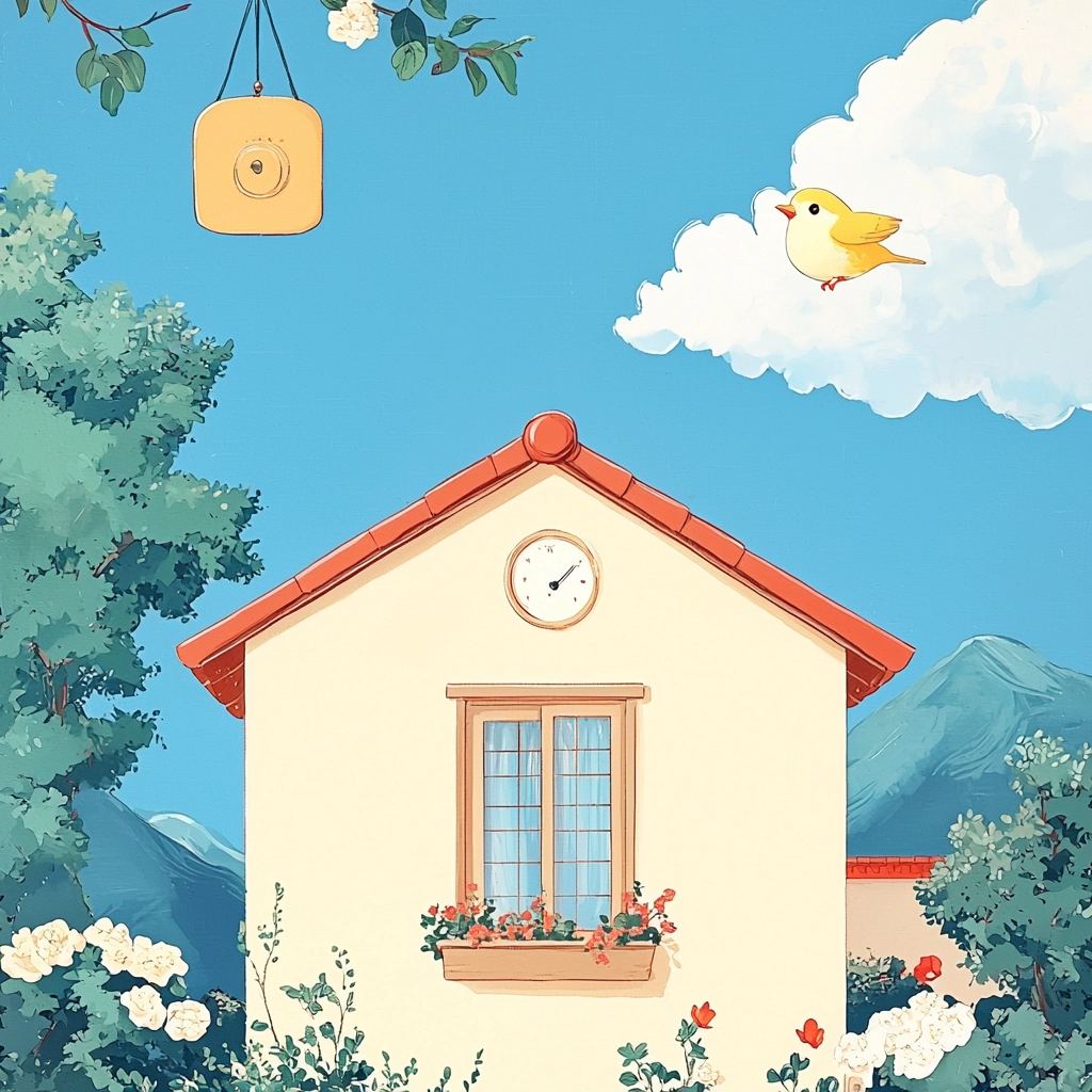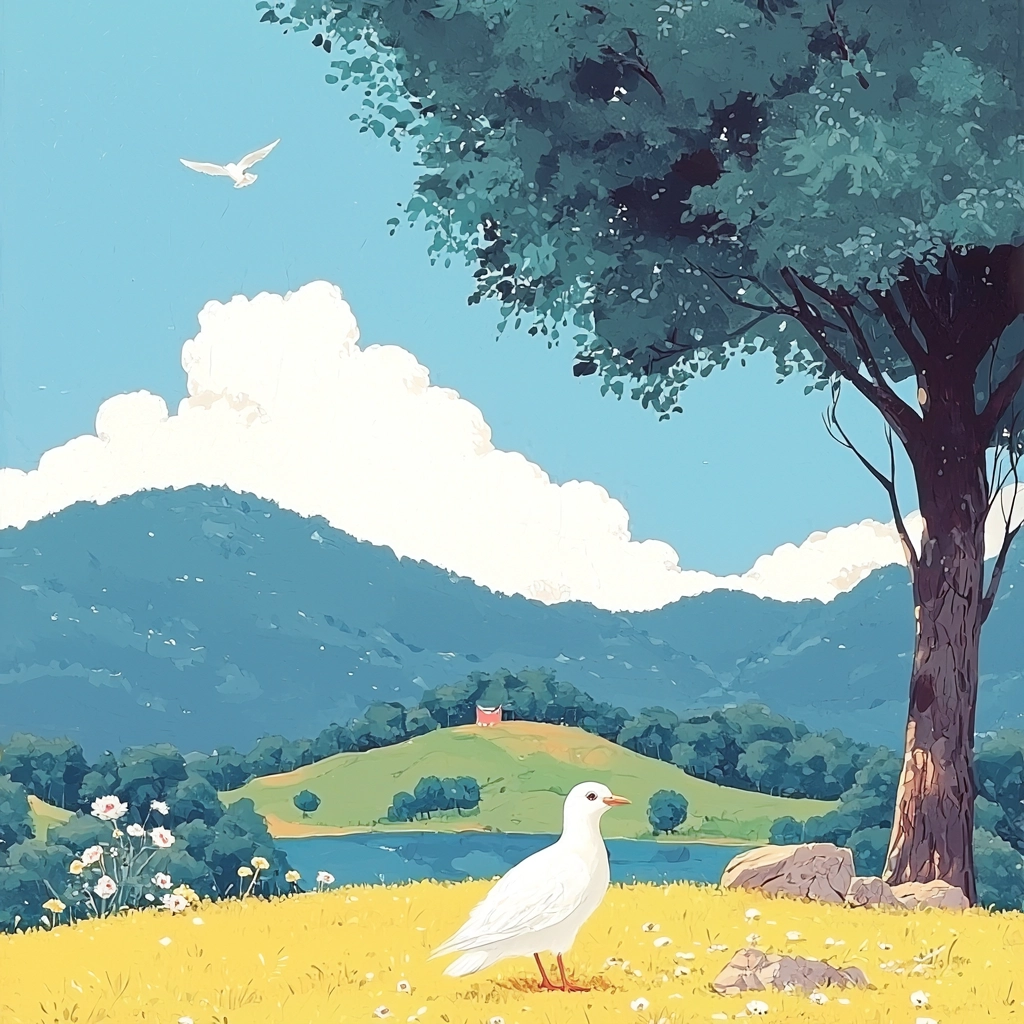 The lighting is warm and even, creating a lively yet gentle atmosphere. Colors are rich and saturated, highlighting natural elements. There's a strong sense of space, with clean textures and defined outlines adding clarity and simplicity.