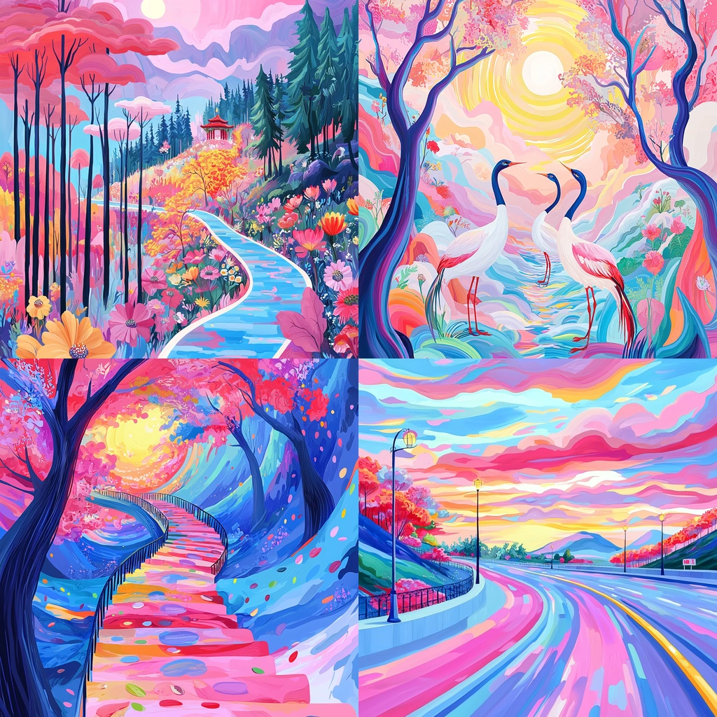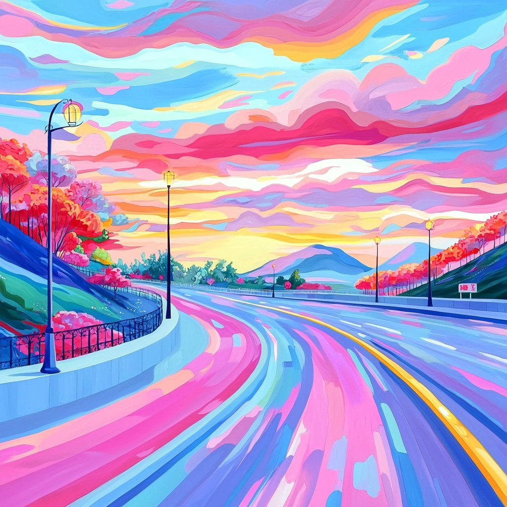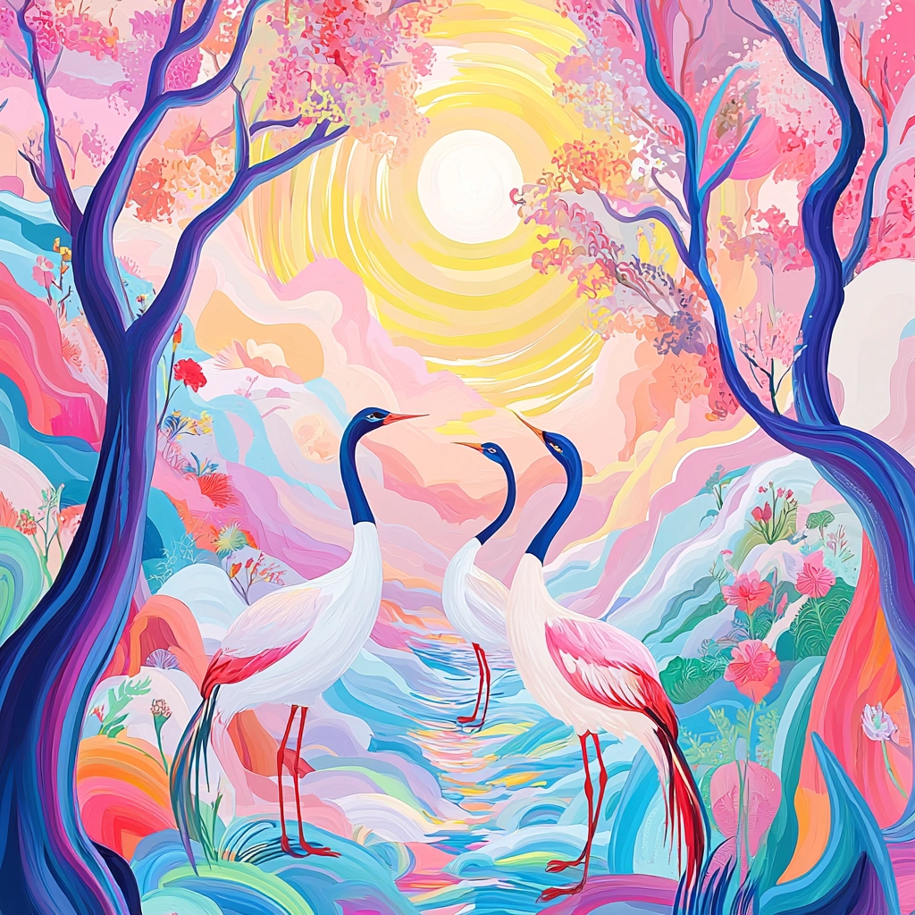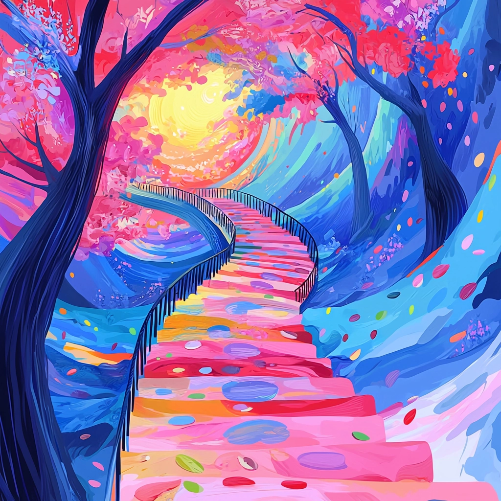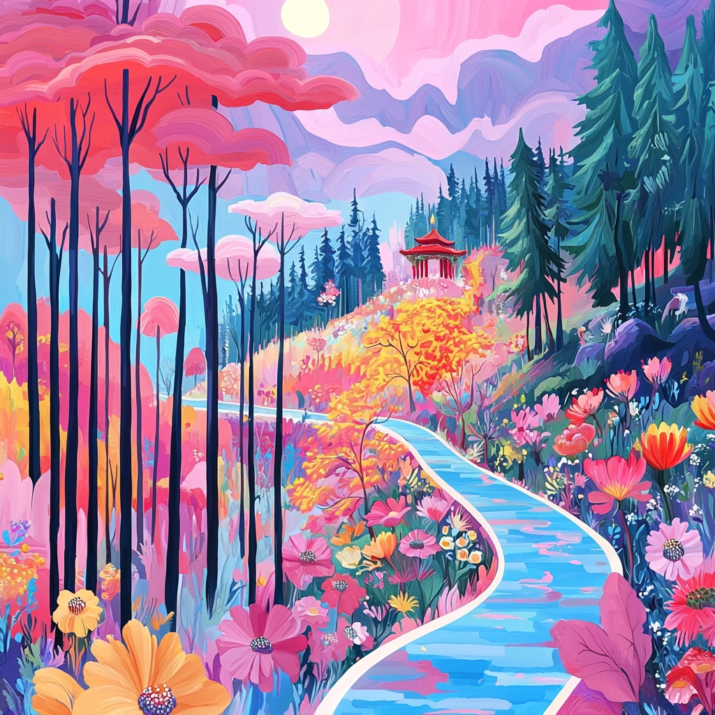 The use of pastel colors creates a soft yet vivid appeal while the smooth transitions and bold outlines enhance the lively composition. Lighting is bright and even, generating an expansive and inviting spatial sense.