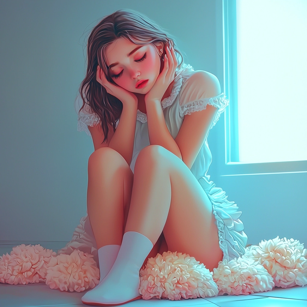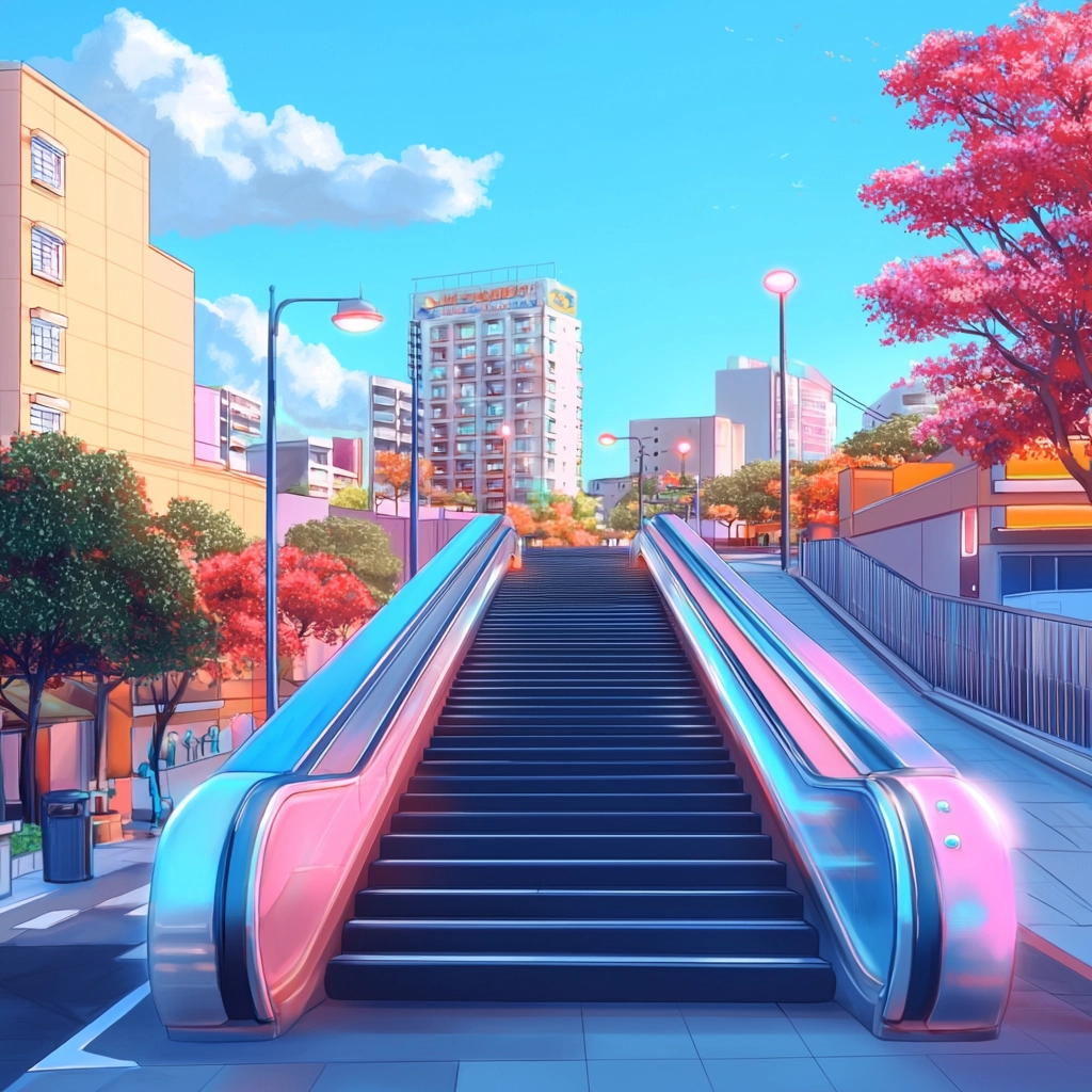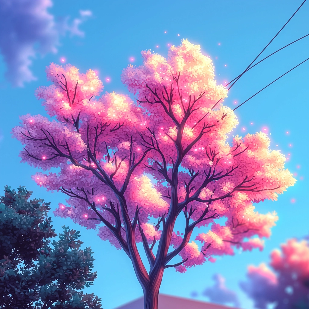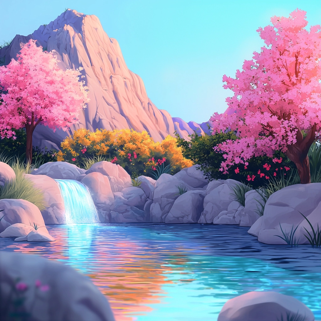 Distinct layers of pink, blue, and green establish a lively visual depth. Gentle lighting enhances the immersive effect, with subtle textures making elements pop. The interplay of colors creates a balanced composition with dynamic spatial effects.