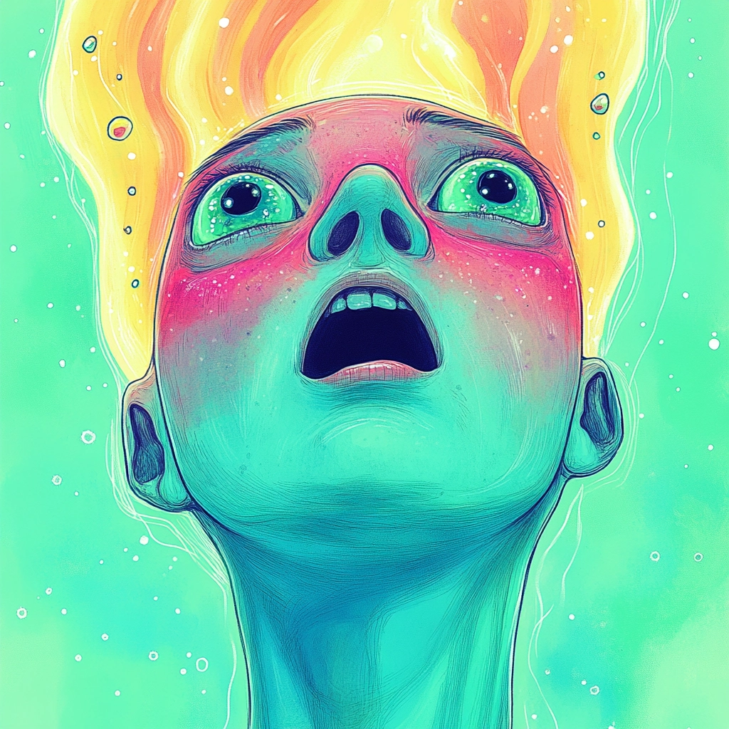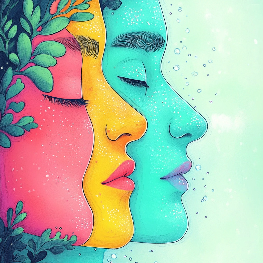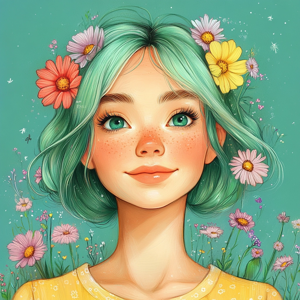 Brightly colored visuals with smooth textures and floral accents.