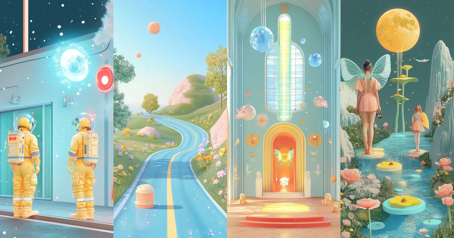 The lighting is bright, casting a clear and vivid tone across all elements. Colors are primarily pastel, lending a smooth texture. Spatial compositions are expansive, providing a sense of depth and surreal landscapes.
