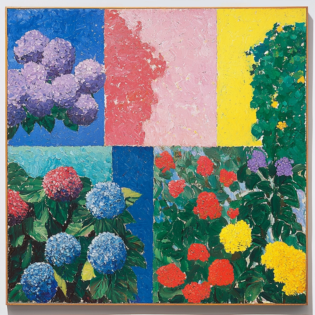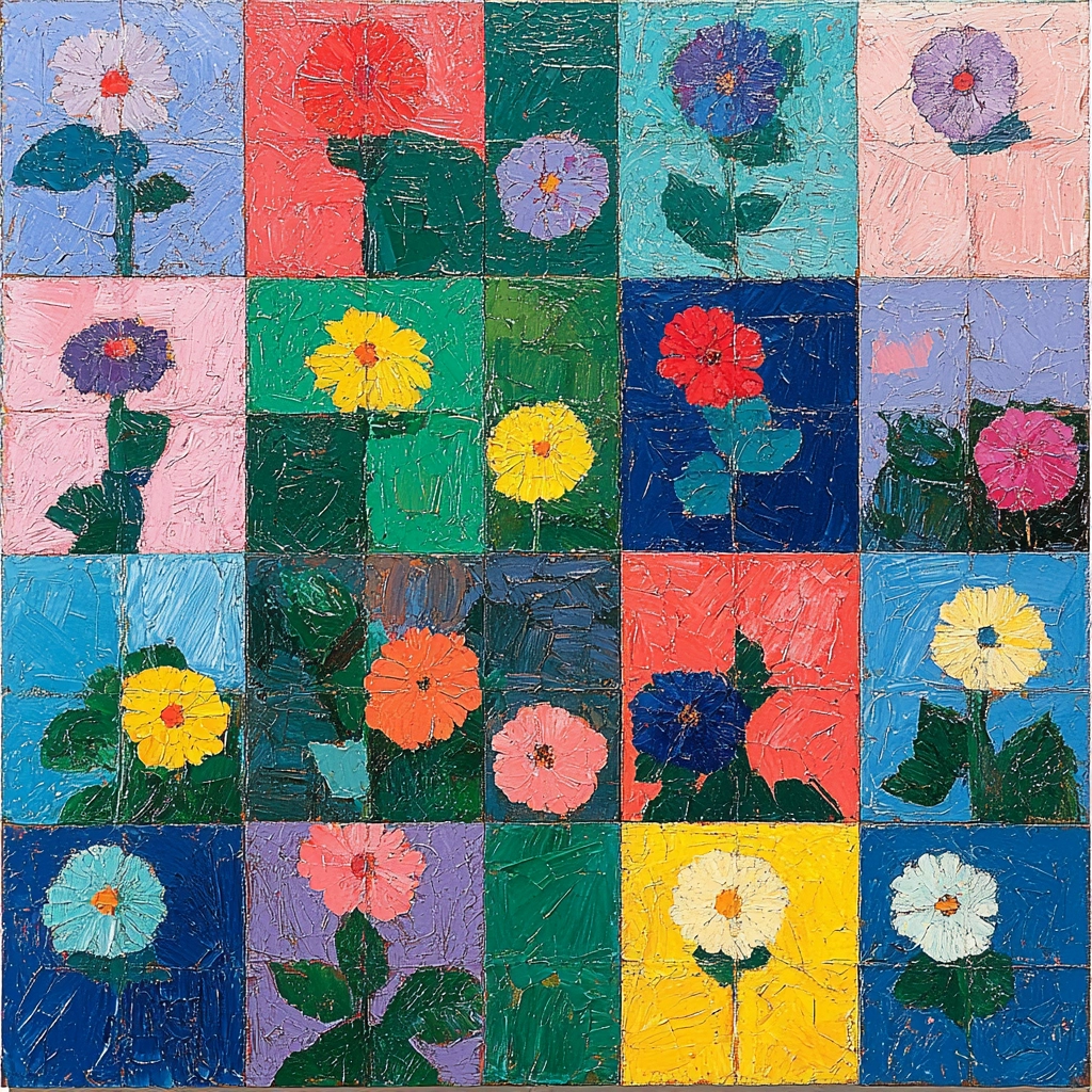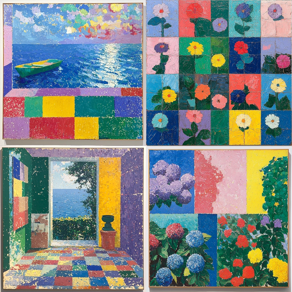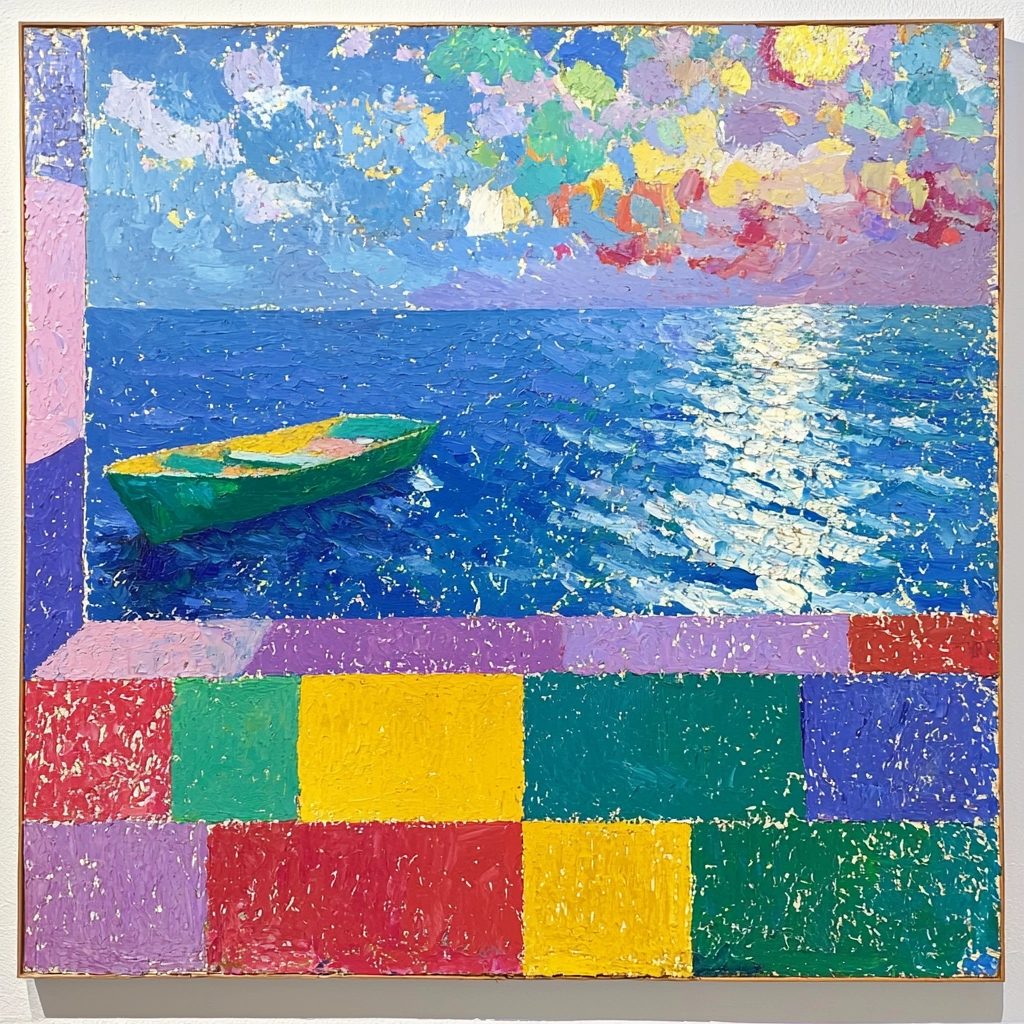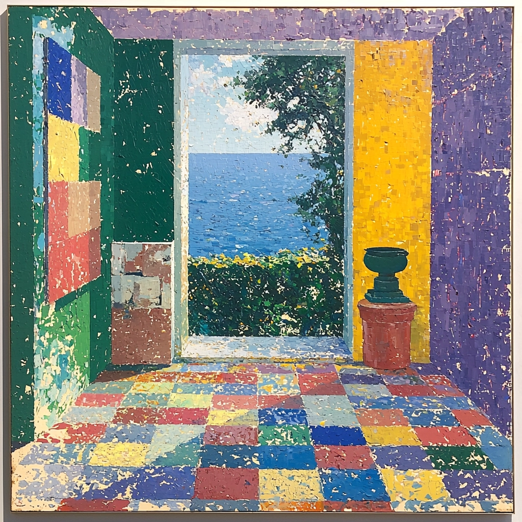 The composition employs vibrant color blocks creating a sense of rhythmic repetition, each segment emphasizing the tactile texture of thickly applied paint. The interplay of intense colors and natural light enhances depth, creating a layered spatial dimension that draws the viewer into the scene.