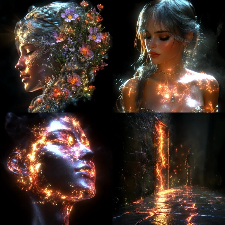 The lighting is bold and evenly distributed, highlighting the saturated color palettes. Colors are rich with smooth transitions and sharp contrasts. The spatial arrangement is tight, focusing on clean lines and stark separations. The textures appear sleek with a polished, digital finish.