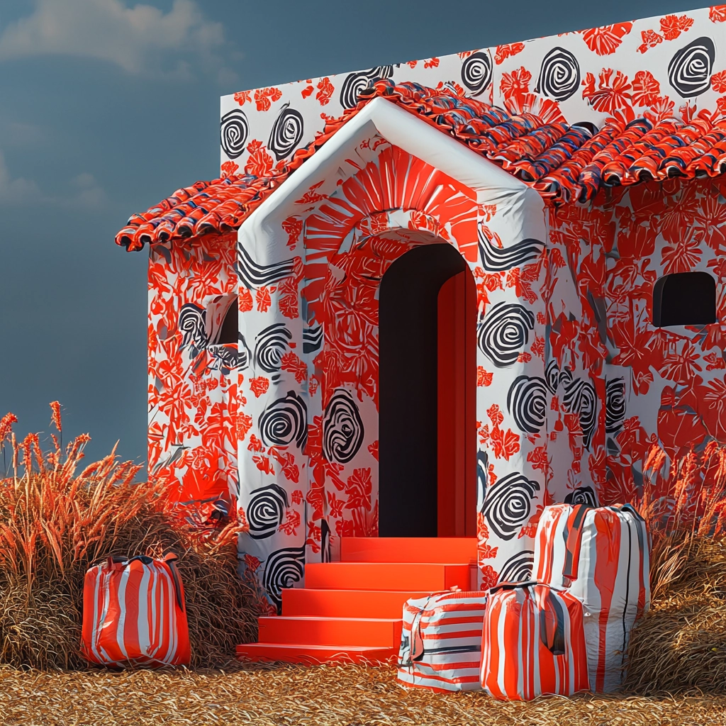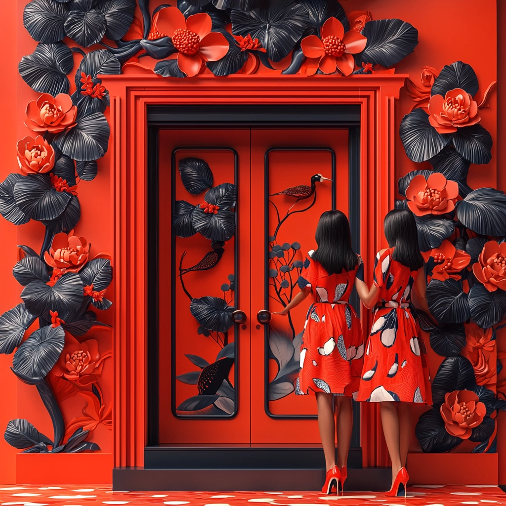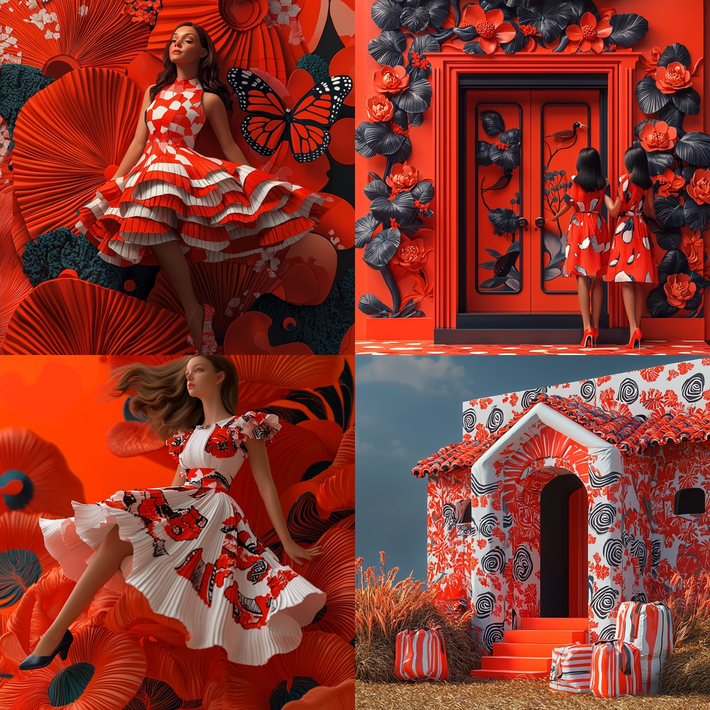 The lighting enhances the stark contrast between the bold red and deep black, creating a vibrant spatial depth. The textures are amplified by a play of shadows, giving an almost tangible dimension to the elements. The combination of white highlights brings clarity and sharpness to the compositions.