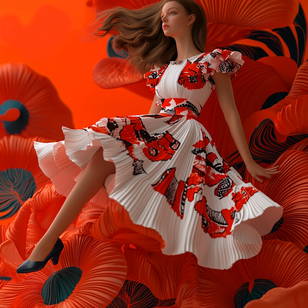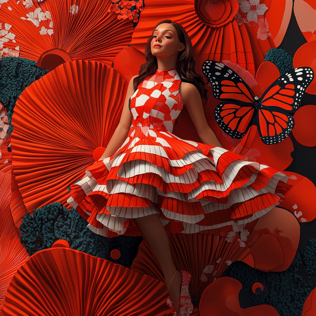 The vivid use of red contrasts with black, creating dynamic visual energy.
