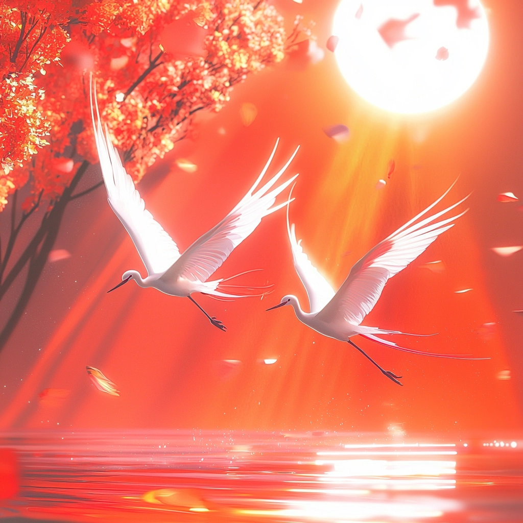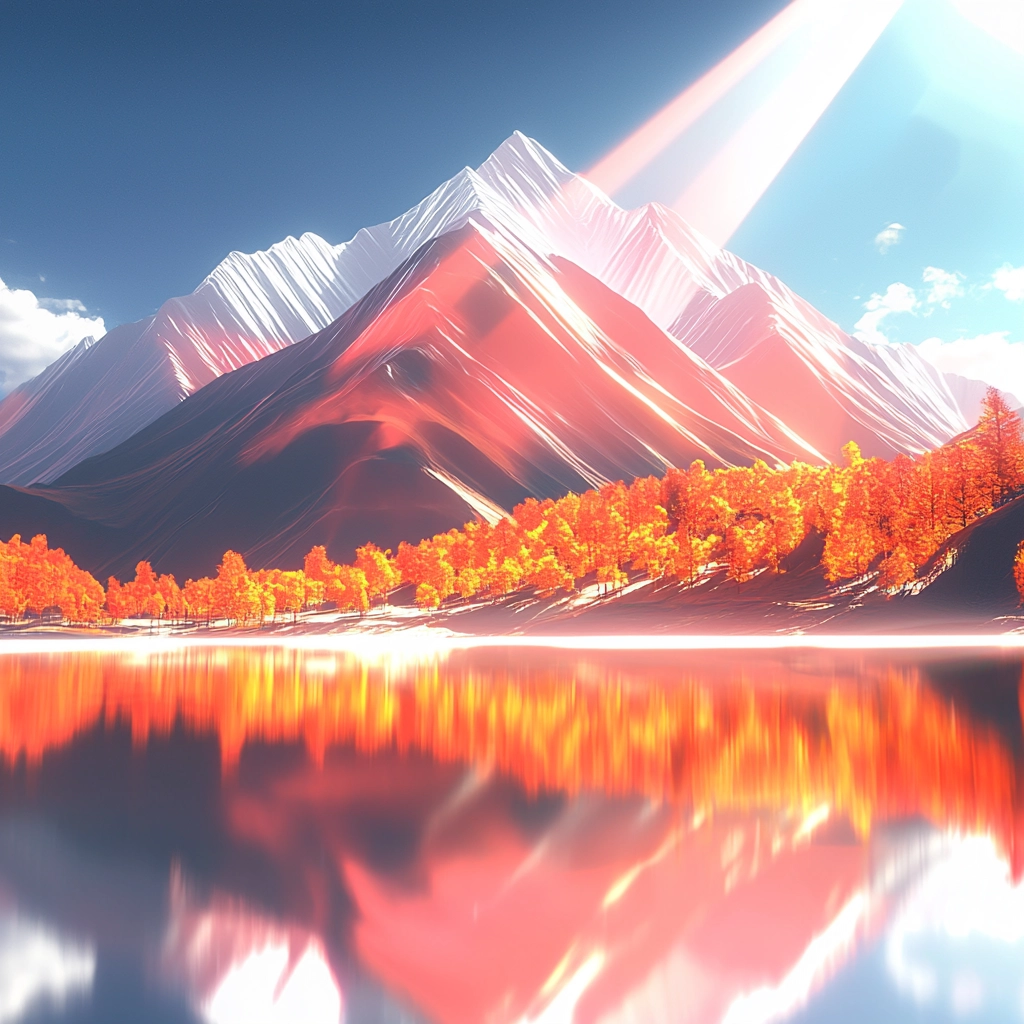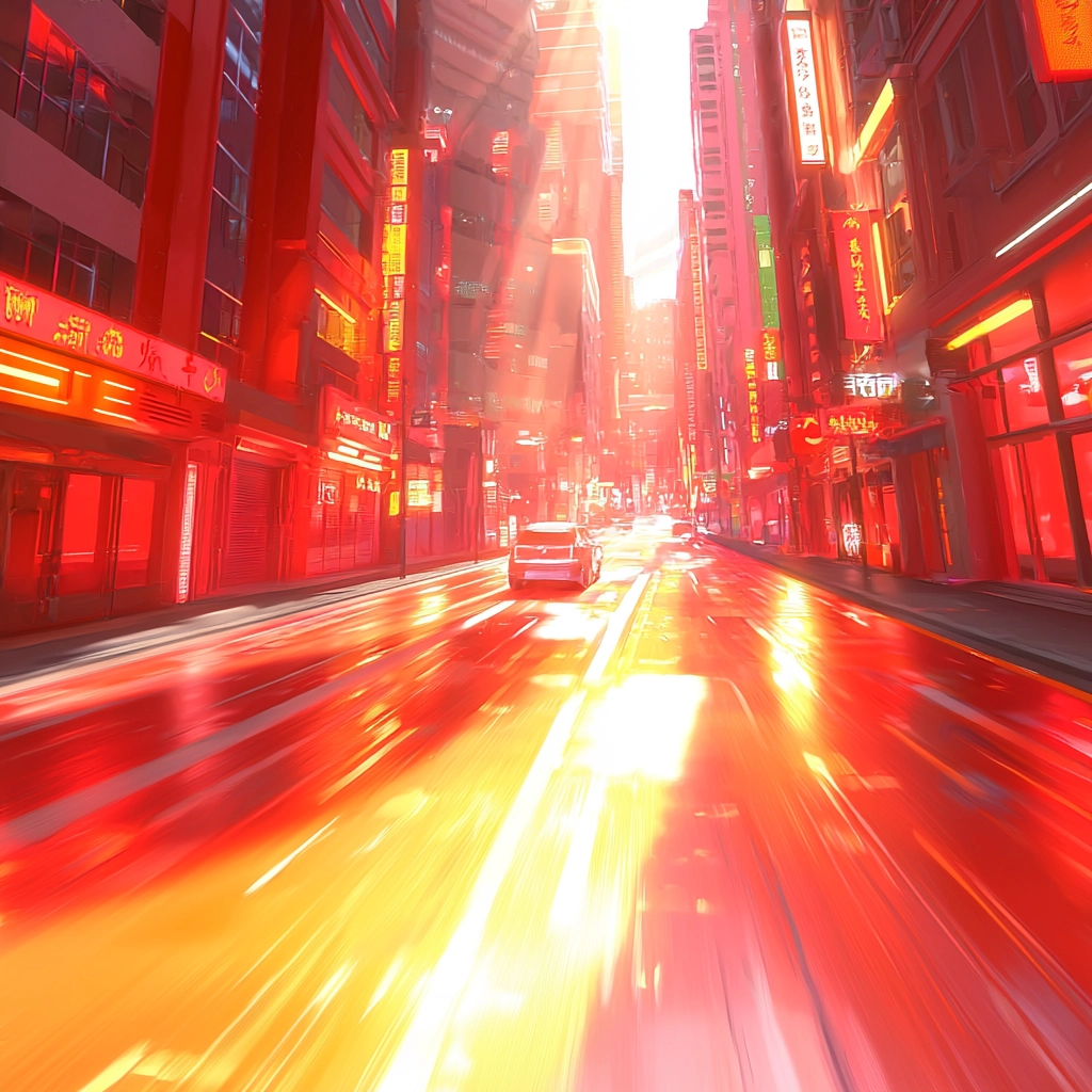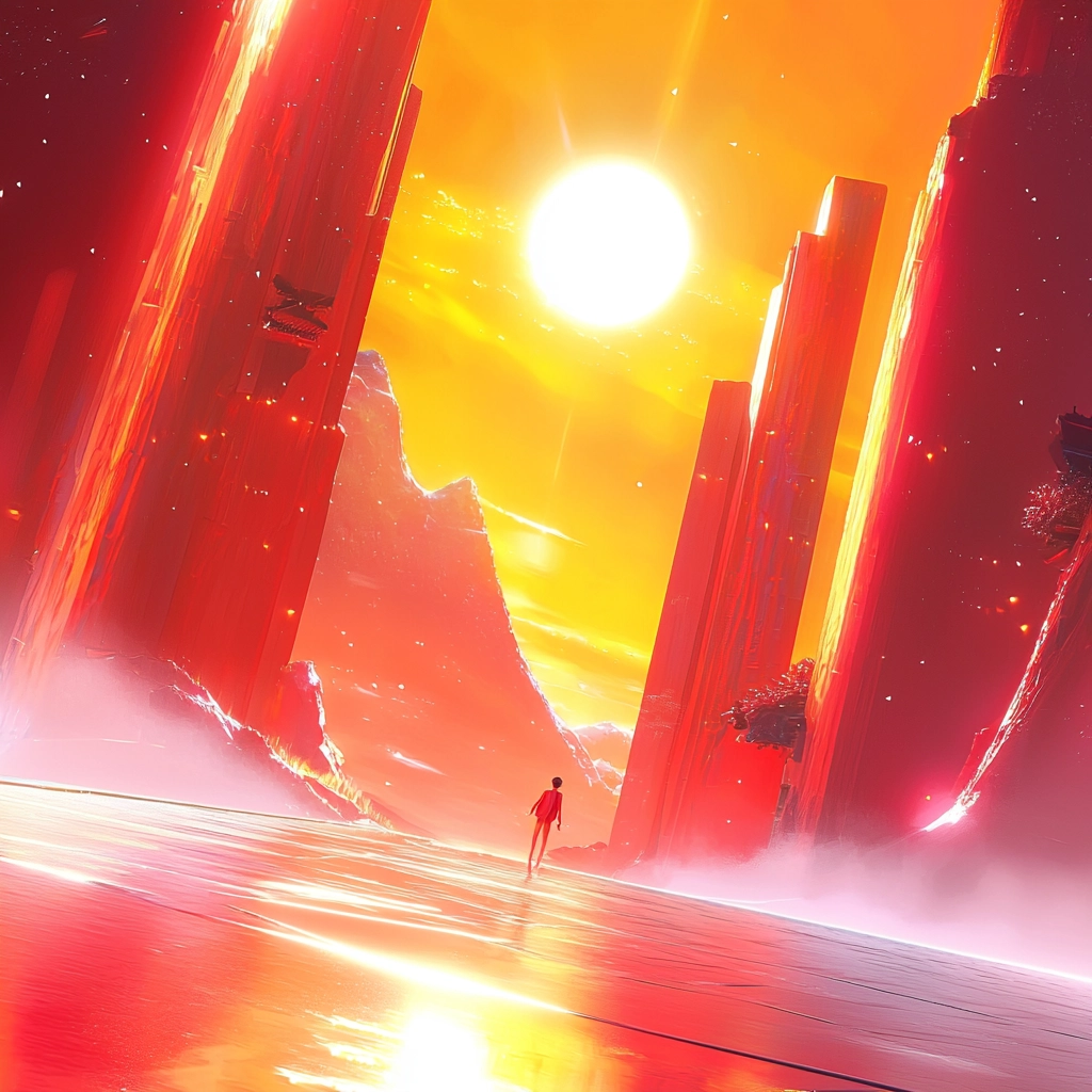 Strong illumination emphasizes reflective surfaces and creates a sense of movement and depth. The palette consists of vivid reds and oranges, contrasted with cool whites, giving a vibrant and intense visual experience with sharp textures.