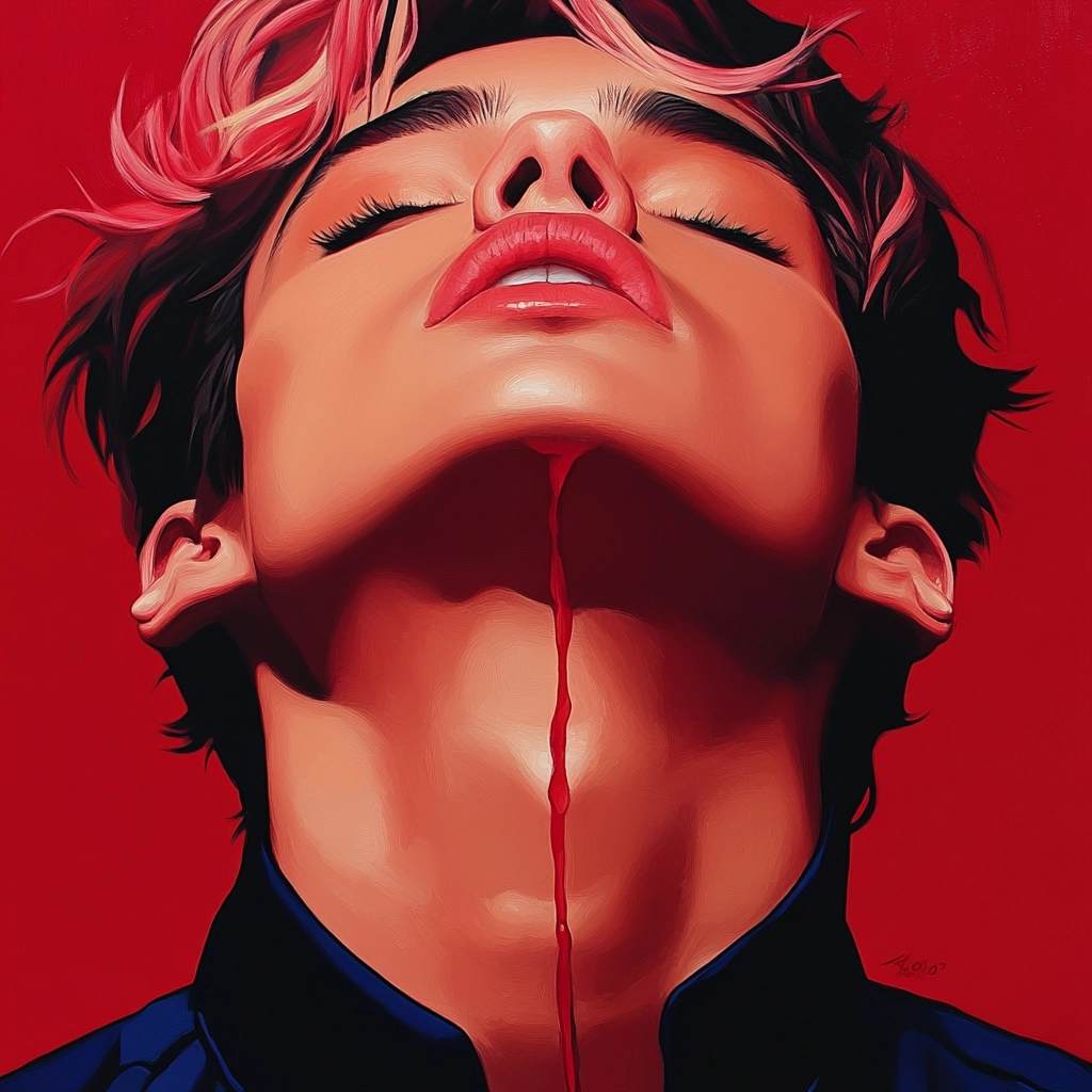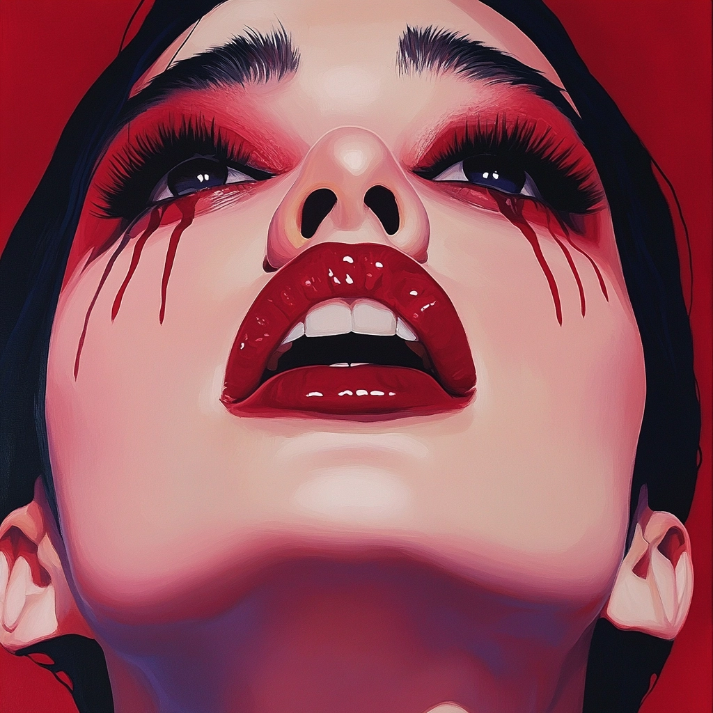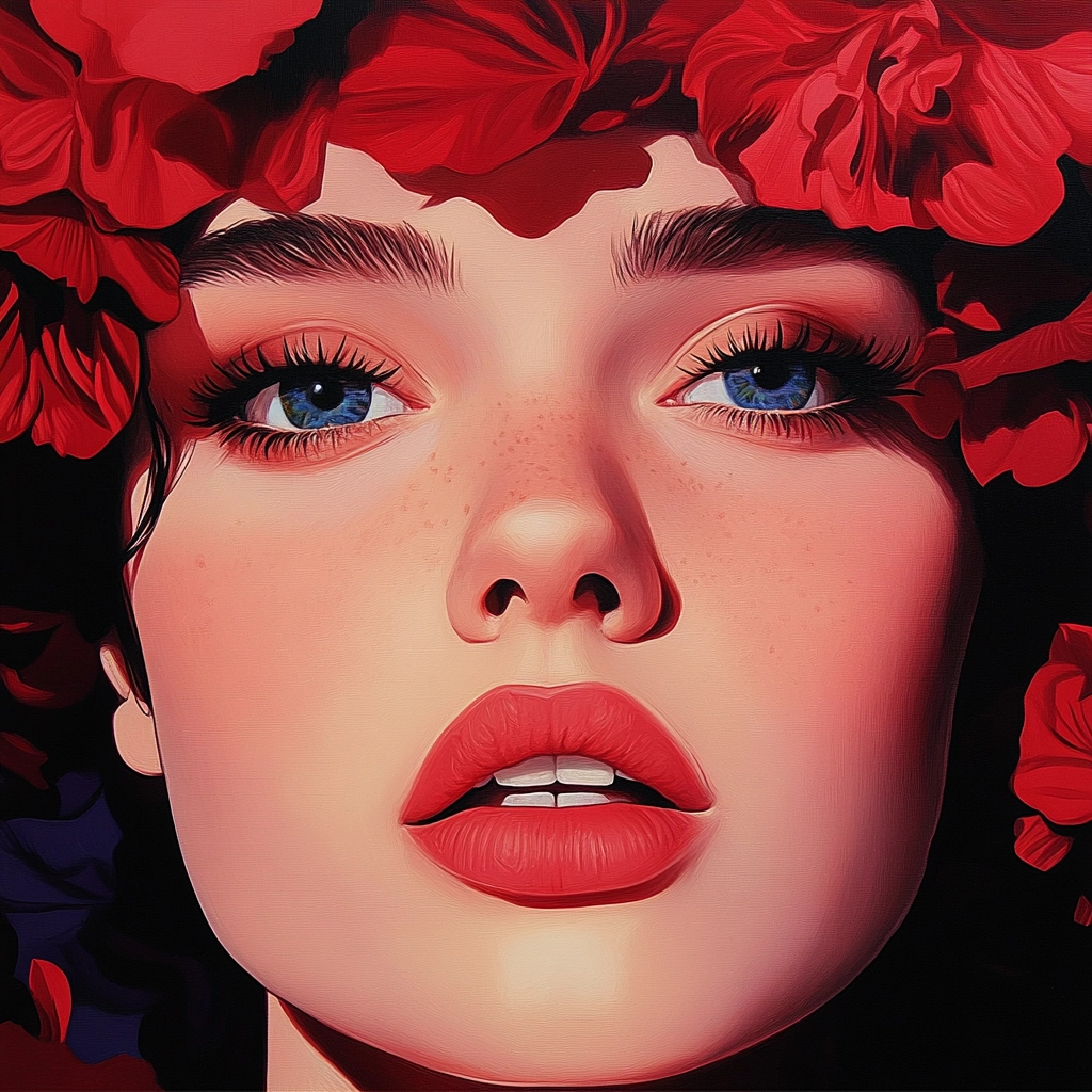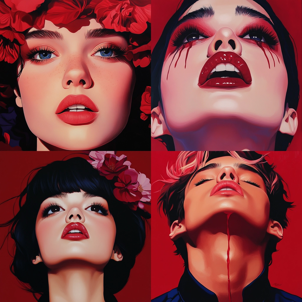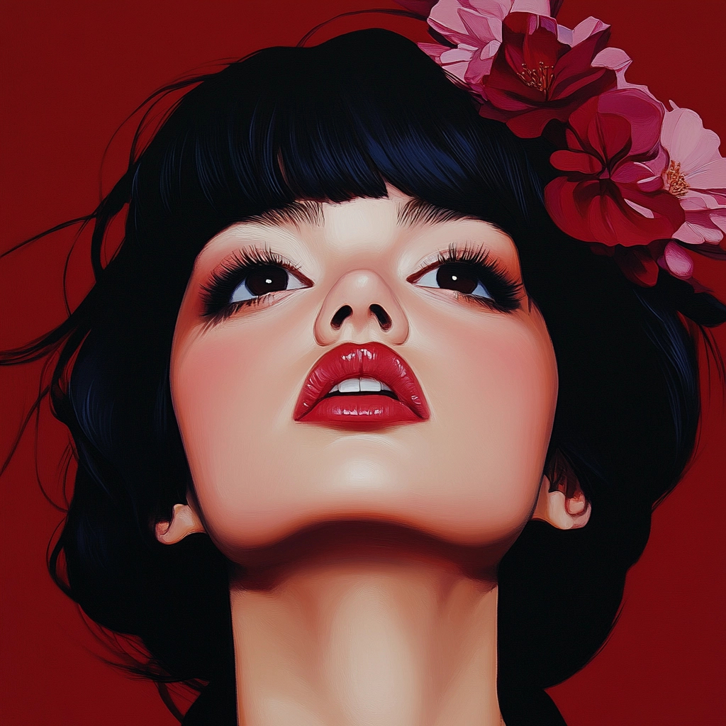 The lighting is dramatic, emphasizing the contrast between the deep red and the darker tones. The texture is smooth, with clean lines and well-defined shapes. The floral details add an intricate layer of pattern, enhancing depth and interest.