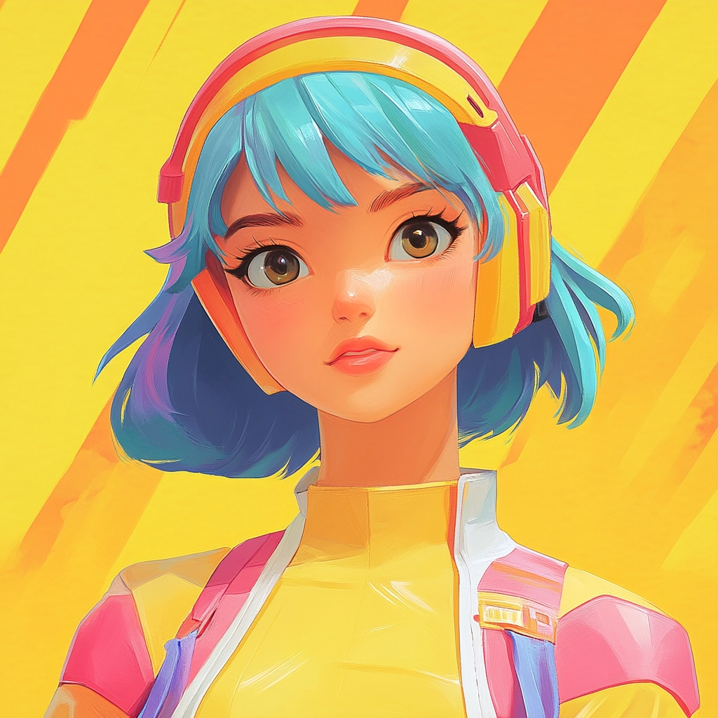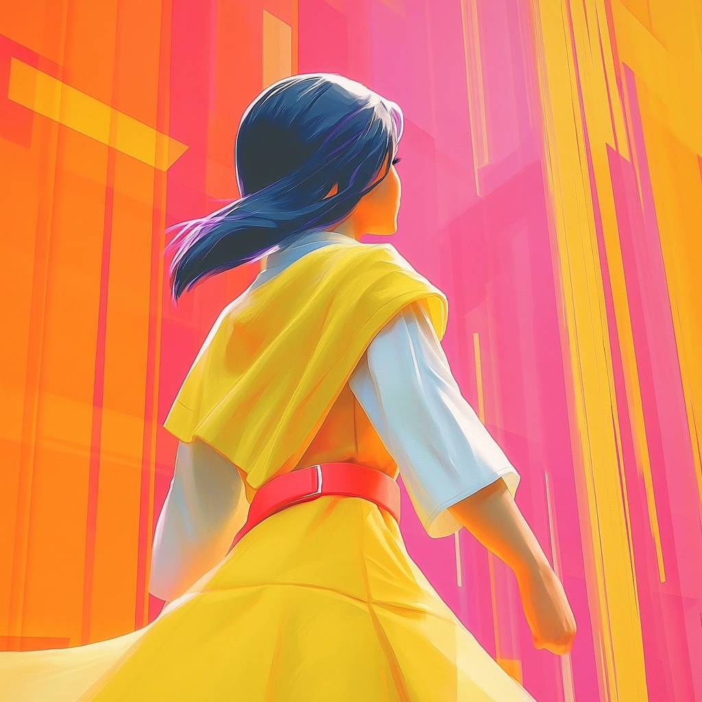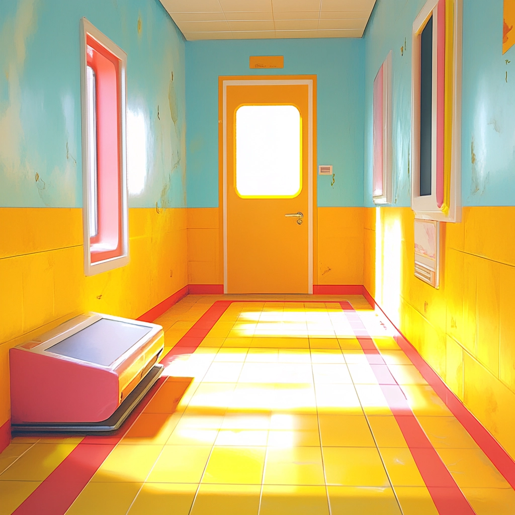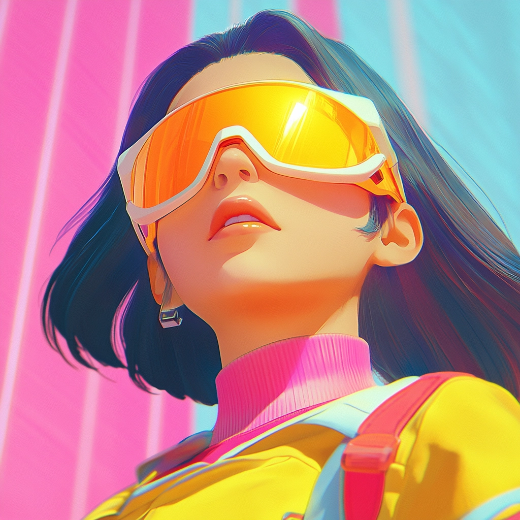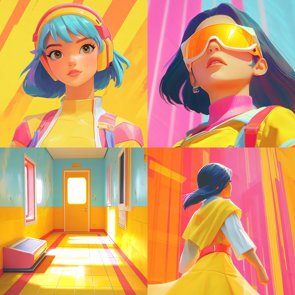 The lighting enhances shapes with a cool glow, emphasizing saturated yellows and pinks alongside striking blues. Strong color contrasts define spatial depth and clarity, with smooth, plastic-like textures conveying a polished, energetic feel.