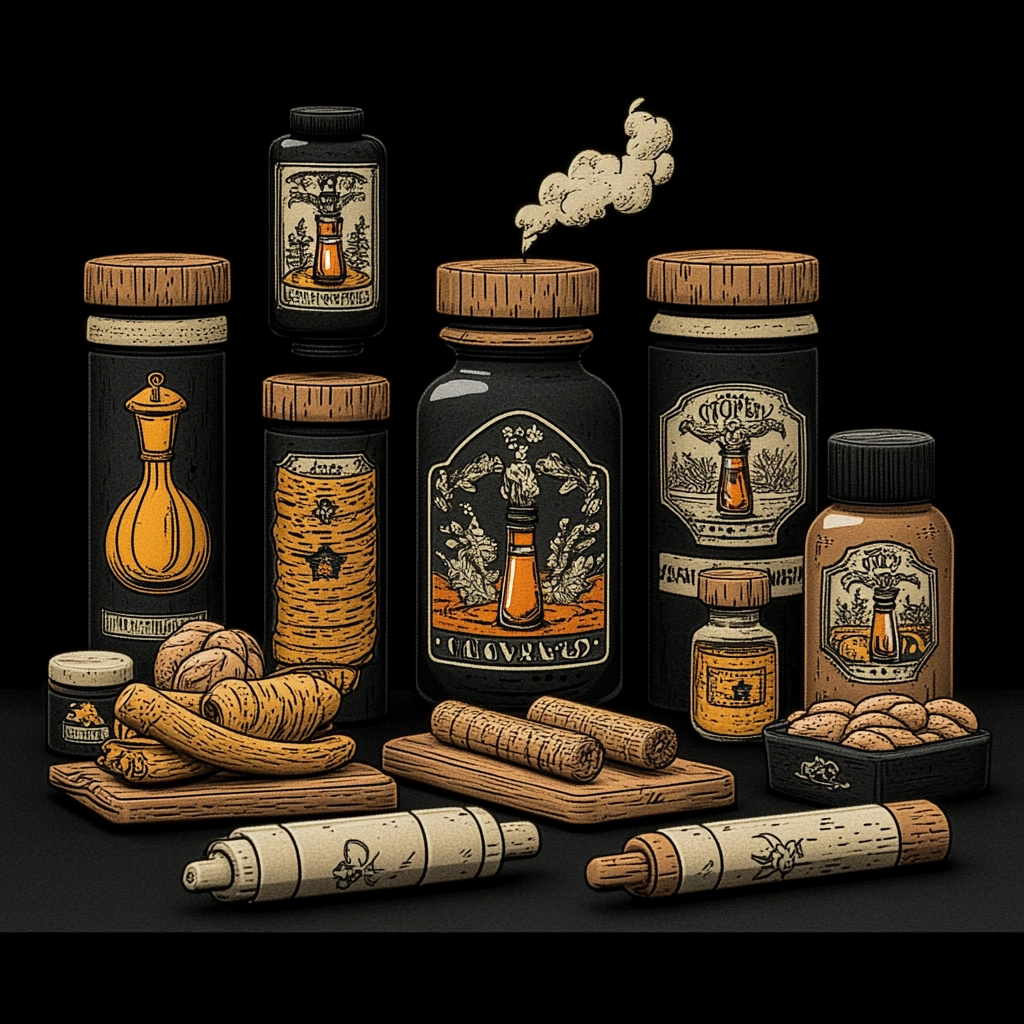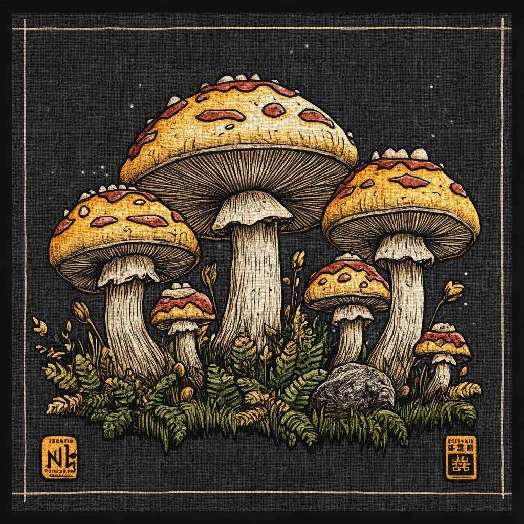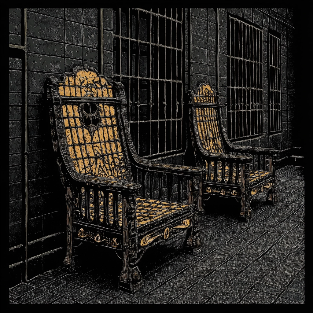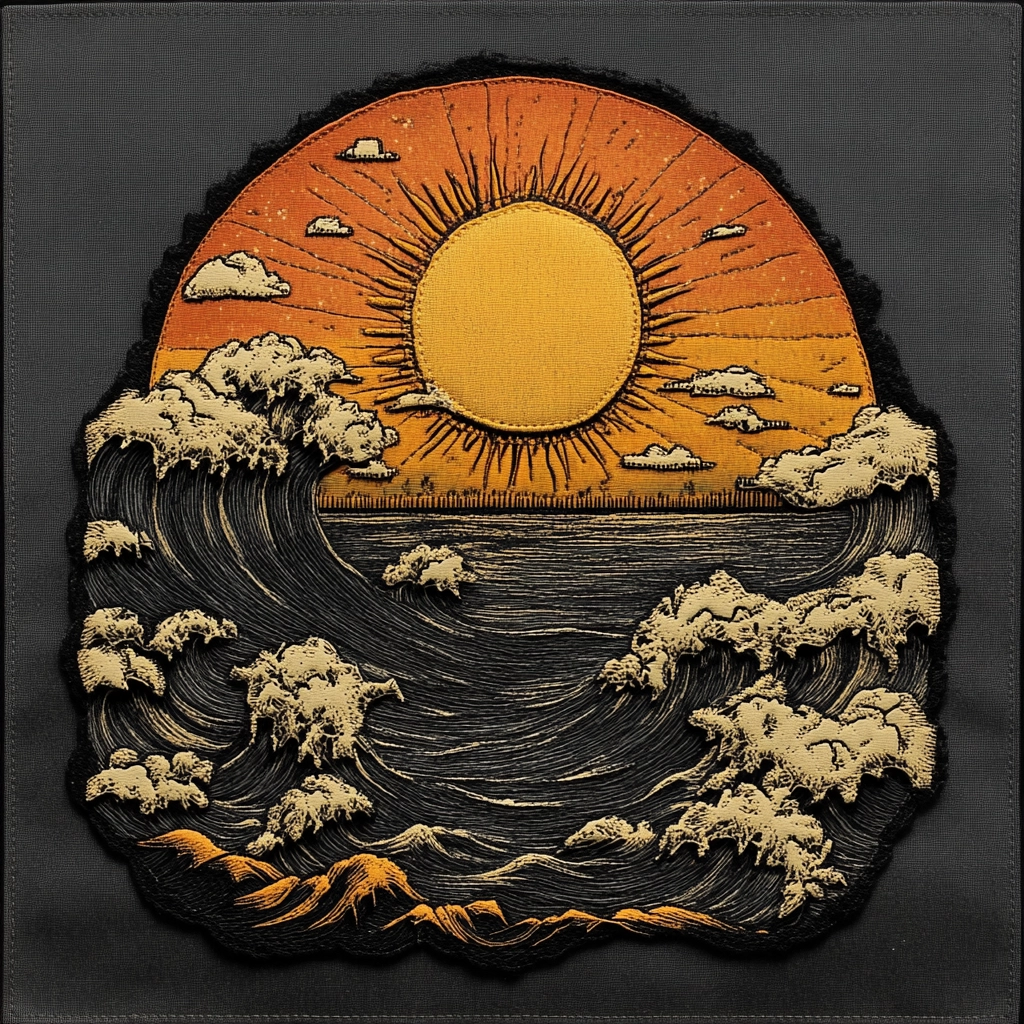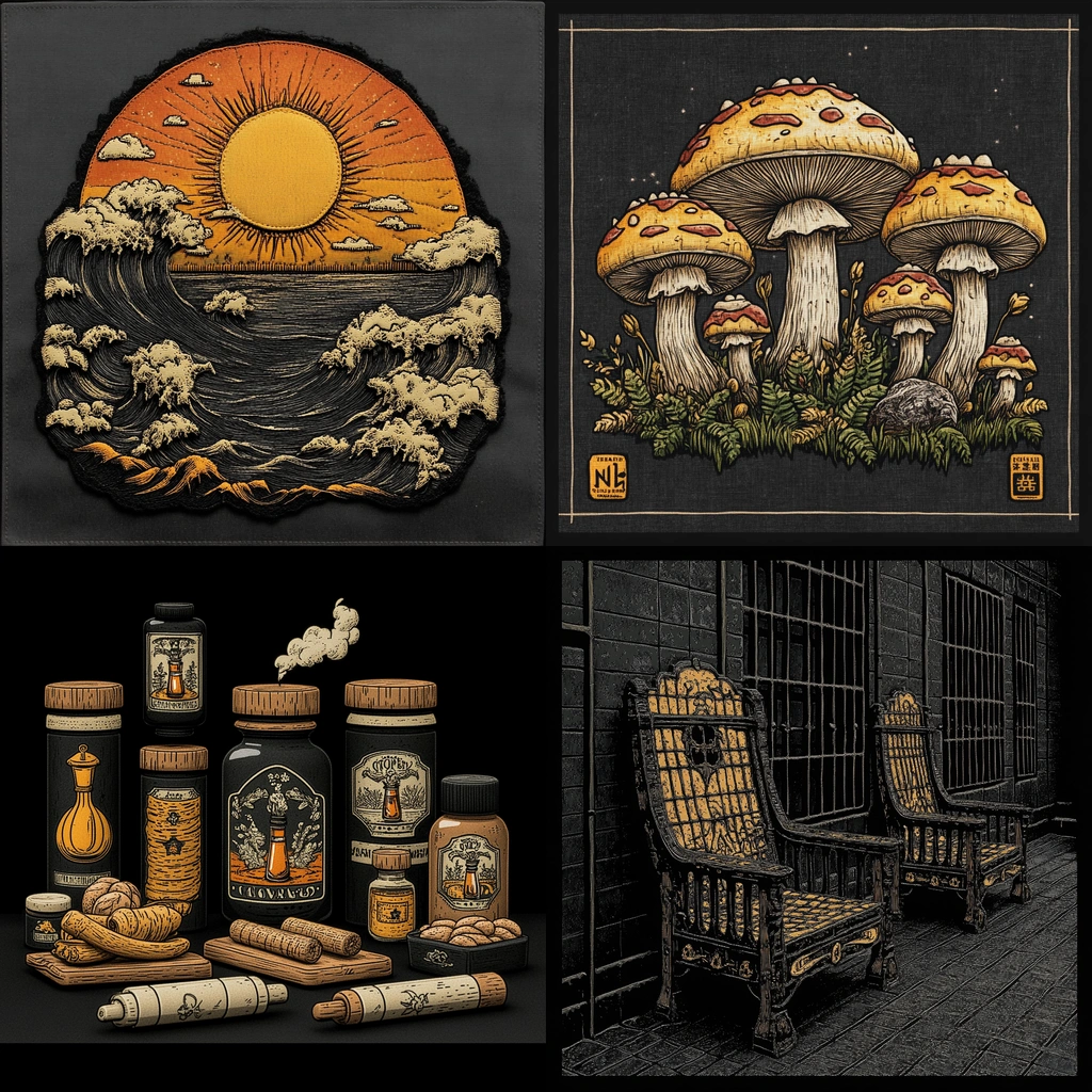 The vibrant orange and beige tones contrast sharply against the black backdrop, enhancing visual impact. The use of strong, defined lines and intricate textures gives the scenes a dynamic and tactile quality, with a sense of depth achieved through layered compositions.