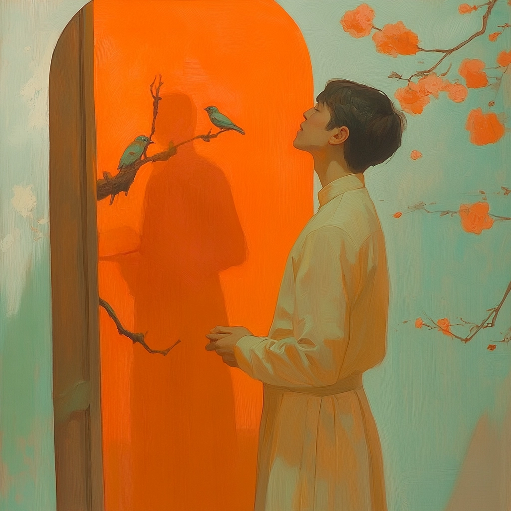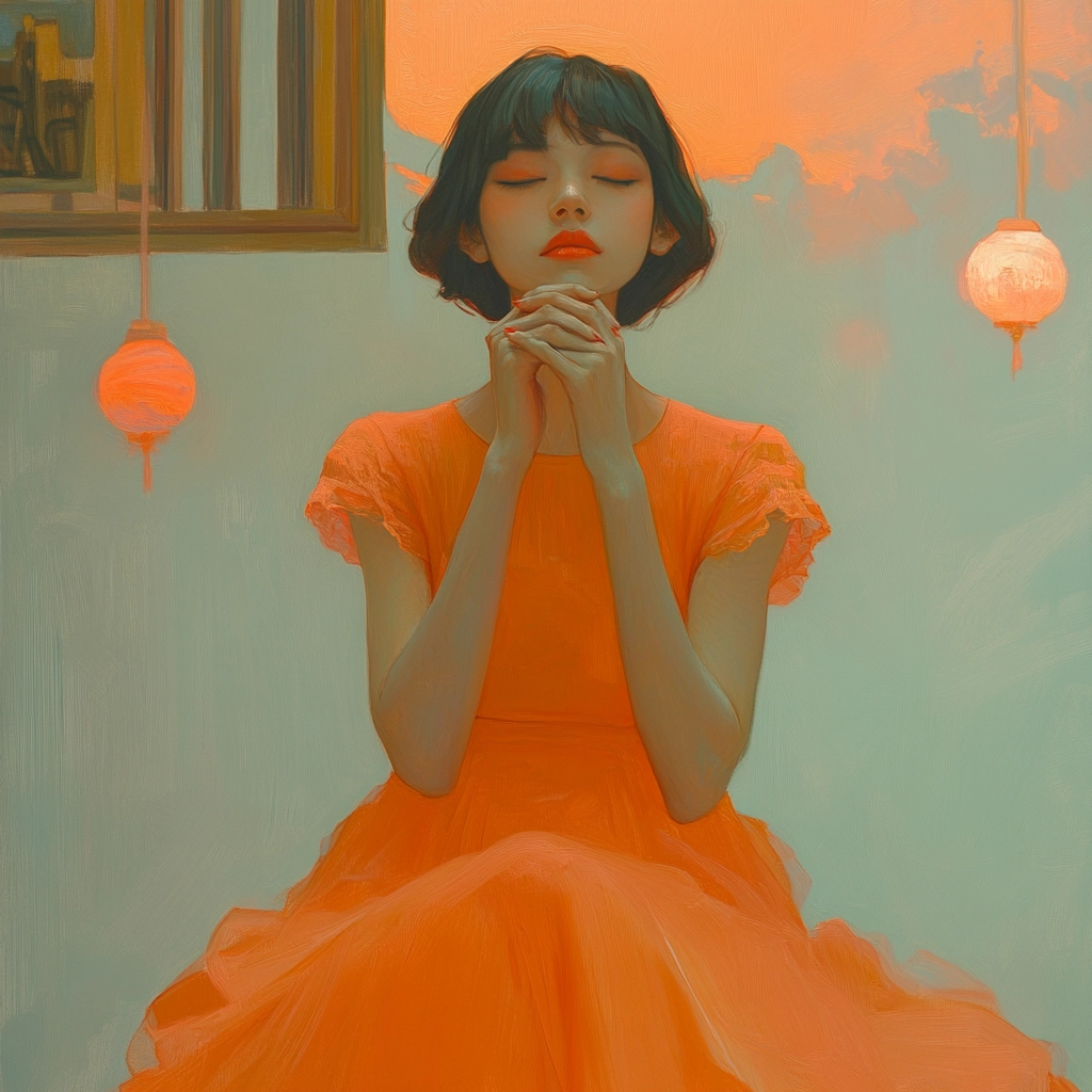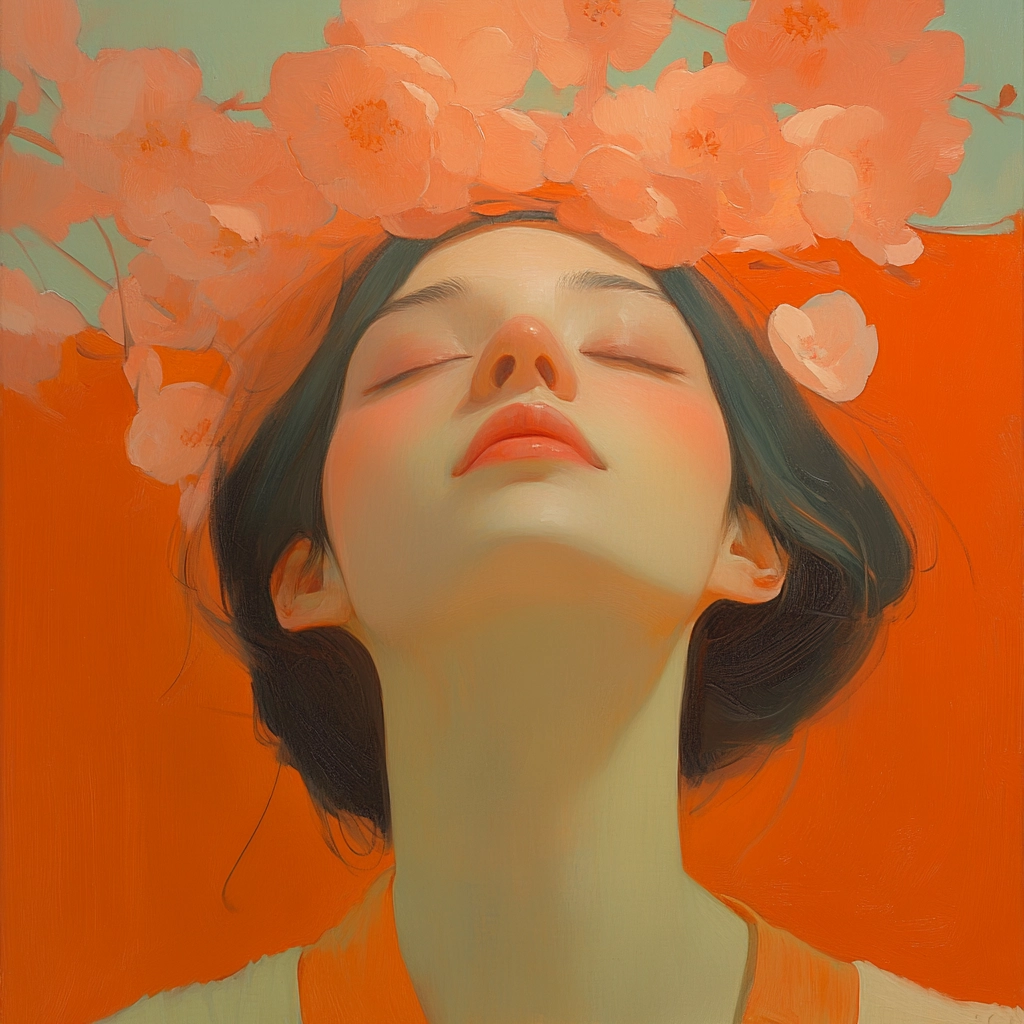 The use of lighting creates a soft-focus effect, highlighting the vibrancy of the orange and the delicate beige tones. The spatial sense is intimate, with smooth textures enhancing a gentle, cohesive feel throughout.