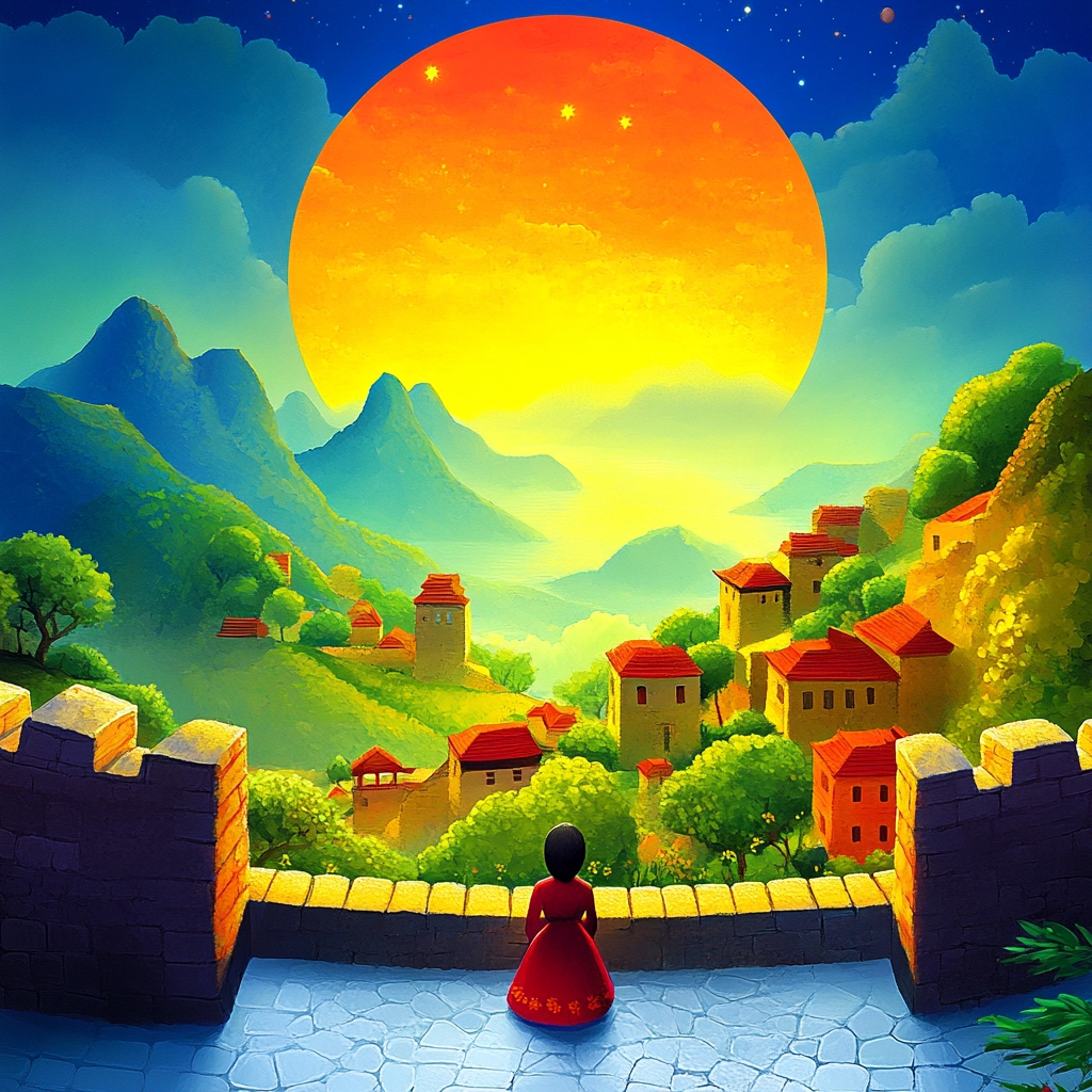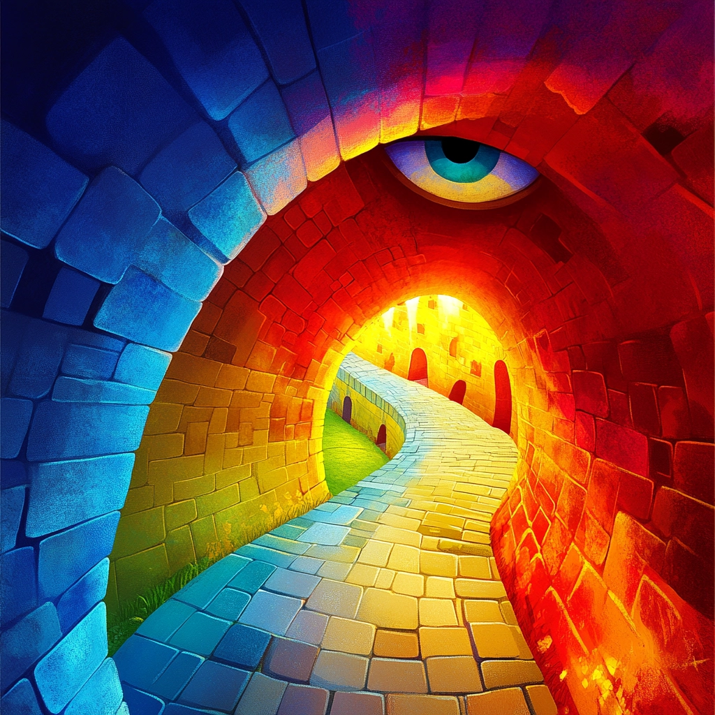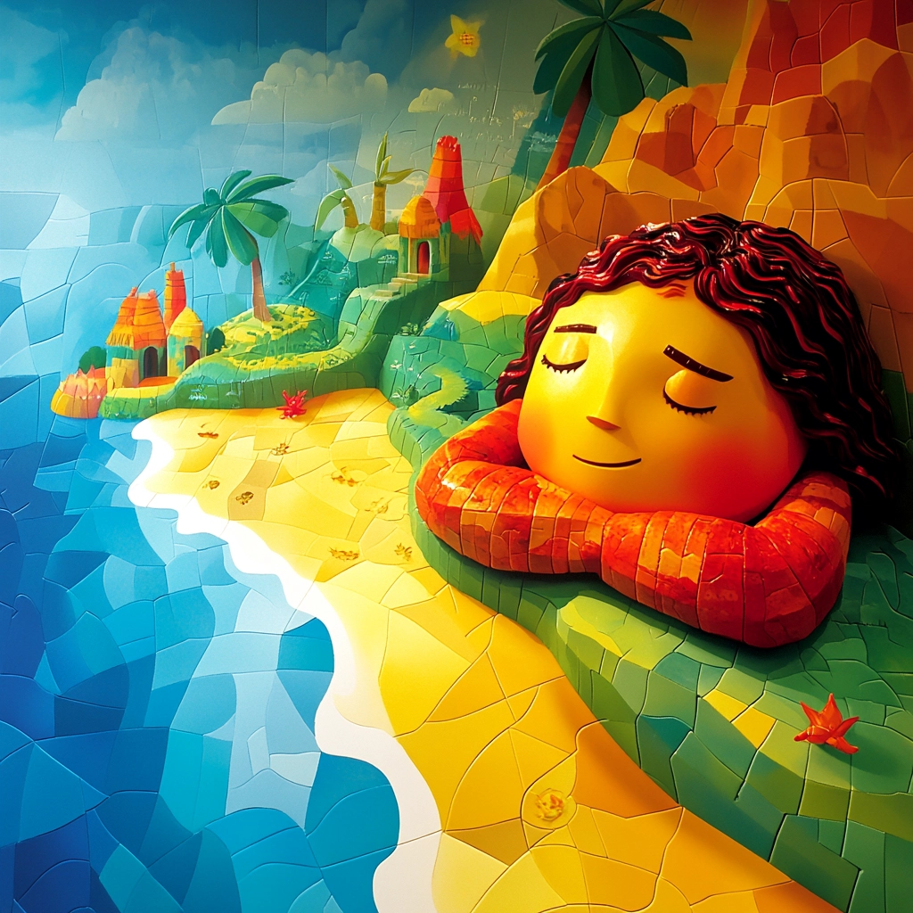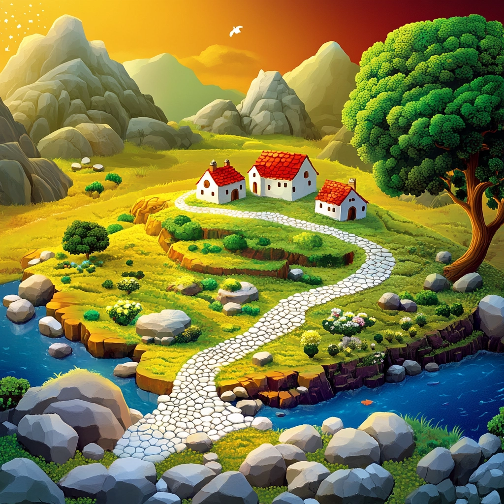 Lighting effects play with contrast between warm sunlight and cool shadows, bringing vibrancy to the colors, while clear spatial delineation offers a strong sense of dimension and playful texture in surfaces.