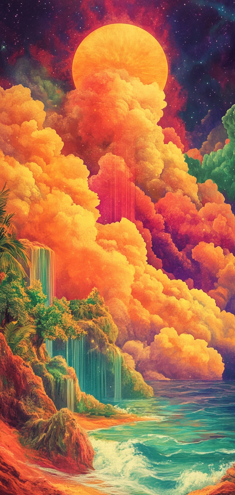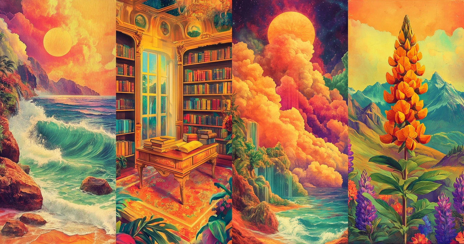 Bold use of lighting highlights depth and enhances the brightness of the vibrant hues. Intricate textures bring a tactile sense to the scenes. Spatially dynamic composition gives a lively and immersive effect.