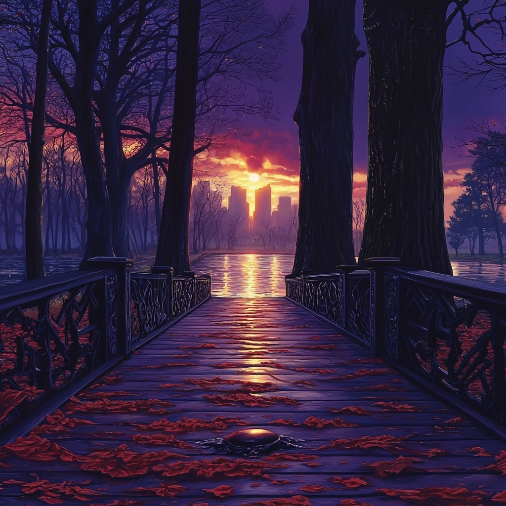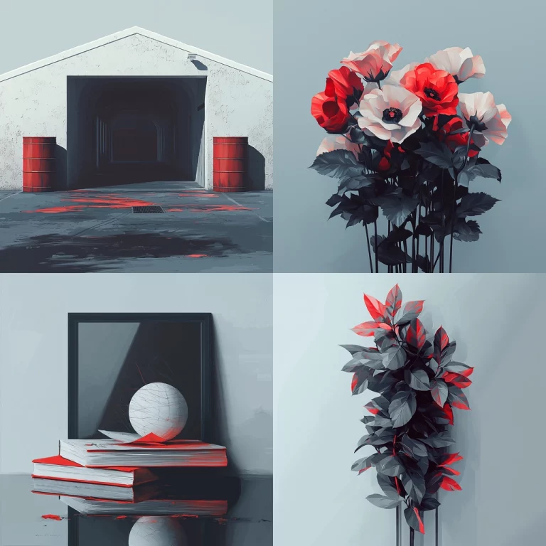 Dynamic lighting captures the transition between light and dark, with intense colors creating a dramatic contrast. The spatial arrangement enhances depth, while textures vary from smooth to sharply defined, allowing for a realistic depiction of natural and urban settings.