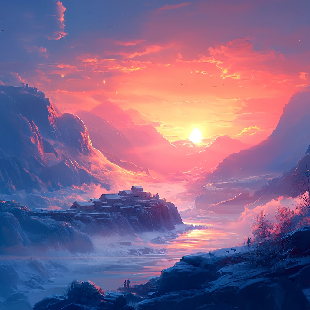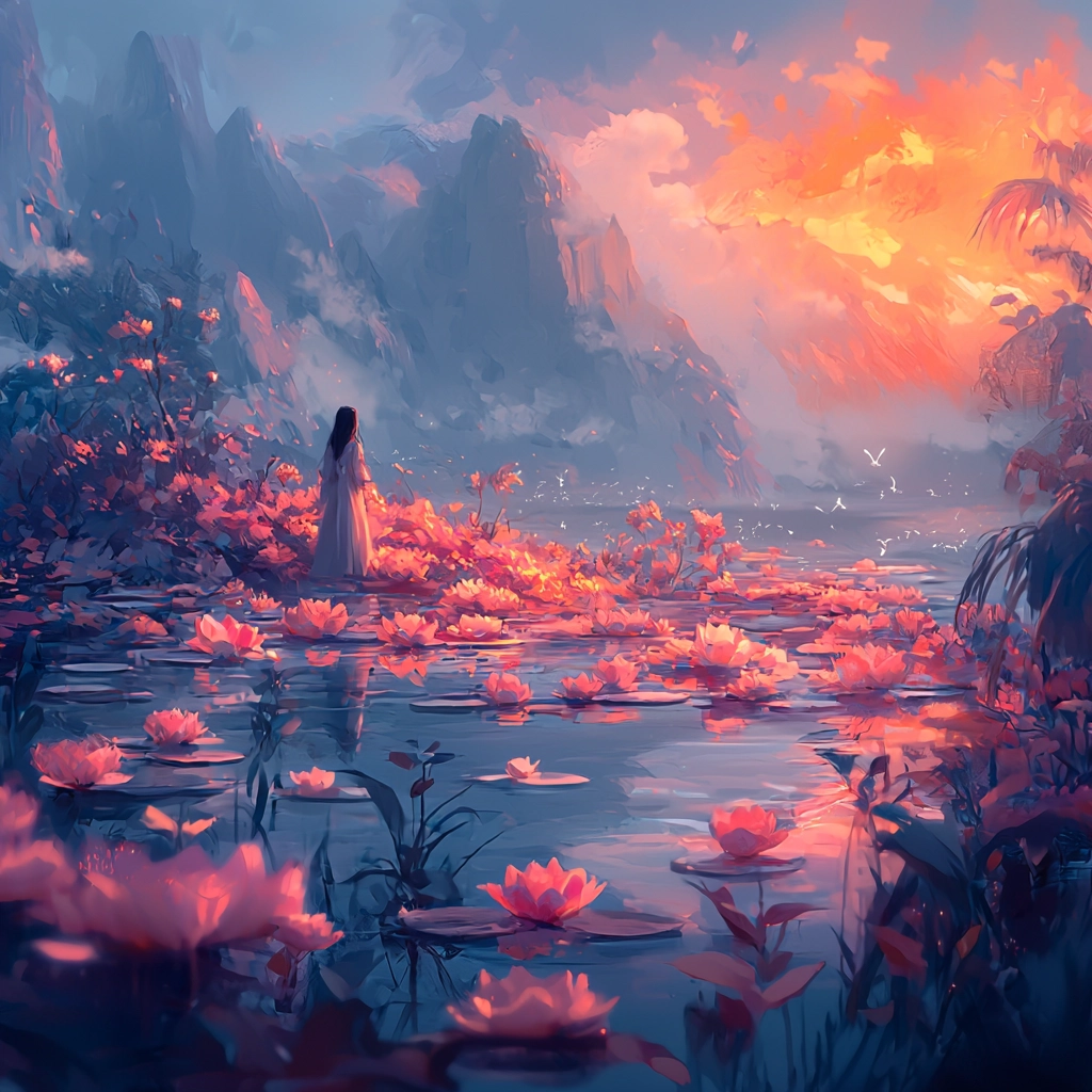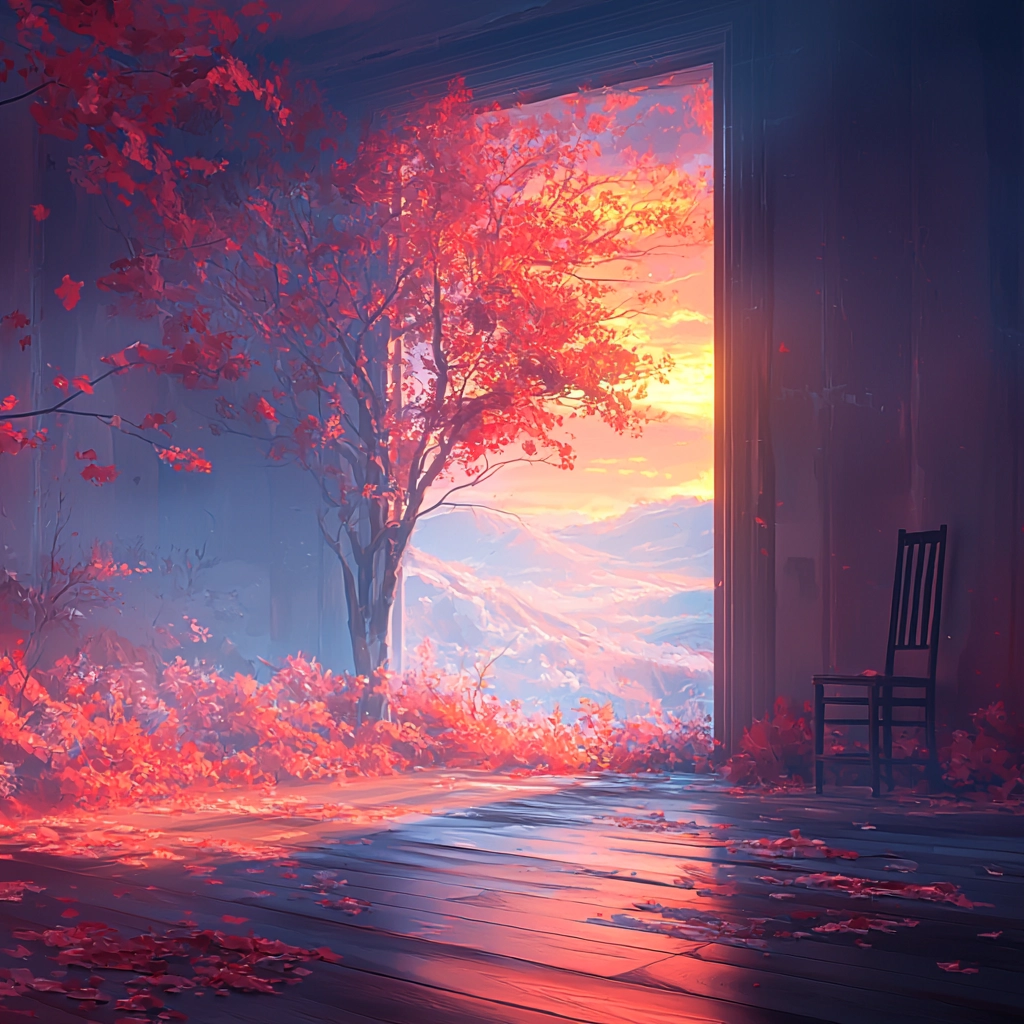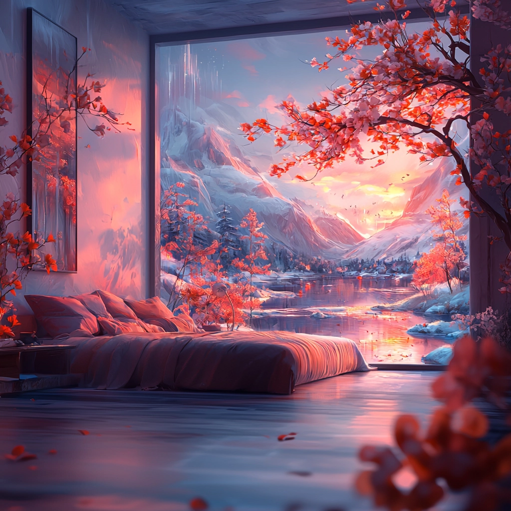 The dynamic use of light captures the interplay between vibrant orange hues and softer blue and pink shades, establishing a compelling spatial depth. Textures shift from soft blurs to sharp focus, enhancing the visual narrative.