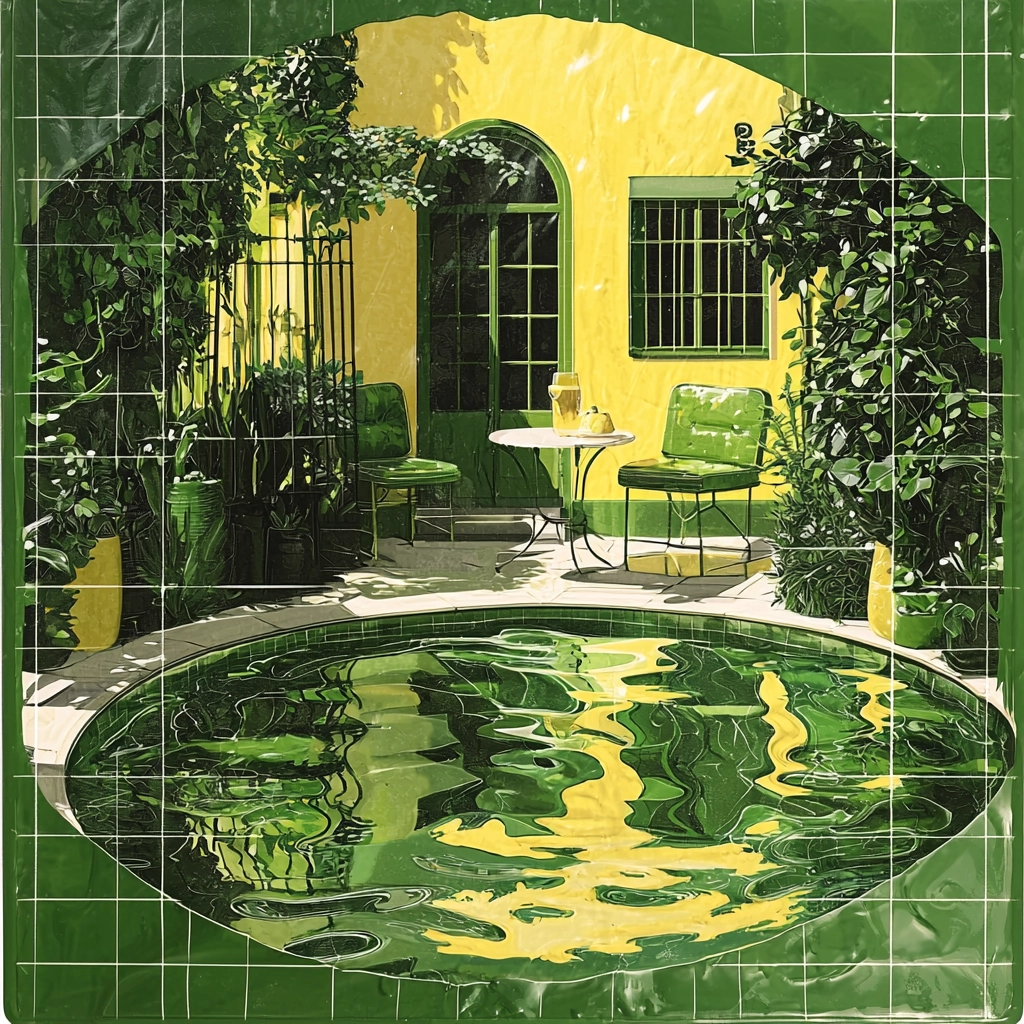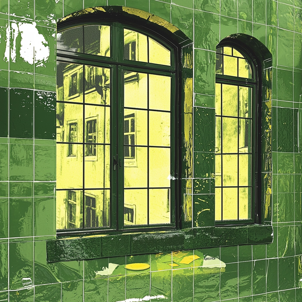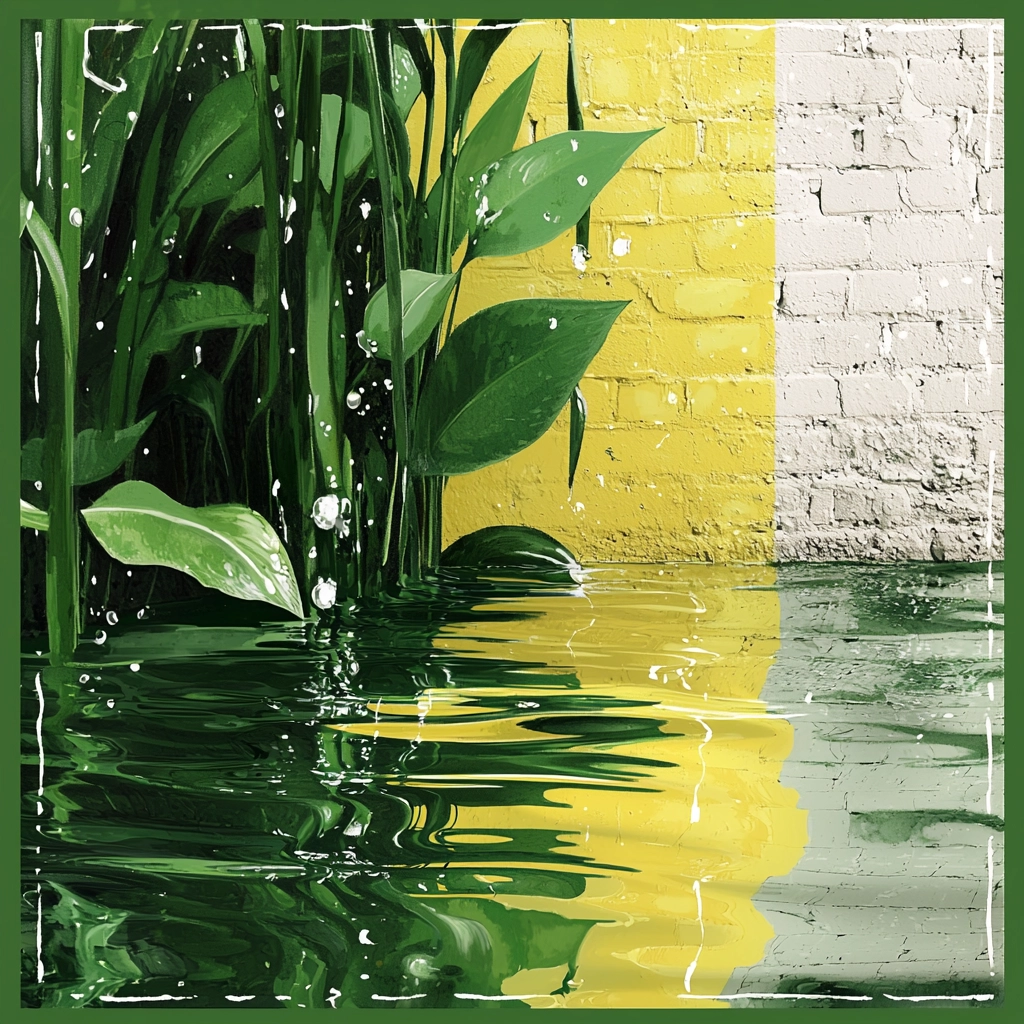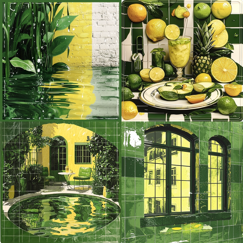 The piece uses strong lighting to enhance the vividness of the colors, especially yellows and greens, producing a strong spatial impression. The textures are evocative of organic and manufactured surfaces interacting within a structured format.