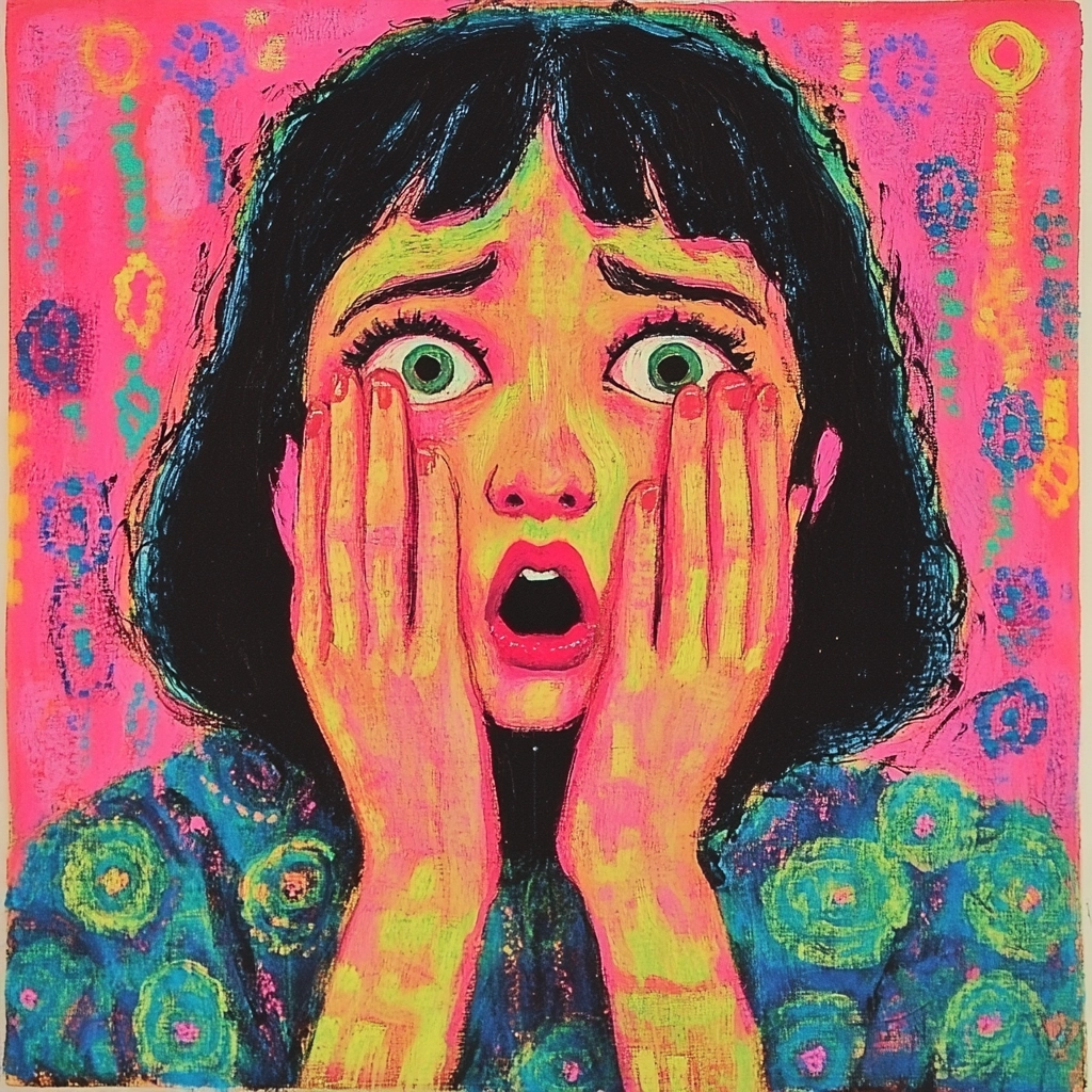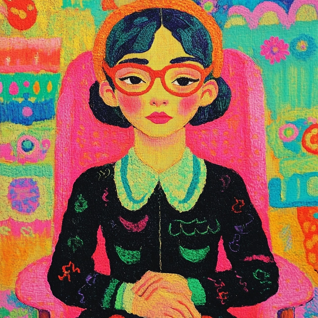 Bright, saturated colors dominate with strong contrasts and detailed texture work, combining controlled brushstrokes and layered color fields for a bold and dynamic visual structure.