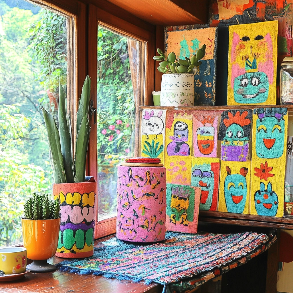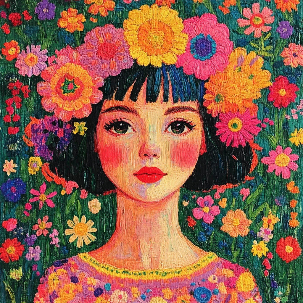The lighting is even, enhancing vivid colors without shadows, emphasizing the flatness and texture of the brushwork. Colors are applied in solid blocks with expressive surface textures that create depth through layering. Spatial sense is shallow, with compressed backgrounds and foregrounds creating a decorative, pattern-like quality.