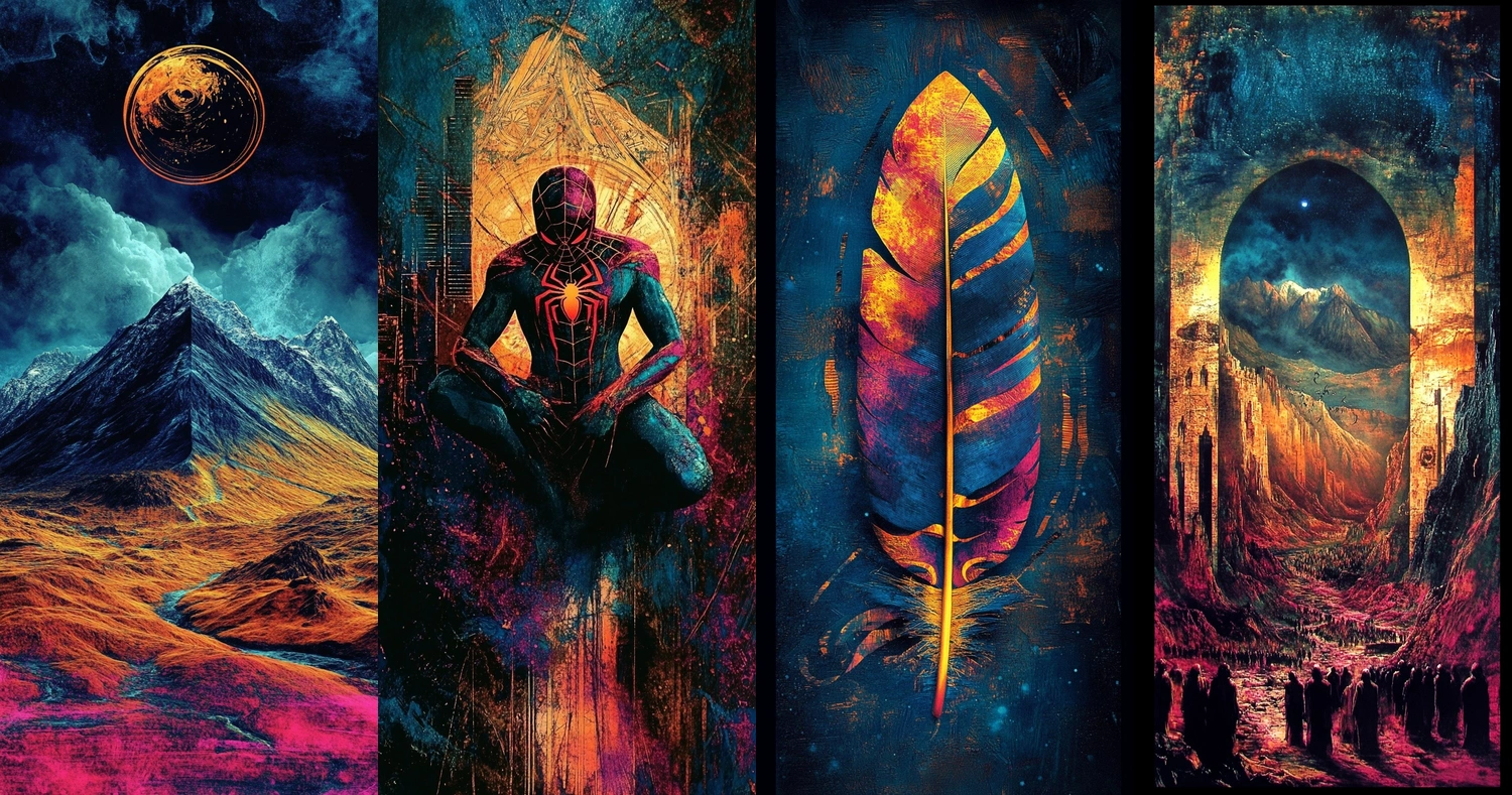 The use of vibrant, contrasting colors creates dynamic tension, while strong textures evoke a tactile quality. Dynamic lighting emphasizes depth and highlights bold forms throughout the composition.