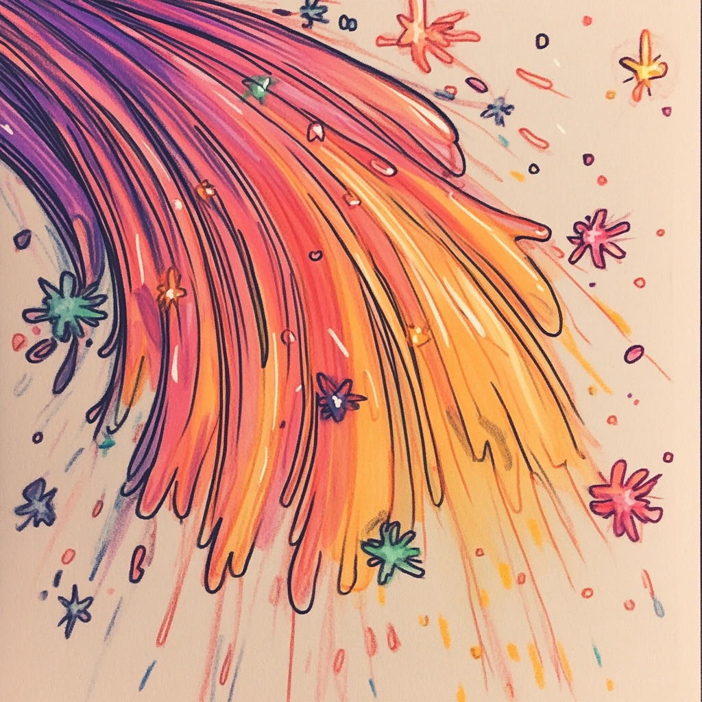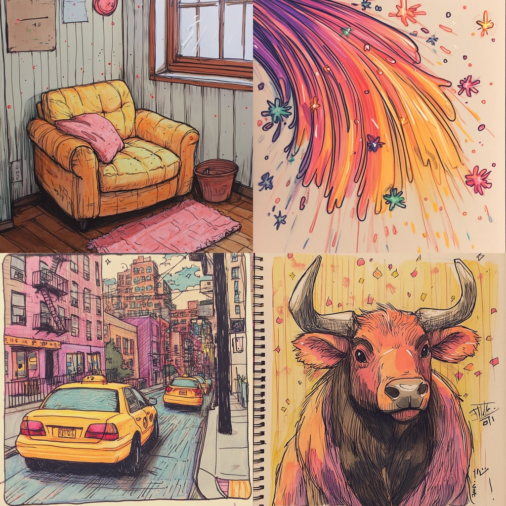 Strong, vibrant colors combined with vivid detailing, creating a lively aesthetic. The lighting emphasizes depth and form, while the texture suggests tangible surfaces. Spatial arrangements create a rich, layered visual experience.