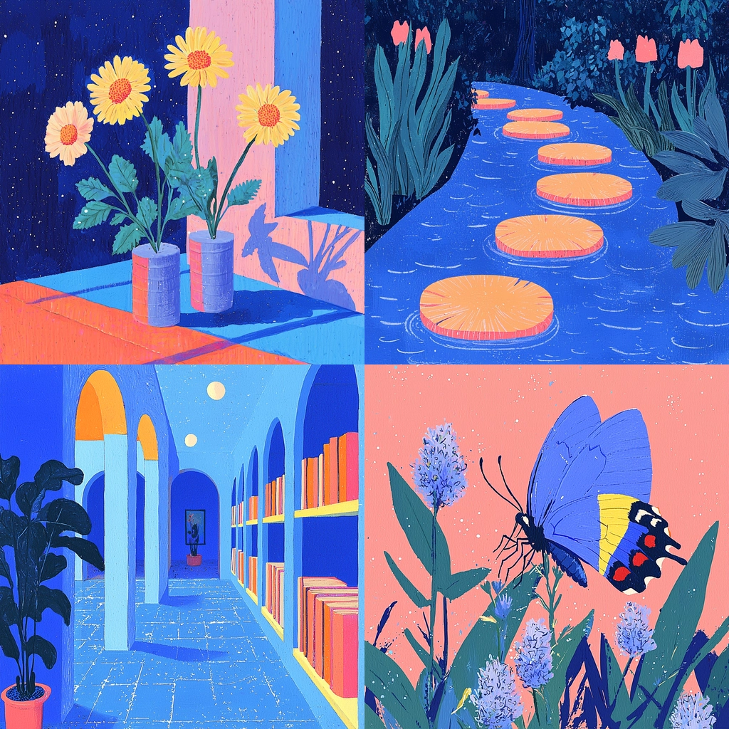 The lighting effects create crisp shadows that define spatial depth, while the bold color contrasts enhance visual impact. The textured brushstrokes and fine patterns add a tactile quality to the scenes. The composition leads the eye through each segment harmoniously.