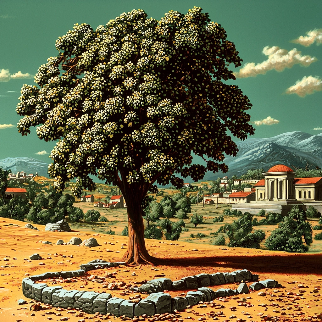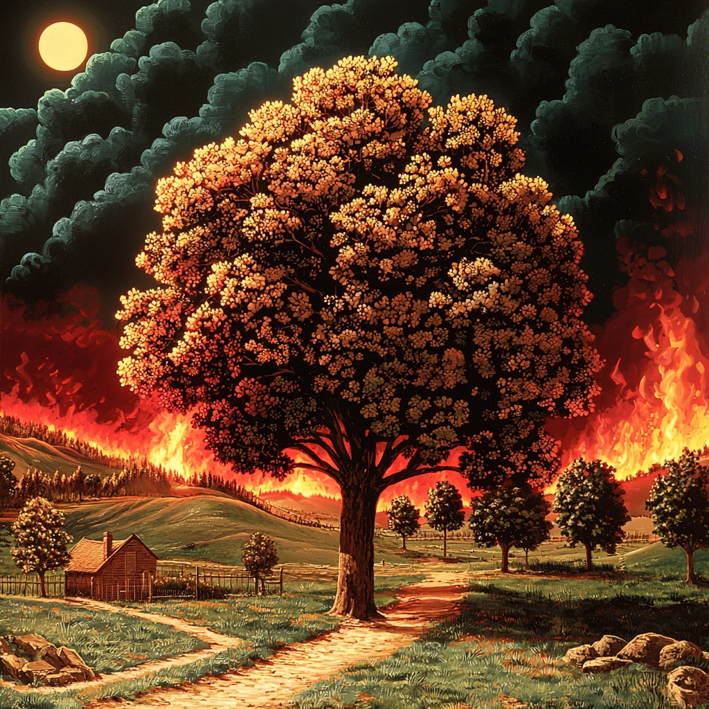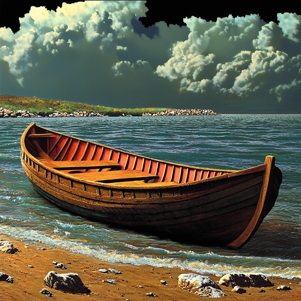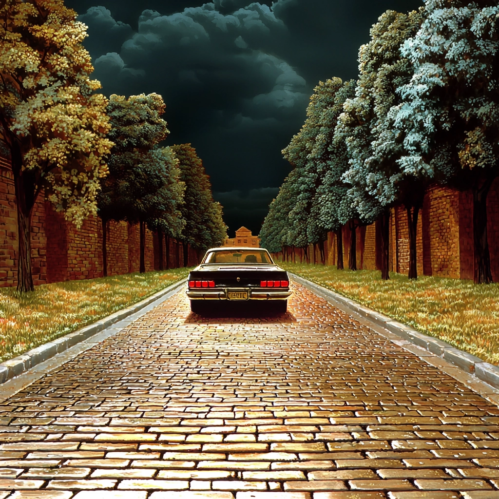 The lighting enhances the depth between foreground and background, defining crisp textures and contrasts. Rich, saturated colors create a dynamic spatial sense with textured surfaces that impart a tangible quality to the scene.